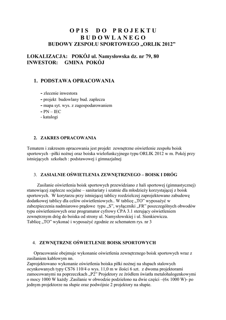 OPIS DO PROJEKTU BUDOWLANEGO BUDOWY ZESPOŁU SPORTOWEGO „ORLIK 2012” LOKALIZACJA: POKÓJ ul. Namysłowska dz. nr 79, 80 INWESTOR: GMINA POKÓJ 1. PODSTAWA OPRACOWANIA - zlecenie inwestora - projekt budowlany bud. zaplecza - mapa syt. wys. z zagospodarowaniem - PN – IEC - katalogi 2. ZAKRES OPRACOWANIA Tematem i zakresem opracowania jest projekt zewnętrzne oświetlenie zespołu boisk sportowych –piłki noŜnej oraz boiska wielofunkcyjnego typu ORLIK 2012 w m. Pokój przy istniejących szkołach : podstawowej i gimnazjalnej 3. ZASIALNIE OŚWIETLENIA ZEWNĘTRZNEGO – BOISK I DRÓG Zasilanie oświetlenia boisk sportowych przewidziano z hali sportowej (gimnastycznej) stanowiącej zaplecze socjalne – sanitariaty i szatnie dla młodzieŜy korzystającej z boisk sportowych. W korytarzu przy istniejącej tablicy rozdzielczej zaprojektowano zabudowę dodatkowej tablicy dla celów oświetleniowych.. W tablicę „TO” wyposaŜyć w zabezpieczenia nadmiarowo prądowe typu „S”, wyłączniki „FR” poszczególnych obwodów typu oświetleniowych oraz programator cyfrowy CPA 3.1 sterujący oświetleniem zewnętrznym dróg do boiska od strony ul. Namysłowskiej i ul. Sienkiewicza. Tablicę „TO” wykonać i wyposaŜyć zgodnie ze schematem rys. nr 3 4. ZEWNĘTRZNE OŚWIETLENIE BOISK SPORTOWYCH Opracowanie obejmuje wykonanie oświetlenia zewnętrznego boisk sportowych wraz z zasilaniem kablowym nn. Zaprojektowano wykonanie oświetlenia boiska piłki noŜnej na słupach stalowych ocynkowanych typy CS76 110/4 o wys. 11,0 m w ilości 6 szt. z dwoma projektorami zamocowanymi na poprzeczkach „P2” Projektory ze źródłem światła metalohalogenkowymi o mocy 1000 W kaŜdy .Zasilanie w obwodzie podzielono na dwie części –(6x 1000 W)- po jednym projektorze na słupie oraz podwójnie 2 projektory na słupie. Odrębnie wykonano zasilanie i oświetlenie boiska wielofunkcyjnego na 4-ch słupach o wys. 9,0 m równieŜ z dwoma projektorami zamocowanymi do poprzecznika P2 na słupie – projektory metalohalogenkowe o mocy 500 W kaŜdy. Sterowanie oświetleniem odbywa się z tablicy „TO” , z której zasilono dodatkowo oświetlenie dróg do boisk sportowych. Oświetlenie na słupach typu parkowego o wys. do 4,0 m o oprawami wandalodpornymi typu OCP-70 PC/II ze źródłem światła sodowym o mocy 70 W. We wnękach wszystkich słupów oświetleniowych zabudowano tabliczki bezpiecznikowe typu TZKo TH35 z zabezpieczeniami nadmiarowo prądowymi indywidualnie dla kaŜdej oprawy typu S301 C. Wszystkie słupy oświetleniowe będą ustawione ui przykręcone do prefabrykowanych fundamentów „FB”. Usytuowanie opraw przedstawiono na planie sytuacyjnym rys. nr 1 natomiast na schemacie ideowym nr 2 podano wszystkie parametry sieci kablowych nn oraz wyposaŜenie słupów oświetleniowych. 5. OCHRONA PRZECIWPORAśENIOWA I POŁĄCZENIA WYRÓWNAWCZE Wewnętrzne instalacje zaprojektowano przewodami z Ŝyłą ochronną PE. Do uziemionej szyny PEN (w złączu pomiarowym) podłączyć wewnętrzne instalacje wodne, brodziki natrysków zgodnie z wymogami PN-IEC 60 364-4-41 Układ sieci ZE typu TN-C Wewnętrzną instalację zaprojektowano w układzie TN--S. Oświetlenie zewnętrzne TN-C. Ochronę podstawową stanowi izolacja przewodów i urządzeń elektrycznych. Jako ochroną dodatkową zastosowano wyłączniki róŜnicowo – prądowe o prądzie wyłączalnym dI < 0,03A W czasie wyłączeniowym tw < 0,2 sek przy napięciu dotykowym dU < 50 V. Końcowe słupy oświetleniowe dodatkowo uziemić wraz z przewodem neutralnym „N” i „PE” poprzez wykonanie uziomu punktowego o oporności uziemienia R < 30 Om WYKONANA INSTALACJA ZGODNIE Z NINIEJSZYM OPRACOWANIEM SPEŁNIA WYMOGI SAMOCZYNNEGO WYŁĄCZENIA SZYBKIEGO