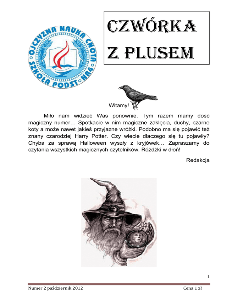 Czwórka z plusem Witamy! Miło nam widzieć Was ponownie. Tym razem mamy dość magiczny numer… Spotkacie w nim magiczne zaklęcia, duchy, czarne koty a może nawet jakieś przyjazne wróżki. Podobno ma się pojawić też znany czarodziej Harry Potter. Czy wiecie dlaczego się tu pojawiły? Chyba za sprawą Halloween wyszły z kryjówek… Zapraszamy do czytania wszystkich magicznych czytelników. Różdżki w dłoń! Redakcja 1 Numer 2 październik 2012 Cena 1 zł Uroczystość Święta Zmarłych wywodzi się głównie z czci oddawanej męczennikom, którzy oddali swoje życie dla wiary w Chrystusa, a o których nie było mowy w martyrologiach, ani w kanonie Mszy Św. Pierwotnie święto to obchodzono 13 maja. Papież Grzegorz III w 731 przeniósł tę uroczystość z 13 maja na dzień 1 listopada. Powodem były prawdopodobnie trudności z wyżywieniem rzesz pielgrzymów przybywających do Rzymu na wiosnę. W 837 roku Grzegorz IV rozporządził, aby odtąd 1 listopada był dniem poświęconym pamięci nie tylko męczenników, ale wszystkich świętych Kościoła katolickiego. Współcześnie Święto Zmarłych jest dniem wolnym od pracy, ludzie tego dnia odwiedzają cmentarze, aby przystroić groby kwiatami , zapalić znicze i pomodlić się za dusze bliskich nam zmarłych. Święto Zmarłych w Meksyku Dzień Zmarłych, Día de los Muertos – najstarsze religijno-etniczne święto meksykańskie, czczące pozagrobowe życie zmarłych. Obchodzone jest 1 i 2 listopada w powiązaniu z katolickimi świętami Zaduszek (Día de los Fieles Difuntos) i Wszystkich Świętych (Todos los Santos), jednak wywodzi się z tradycji o wieku szacowanym na 3000 lat. Jest obchodzone głównie w Meksyku i Ameryce Centralnej, lecz zakorzeniło się również w wielu miejscowościach w USA. Symbolami tego swięta w Meksyku są np. ludzkie czaszki (calaveras de dulce), chleb zmarłych (pan de muerto) oraz aksamitka znana jako kwiat zmarłych (flor de muertos). 2 Numer 2 październik 2012 Cena 1 zł Halloween nadchodzi… Halloween to wigilia Wszystkich Świętych. Prawdopodobnie Halloween wywodzi się z celtyckiego obrządku Samhain. Około 2 tysiące lat temu w Anglii, Irlandii, Szkocji, Walii i północnej Francji właśnie tego dnia (31 października) żegnano lato, witano zimę oraz obchodzono święto zmarłych. Druidzi wierzyli, że podczas tego dnia zacierała się granica między światem umarłych, a światem ludzi żyjących, i co z tego wynikało duchom, zarówno złym jak i dobrym, łatwiej było się przedostać do świata żywych. Duchy przodków zapraszano do domów, witano się z nimi, złe duchy zaś odstraszano. Ważnym elementem obchodów Samhain było również palenie ognisk. Paląc chciano dodawać słońcu sił do walki z ciemnością i chłodem. Wokół ognisk odbywały się tańce. Symbolem święta Halloween były czarne stroje. To właśnie po to aby odstraszyć złe duchy ludzie przebierali się w dziwne stroje, zakładali maski a także ustawiali przed domami powycinane dynie. Czarownice w towarzystwie czarnych kotów przepowiadały przyszłość. W Polsce Halloween przyjęło się dopiero w latach 90., ale jego odpowiednikiem są Zaduszki. Z tego powodu święto to jest bardziej popularne wśród dzieci niż wśród dorosłych. 3 Numer 2 październik 2012 Cena 1 zł Okiem szóstoklasisty Warto przeczytać… ,,Harry Potter’’ Harry Potter jest to seria siedmiu książek, a w każdej nowe przygody Harry’ego i jego przyjaciół- Rona i Hermiony. Harry Potter i kamień filozoficzny Kiedy Harry jako jednoroczne dziecko przeżywa próbę zabicia przez najpotężniejszego czarnoksiężnika Lorda Voldemort’a giną jego rodzice. Chłopiec znaleziony przez Albusa Dumbledora zostaje przekazany swojej ciotce Petunii i wujowi o imieniu Vernon, którzy kłamią, że jego rodzice zginęli w wypadku samochodowym a blizna na jego czole to tylko pozostałość po tym dniu. W jego jedenaste urodziny Harry dowiaduje się, że jest czarodziejem i dostaje list o przyjęciu go do Szkoły Magii i Czarodziejstwa Hogwart , w której przeżywa wspaniałe przygody. Harry Potter I komnata tajemnic Mimo ostrzeżenia przez skrzata domowego, Zgredka, o grożącym mu niebezpieczeństwie, Harry wraca na drugi rok do Hogwartu. Wkrótce w szkole zaczyna dochodzić do ataków na uczniów z rodzin mugoli, a po szkole rozprzestrzenia się plotka o legendarnej, ukrytej w podziemiach Hogwartu Komnacie Tajemnic i zamieszkującym ją potworze. Komnatę może otworzyć tylko dziedzic Salazara Slytherina, jednego z założycieli szkoły. Harry, Ron i Hermiona trafiają na ślad sprawcy ataków. Wkrótce Hermiona zostaje zaatakowana, natomiast siostra Rona zostaje porwana do Komnaty Tajemnic. Harry Potter i więzień Azkabanu Harry ucieka od Dursley’ów po napompowaniu swojej przyszywanej ciotki Marge, potem dziwnym trafem natrafia na środek komunikacji czarodziejów Błędnego rycerza do Dziurawego Kotła i dowiaduje się, że świat czarodziejów zaabsorbowany jest wiadomością o ucieczce z Azkabanu, więzienia czarodziejów, groźnego mordercy i sługi Voldemorta, Syriusza Blacka. Opisaliśmy tylko trzy z siedmiu książek, a reszty dowiecie się czytając. Ta seria książek należy to tych, które czyta się po nocach, aż do ostatniej strony! 4 Numer 2 październik 2012 Cena 1 zł Halloween’owe Muffiny Składniki: 1 opakowanie (500 g) gotowej mieszanki do wypieku ciasta czekoladowego 1 opakowanie (500 g) gotowej mieszanki na lukier 3/4 szklanki pokruszonych ciasteczek czekoladowych 24 kwadratowe herbatniki Przygotowanie: Przygotowanie: 30 min | Gotowanie: 25 min 1. Upiec babeczki według instrukcji na opakowaniu. 2. Przygotować lukier i posmarować nim ostygnięte muffiny. 3. Ustawić herbatniki na górze każdej. Umieścić muffiny na tacy pokrytej zielonym papierem. Posypać pokruszonymi ciasteczkami czekoladowymi i herbatnikami. Można poustawiać papierowe duchy i nietoperze pomiędzy muffinami. 5