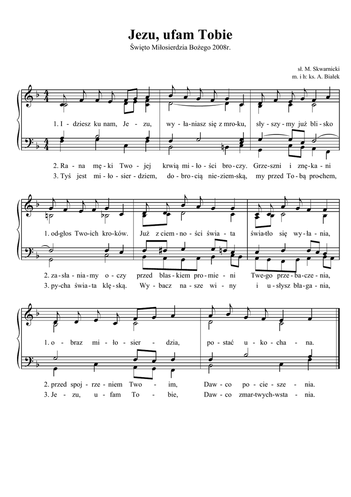 Jezu, ufam Tobie Święto Miłosierdzia Bożego 2008r. & b 44 œ˙j j j œ œ œj œj œ ˙ œ œ j œj œj œj œ œ œœ œ ˙ wy - ła - niasz się z mro-ku, sły - szy - my już bli - sko j j œ œ œj œœ œœ œœœ 1. I - dziesz ku nam, Je - zu, ˙œ ? b 44 œœ œœ œ sł. M. Skwarnicki m. i h: ks. A. Białek œ˙ ˙ œ n œ œœ œ œ œœ œ ˙ œ œ œ 2. Ra - na mę - ki Two - jej krwią mi - ło - ści bro - czy. Grze -szni i znę - ka - ni 3. Tyś jest mi - ło - sier - dziem, do - bro - cią nie - ziem-ską, my przed To - bą pro-chem, j & b œ œj œj œj œ œ n˙ b˙ ? j j j œ œj œ œœ œœ ˙ œœ œœ Już z ciem - no - ści świa - ta świa-tło się wy - ła - nia, 2. za - sła - nia - my o - czy 3. py-cha świa - ta klę - ską. przed blas - kiem pro - mie - ni Wy - bacz na - sze wi - ny Twe-go prze - ba - cze - nia, i u - słysz bła - ga - nia, œ˙ œ j œ˙ j œ 1. o - braz b j œœ 1. od-głos Two-ich kro- ków. ?b ˙ ˙ &b j j j œ œœ ˙ œ œ ˙ œ j œ œj œœ œ œ n œ œœ œ œ œ œ #œ œ œ œ mi - ło - sier - dzia, œ œ œ œ œ - im, bie, ˙œ œ œ 2. przed spoj - rze - niem Two 3. Je - zu, u - fam To œ œ œ œœ œœ œ œ œ œ œ j j œ˙ œ œj œj œ ˙ po - stać œ˙ Daw - co Daw - co u - ko - cha œ - na. po - cie - sze zmar-twych-wsta - nia. nia. ˙ œ œœ