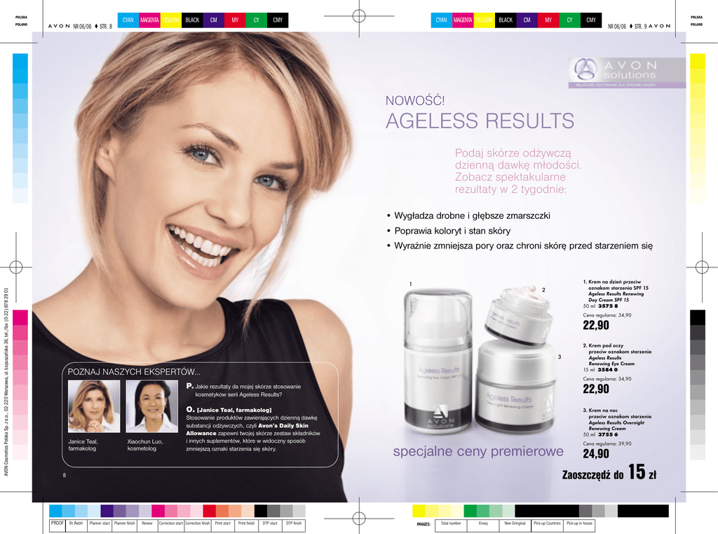 POLSKA NR 06/06 ♦ STR. 8 POLAND CYAN MAGENTA YELLOW BLACK CM MY CY CMY CYAN MAGENTA YELLOW BLACK CM MY CY CMY POLSKA NR 06/06 ♦ STR. 9 WŁAŚCIWE ODŻYWIANIE DLA ZDROWEJ SKÓRY NOWOŚĆ! AGELESS RESULTS Podaj skórze odżywczą dzienną dawkę młodości. Zobacz spektakularne rezultaty w 2 tygodnie: • Wygładza drobne i głębsze zmarszczki • Poprawia koloryt i stan skóry • Wyraźnie zmniejsza pory oraz chroni skórę przed starzeniem się 1. Krem na dzień przeciw oznakom starzenia SPF 15 Ageless Results Renewing Day Cream SPF 15 50 ml 3575 8 AVON Cosmetics Polska Sp. z o.o., 02-220 Warszawa, ul. Łopuszańska 36, tel./fax (0-22) 878 29 01 1 2 Cena regularna: 34,90 22,90 2. Krem pod oczy przeciw oznakom starzenia Ageless Results Renewing Eye Cream 15 ml 3584 0 3 POZNAJ NASZYCH EKSPERTÓW... Cena regularna: 34,90 P. Jakie rezultaty da mojej skórze stosowanie 22,90 kosmetyków serii Ageless Results? Janice Teal, farmakolog Xiaochun Luo, kosmetolog O. [Janice Teal, farmakolog] Stosowanie produktów zawierających dzienną dawkę substancji odżywczych, czyli Avon’s Daily Skin Allowance zapewni twojej skórze zestaw składników i innych suplementów, które w widoczny sposób zmniejszą oznaki starzenia się skóry. 3. Krem na noc przeciw oznakom starzenia Ageless Results Overnight Renewing Cream 50 ml 3755 6 specjalne ceny premierowe 24,90 Zaoszczędź do 8 PROOF Cena regularna: 39,90 In Avon Planner start Planner finish Review Correction start Correction finish Print start Print finish DTP start DTP finish IMAGES: Total number Envoy New Oringinal Pick-up Countries Pick-up in house 15 zł POLAND