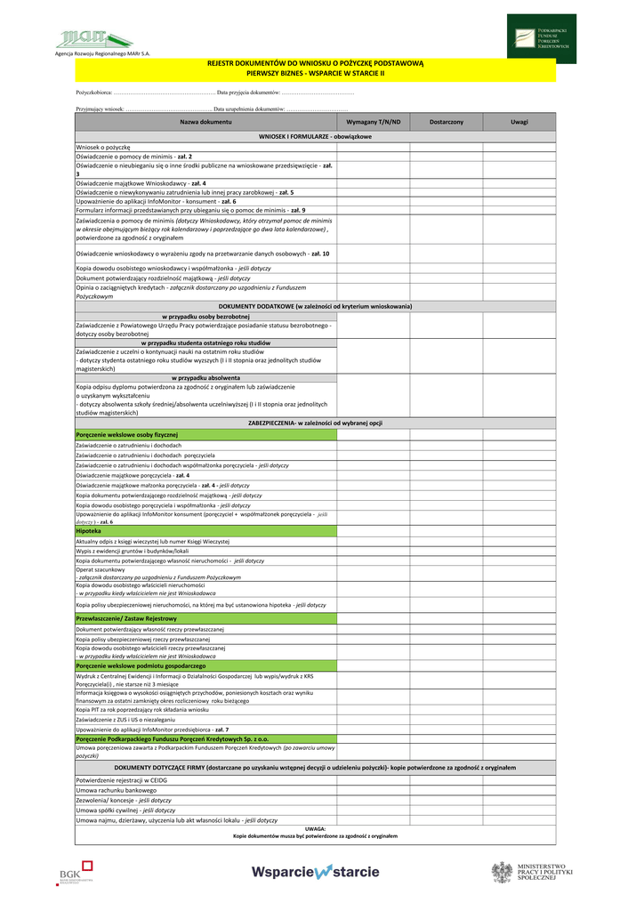 rejestr dokumentów do wniosku o pożyczkę podstawową pierwszy