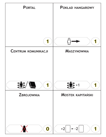 Portal Pokład hangarowy 1 Centrum 1 Maszynownia komunikacji 1 +1 Mostek Zbrojownia 0 +2 1 kapitański -2 1 Komory hibernacyjne Strefa skażona min. 3 min. 2 2 Kajuty 2 Laboratorium załogi min. 2 1 Kajuta Kapitana Do końca tury: Kiedy poświęcasz jednostki podczas realizacji zadań, to wracają one na twoją kartę rasy. 2 Centrum 1 medyczne Zamień miejscami 2 jednostki znajdujące się w sąsiednich pomieszczeniach. min. 2 1