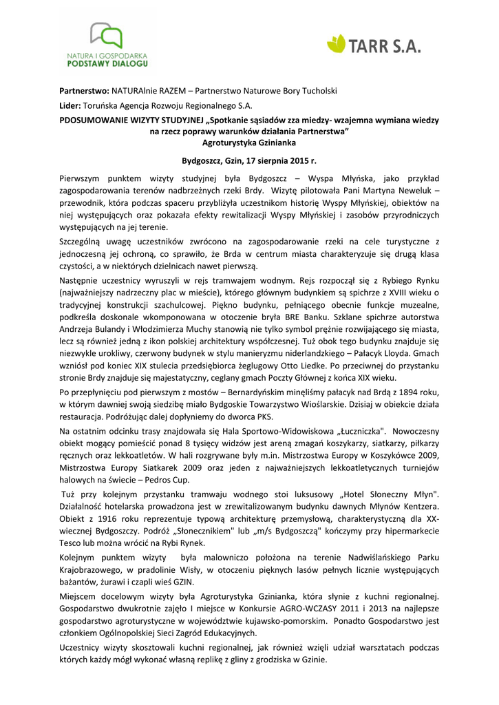 Partnerstwo: NATURAlnie RAZEM – Partnerstwo Naturowe Bory Tucholski Lider: Toruńska Agencja Rozwoju Regionalnego S.A. PDOSUMOWANIE WIZYTY STUDYJNEJ „Spotkanie sąsiadów zza miedzy- wzajemna wymiana wiedzy na rzecz poprawy warunków działania Partnerstwa” Agroturystyka Gzinianka Bydgoszcz, Gzin, 17 sierpnia 2015 r. Pierwszym punktem wizyty studyjnej była Bydgoszcz – Wyspa Młyńska, jako przykład zagospodarowania terenów nadbrzeżnych rzeki Brdy. Wizytę pilotowała Pani Martyna Neweluk – przewodnik, która podczas spaceru przybliżyła uczestnikom historię Wyspy Młyńskiej, obiektów na niej występujących oraz pokazała efekty rewitalizacji Wyspy Młyńskiej i zasobów przyrodniczych występujących na jej terenie. Szczególną uwagę uczestników zwrócono na zagospodarowanie rzeki na cele turystyczne z jednoczesną jej ochroną, co sprawiło, że Brda w centrum miasta charakteryzuje się drugą klasa czystości, a w niektórych dzielnicach nawet pierwszą. Następnie uczestnicy wyruszyli w rejs tramwajem wodnym. Rejs rozpoczął się z Rybiego Rynku (najważniejszy nadrzeczny plac w mieście), którego głównym budynkiem są spichrze z XVIII wieku o tradycyjnej konstrukcji szachulcowej. Piękno budynku, pełniącego obecnie funkcje muzealne, podkreśla doskonale wkomponowana w otoczenie bryła BRE Banku. Szklane spichrze autorstwa Andrzeja Bulandy i Włodzimierza Muchy stanowią nie tylko symbol prężnie rozwijającego się miasta, lecz są również jedną z ikon polskiej architektury współczesnej. Tuż obok tego budynku znajduje się niezwykle urokliwy, czerwony budynek w stylu manieryzmu niderlandzkiego – Pałacyk Lloyda. Gmach wzniósł pod koniec XIX stulecia przedsiębiorca żeglugowy Otto Liedke. Po przeciwnej do przystanku stronie Brdy znajduje się majestatyczny, ceglany gmach Poczty Głównej z końca XIX wieku. Po przepłynięciu pod pierwszym z mostów – Bernardyńskim minęliśmy pałacyk nad Brdą z 1894 roku, w którym dawniej swoją siedzibę miało Bydgoskie Towarzystwo Wioślarskie. Dzisiaj w obiekcie działa restauracja. Podróżując dalej dopłyniemy do dworca PKS. Na ostatnim odcinku trasy znajdowała się Hala Sportowo-Widowiskowa „Łuczniczka". Nowoczesny obiekt mogący pomieścić ponad 8 tysięcy widzów jest areną zmagań koszykarzy, siatkarzy, piłkarzy ręcznych oraz lekkoatletów. W hali rozgrywane były m.in. Mistrzostwa Europy w Koszykówce 2009, Mistrzostwa Europy Siatkarek 2009 oraz jeden z najważniejszych lekkoatletycznych turniejów halowych na świecie – Pedros Cup. Tuż przy kolejnym przystanku tramwaju wodnego stoi luksusowy „Hotel Słoneczny Młyn". Działalność hotelarska prowadzona jest w zrewitalizowanym budynku dawnych Młynów Kentzera. Obiekt z 1916 roku reprezentuje typową architekturę przemysłową, charakterystyczną dla XXwiecznej Bydgoszczy. Podróż „Słonecznikiem" lub „m/s Bydgoszczą" kończymy przy hipermarkecie Tesco lub można wrócić na Rybi Rynek. Kolejnym punktem wizyty była malowniczo położona na terenie Nadwiślańskiego Parku Krajobrazowego, w pradolinie Wisły, w otoczeniu pięknych lasów pełnych licznie występujących bażantów, żurawi i czapli wieś GZIN. Miejscem docelowym wizyty była Agroturystyka Gzinianka, która słynie z kuchni regionalnej. Gospodarstwo dwukrotnie zajęło I miejsce w Konkursie AGRO-WCZASY 2011 i 2013 na najlepsze gospodarstwo agroturystyczne w województwie kujawsko-pomorskim. Ponadto Gospodarstwo jest członkiem Ogólnopolskiej Sieci Zagród Edukacyjnych. Uczestnicy wizyty skosztowali kuchni regionalnej, jak również wzięli udział warsztatach podczas których każdy mógł wykonać własną replikę z gliny z grodziska w Gzinie. Właściciel opowiedział o swojej działalności, współpracy z lokalnymi producentami, mieszkańcami, która przyczynia się do sukcesu tego miejsca. Ponadto goście zostali uraczeni opowieściami i legendami nt. kultury łużyckiej. Gzin zbadany przez archeologów objawił niezwykle ciekawą i bogatą historię miejscowości. Grodzisko w Gzinie łączone jest z kulturą łużycką. Jak wykazały badania, gród funkcjonował w schyłkowym okresie halsztackim i wczesnym okresie lateńskim ( ok. 500-300 lat p.n.e). W obrębie majdanu (wnętrza grodziska) odkryto 61 jam, niektóre z nich sięgają 3-5 m głębokości i zawierają szczątki ludzkie świadczące jednoznacznie, że w grodzie uprawiano kanibalizm kultowy. Wokół grodu w Gzinie (w jego najbliższym sąsiedztwie i dalszej okolicy) gromadziło się intensywne osadnictwo łużycko-pomorskie. Gród był centrum kultowym, w którym mieszkańcy okolicznych osad (razem z mieszkańcami grodu) zbierali się na rytualne obrzędy. Zabudowa majdanu z drewnianymi domami ulokowana była pod wałem, środek grodu pozostawał pusty. Dawało to doskonałą możliwość obrony na wypadek ataku, a ogromny prostokątny plac (180 m długości) był idealnym miejscem, gdzie mogły odbywać się zgromadzenia i obrzędy. Fakt, że Gzin był grodem kultowym obecnie potwierdzili badacze zajmujący się kulturą łużycką. Do dyspozycji uczestników w trakcie całej wizyty studyjnej pozostawali także eksperci: p. Wojciech Cetkowski, specjalista architekt oraz ds. rewitalizacji dróg wodnych, p. Anna Kannenberg , specjalistka ds. ochrony i kształtowania krajobrazu oraz p. Piotr Józefiak ekspert ds. obszarów Natura 2000. Wizytę studyjną „Odkrywcy NATURAlnych skarbów – Geocashing i inne pomysły na nowoczesną promocję” zorganizowano w ramach projektu Natura i gospodarka – podstawy dialogu, realizowanego przez Generalną Dyrekcję Ochrony Środowiska. Organizatorem wizyty była Toruńska Agencja Rozwoju Regionalnego S.A., będąca liderem Partnerstwa Naturowego NATURAlnie RAZEM, które swoją działalnością obejmuje obszar Borów Tucholskich (PLB 220009). Projekt współfinansowany przez Unię Europejską ze środków Europejskiego Funduszu Rozwoju Regionalnego w