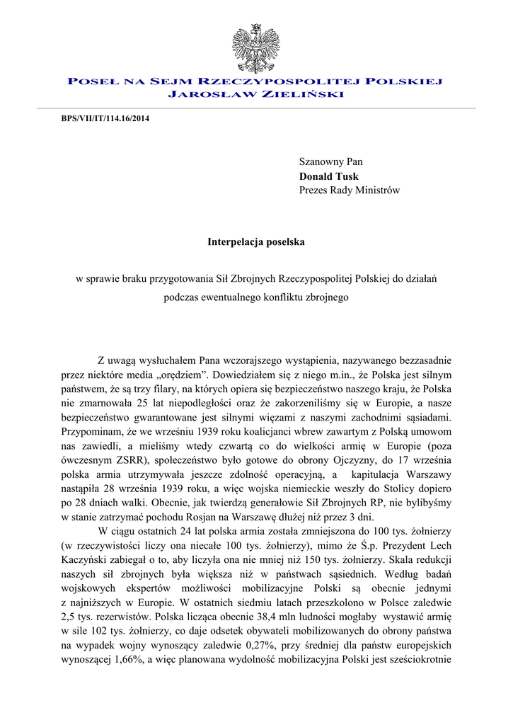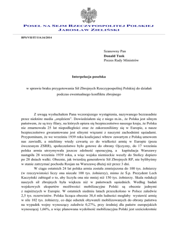 POSEŁ NA SEJM RZECZYPOSPOLITEJ POLSKIEJ JAROSŁAW ZIELIŃSKI BPS/VII/IT/114.16/2014 Szanowny Pan Donald Tusk Prezes Rady Ministrów Interpelacja poselska w sprawie braku przygotowania Sił Zbrojnych Rzeczypospolitej Polskiej do działań podczas ewentualnego konfliktu zbrojnego Z uwagą wysłuchałem Pana wczorajszego wystąpienia, nazywanego bezzasadnie przez niektóre media „orędziem”. Dowiedziałem się z niego m.in., że Polska jest silnym państwem, że są trzy filary, na których opiera się bezpieczeństwo naszego kraju, że Polska nie zmarnowała 25 lat niepodległości oraz że zakorzeniliśmy się w Europie, a nasze bezpieczeństwo gwarantowane jest silnymi więzami z naszymi zachodnimi sąsiadami. Przypominam, że we wrześniu 1939 roku koalicjanci wbrew zawartym z Polską umowom nas zawiedli, a mieliśmy wtedy czwartą co do wielkości armię w Europie (poza ówczesnym ZSRR), społeczeństwo było gotowe do obrony Ojczyzny, do 17 września polska armia utrzymywała jeszcze zdolność operacyjną, a kapitulacja Warszawy nastąpiła 28 września 1939 roku, a więc wojska niemieckie weszły do Stolicy dopiero po 28 dniach walki. Obecnie, jak twierdzą generałowie Sił Zbrojnych RP, nie bylibyśmy w stanie zatrzymać pochodu Rosjan na Warszawę dłużej niż przez 3 dni. W ciągu ostatnich 24 lat polska armia została zmniejszona do 100 tys. żołnierzy (w rzeczywistości liczy ona niecałe 100 tys. żołnierzy), mimo że Ś.p. Prezydent Lech Kaczyński zabiegał o to, aby liczyła ona nie mniej niż 150 tys. żołnierzy. Skala redukcji naszych sił zbrojnych była większa niż w państwach sąsiednich. Według badań wojskowych ekspertów możliwości mobilizacyjne Polski są obecnie jednymi z najniższych w Europie. W ostatnich siedmiu latach przeszkolono w Polsce zaledwie 2,5 tys. rezerwistów. Polska licząca obecnie 38,4 mln ludności mogłaby wystawić armię w sile 102 tys. żołnierzy, co daje odsetek obywateli mobilizowanych do obrony państwa na wypadek wojny wynoszący zaledwie 0,27%, przy średniej dla państw europejskich wynoszącej 1,66%, a więc planowana wydolność mobilizacyjna Polski jest sześciokrotnie niższa od przeciętnej w grupie tych państw, niższy wskaźnik mają tylko Czechy i Luksemburg. Armia rosyjska liczy ok.1 mln żołnierzy, ale rezerwy żołnierzy przeszkolonych w latach 2005 – 2010 jest 2 mln. Przy ok. 150 mln ludności daje to wskaźnik 2,16%. Dziesięciotysięczne Narodowe Siły Rezerwowe nie zmieniają tej sytuacji, ponieważ grupa ta służy właściwie do wypełniania etatów w regularnych siłach zbrojnych, zwolnionych przez odchodzących ze służby żołnierzy, a w latach 2010 – 2012 odeszło ich ok.18 tys. Co roku liczba żołnierzy, którzy chcą odejść ze służby sięga kilku tysięcy, co jest spowodowane m.in. brakiem w ostatnich kilku latach stabilizacji w siłach zbrojnych, brakiem podwyżek uposażenia oraz negatywnymi zmianami w systemie emerytalnym żołnierzy przeprowadzonymi przez rząd PO-PSL. Szeregi wojska opuszczają ludzie bardzo wartościowi i doskonale wyszkoleni. Nieporozumieniem jest również struktura naszych sił zbrojnych, która jest wręcz groteskowa, gdyż mamy więcej dowódców niż żołnierzy. Utrzymuje się bowiem przewaga liczebna dowódców (oficerów, podoficerów) nad żołnierzami w stosunku 1,66:1 (dane z 2012 roku), co miało sens w armii poborowej, gotowej na przyjęcie rzeszy rezerwistów, nie ma to jednak uzasadnienia w wojsku zawodowym, szczególnie przy niskiej zdolności mobilizacji dodatkowych sil. W efekcie decyzji rządu PO-PSL z 5 sierpnia 2008 roku o rezygnacji z poboru zamiast armii obronnej państwo polskie zdecydowało się na budowę zawodowej armii o charakterze ekspedycyjnym, co spowodowało, że dzisiaj Polska mimo oficjalnie stutysięcznej armii, jest w stanie wystawić do obrony kraju ok. 30 tys. żołnierzy liniowych. Taką siłą można bronić tylko co najwyżej części obszaru naszego kraju. Obecnie nie realizuje się też w pełni koncepcji armii ekspedycyjnej. Rząd PO – PSL, który strategię obrony kraju oparł na gwarancjach sojuszniczych NATO, jednocześnie demonstracyjnie zerwał solidarność z USA, wycofując polskie wojska z Iraku bez właściwych konsultacji z aliantami. Niemal dokładnie w czasie rosyjskiej inwazji na Gruzję, kiedy stało się jasne, że konflikt zbrojny w Europie znów jest możliwy i kiedy należało zastanowić się nad egzekwowaniem poboru, rząd PO-PSL oficjalnie go zniósł i zmniejszył wydatki zbrojeniowe wprowadzone przez Prawo i Sprawiedliwość. Wobec tych zaniedbań można mieć wątpliwości, czy program zbrojeniowy zaproponowany przez Pana Premiera w tzw. ,,drugim expose” mówiący o przeznaczeniu 100 mld zł do 2020 roku na modernizację armii sprawi, że Wojsko Polskie zwiększy swoje możliwości obronne i zdolność do współdziałania z siłami NATO. Tym bardziej, że rząd PO-PSL mówiąc o nienaruszalności nakładów 1,95% PKB na armię, jednocześnie (jeszcze kilka miesięcy temu), aby „ratować” budżet dokonał cięć wydatków o ok. 3,5 mld zł właśnie w resorcie obrony narodowej, a w ciągu 6-letnich rządów Pana Premiera na finansowanie armii przeznaczono o ponad 10 mld zł mniej niż wynikało to z ustawy o finansowaniu sił zbrojnych i te cięcia wydatków w dużej mierze również pochodziły z części przeznaczonej na modernizację armii. W okresie siedmiu lat rządów koalicji PO-PSL ani razu nie zrealizowano zasady przeznaczania w budżecie państwa na dany rok budżetowy 1,95% PKB z roku ubiegłego na obronę narodową. Anglia, 2 Francja i Niemcy wydawały przez ostatnie lata na zbrojenia 2% PKB, Rosja 3,5%, a Polska praktycznie nie 1,95%, a ok.1,3%. Były zastępca Szefa Biura Bezpieczeństwa Narodowego i były dowódca GROM gen. Roman Polko odnosząc się do wysokości finansowych cięć w armii stwierdził, że w odebranie jej pieniędzy oznacza, że wojsko wbrew zapewnienio