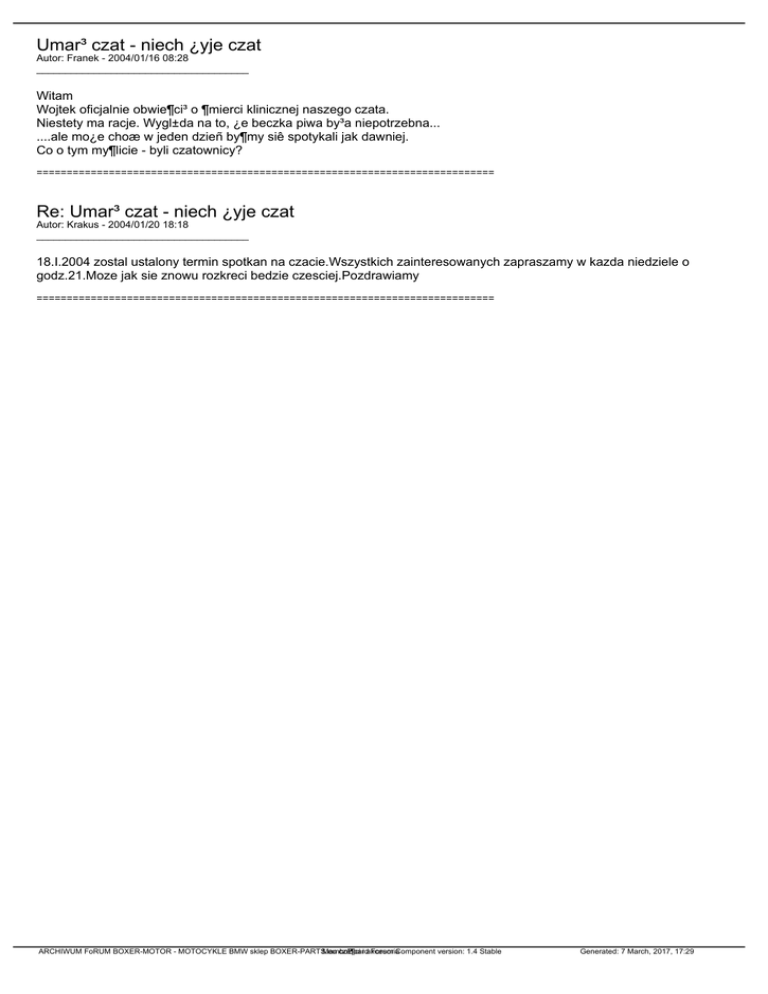 Umar³ czat - niech ¿yje czat Autor: Franek - 2004/01/16 08:28 _____________________________________ Witam Wojtek oficjalnie obwie¶ci³ o ¶mierci klinicznej naszego czata. Niestety ma racje. Wygl±da na to, ¿e beczka piwa by³a niepotrzebna... ....ale mo¿e choæ w jeden dzieñ by¶my siê spotykali jak dawniej. Co o tym my¶licie - byli czatownicy? ============================================================================ Re: Umar³ czat - niech ¿yje czat Autor: Krakus - 2004/01/20 18:18 _____________________________________ 18.I.2004 zostal ustalony termin spotkan na czacie.Wszystkich zainteresowanych zapraszamy w kazda niedziele o godz.21.Moze jak sie znowu rozkreci bedzie czesciej.Pozdrawiamy ============================================================================ ARCHIWUM FoRUM BOXER-MOTOR - MOTOCYKLE BMW sklep BOXER-PARTS.eu MamboBoard czê¶ci i akcesoria Forum Component version: 1.4 Stable Generated: 7 March, 2017, 17:29