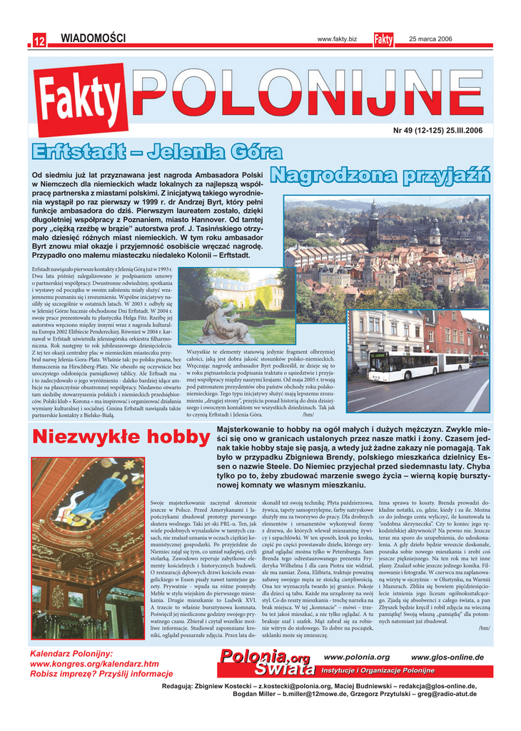 12 WIADOMOŚCI 25 marca 2006 www.fakty.biz Nr 49 (12-125) 25.III.2006 Erftstadt – Jelenia Góra Nagrodzona przyjaźń Od siedmiu już lat przyznawana jest nagroda Ambasadora Polski w Niemczech dla niemieckich władz lokalnych za najlepszą współpracę partnerska z miastami polskimi. Z inicjatywą takiego wyrodnienia wystąpił po raz pierwszy w 1999 r. dr Andrzej Byrt, który pełni funkcje ambasadora do dziś. Pierwszym laureatem zostało, dzięki długoletniej współpracy z Poznaniem, miasto Hannover. Od tamtej pory „ciężką rzeźbę w brązie” autorstwa prof. J. Tasinńskiego otrzymało dziesięć różnych miast niemieckich. W tym roku ambasador Byrt znowu miał okazje i przyjemność osobiście wręczać nagrodę. Przypadło ono małemu miasteczku niedaleko Kolonii – Erftstadt. Erfstadt nawiązało pierwsze kontakty z Jelenią Górą już w 1993 r. Dwa lata później zalegalizowano je podpisaniem umowy o partnerskiej współpracy. Dwustronne odwiedziny, spotkania i wystawy od początku w swoim założeniu miały służyć wzajemnemu poznaniu się i zrozumieniu. Wspólne inicjatywy nasiliły się szczególnie w ostatnich latach. W 2003 r. odbyły się w Jeleniej Górze hucznie obchodzone Dni Erftstadt. W 2004 r. swoje prace prezentowała tu plastyczka Helga Fitz. Rzeźbę jej autorstwa wręczono między innymi wraz z nagroda kulturalna Europa 2002 Elżbiecie Pendereckiej. Również w 2004 r. karnawał w Erfstadt uświetniła jeleniogórska orkiestra filharmoniczna. Rok następny to rok jubileuszowego dziesięciolecia. Z tej tez okazji centralny plac w niemieckim miasteczku przybrał nazwę Jelenia-Gora-Platz. Właśnie tak: po polsku pisana, bez tłumaczenia na Hirschberg-Platz. Nie obeszło się oczywiście bez uroczystego odsłonięcia pamiątkowej tablicy. Ale Erftsadt ma i to zadecydowało o jego wyróżnieniu - daleko bardziej idące ambicje na płaszczyźnie obustronnej współpracy. Niedawno otwarto tam siedzibę stowarzyszenia polskich i niemieckich przedsiębiorców. Polski klub « Korona » ma inspirować i organizować działania wymiany kulturalnej i socjalnej. Gmina Erftstadt nawiązała także partnerskie kontakty z Bielsko-Białą. Wszystkie te elementy stanowią jedynie fragment olbrzymiej całości, jaką jest dobra jakość stosunków polsko-niemieckich. Wręczając nagrodę ambasador Byrt podkreślił, że dzieje się to w roku piętnastolecia podpisania traktatu o sąsiedztwie i przyjaznej współpracy między naszymi krajami. Od maja 2005 r. trwają pod patronatem prezydentów obu państw obchody roku polskoniemieckiego. Tego typu inicjatywy służyć mają lepszemu zrozumieniu „drugiej strony”, przejściu ponad historią do dnia dzisiejszego i owocnym kontaktom we wszystkich dziedzinach. Tak jak to czynią Erftstadt i Jelenia Góra. /bm/ Niezwykłe hobby Majsterkowanie to hobby na ogół małych i dużych mężczyzn. Zwykle mieści się ono w granicach ustalonych przez nasze matki i żony. Czasem jednak takie hobby staje się pasją, a wtedy już żadne zakazy nie pomagają. Tak było w przypadku Zbigniewa Brendy, polskiego mieszkańca dzielnicy Essen o nazwie Steele. Do Niemiec przyjechał przed siedemnastu laty. Chyba tylko po to, żeby zbudować marzenie swego życia – wierną kopię bursztynowej komnaty we własnym mieszkaniu. Swoje majsterkowanie zaczynał skromnie jeszcze w Polsce. Przed Amerykanami i Japończykami zbudował prototyp pierwszego skutera wodnego. Taki jet-ski PRL-u. Ten, jak wiele podobnych wynalazków w tamtych czasach, nie znalazł uznania w oczach ciężkiej komunistycznej gospodarki. Po przyjeździe do Niemiec zajął się tym, co umiał najlepiej, czyli stolarką. Zawodowo reperuje zabytkowe elementy kościelnych i historycznych budowli. O restauracji dębowych drzwi kościoła ewangelickiego w Essen pisały nawet tamtejsze gazety. Prywatnie - wpada na różne pomysły. Meble w stylu wiejskim do pierwszego mieszkania. Drugie mieszkanie to Ludwik XVI. A trzecie to właśnie bursztynowa komnata. Poświęcił jej niezliczone godziny swojego prywatnego czasu. Zbierał i czytał wszelkie możliwe informacje. Studiował zapomniane kroniki, oglądał poszarzałe zdjęcia. Przez lata do- Kalendarz Polonijny: www.kongres.org/kalendarz.htm Robisz imprezę? Przyślij informacje skonalił też swoją technikę. Płyta paździerzowa, żywica, tapety samoprzylepne, farby natryskowe służyły mu za tworzywo do pracy. Dla drobnych elementów i ornamentów wykonywał formy z drzewa, do których wlewał mieszaninę żywicy i szpachlówki. W ten sposób, krok po kroku, część po części powstawało dzieło, którego oryginał oglądać można tylko w Petersburgu. Sam Brenda tego odrestaurowanego prezentu Fryderyka Wilhelma I dla cara Piotra nie widział, ale ma zamiar. Żona, Elżbieta, traktuje poważną zabawę swojego męża ze stoicką cierpliwością. Ona tez wyznaczyła twardo jej granice. Pokoje dla dzieci są tabu. Każde ma urządzony na swój styl. Co do reszty mieszkania - trochę narzeka na brak miejsca. W tej „komnacie“ – mówi – trzeba też jakoś mieszkać, a nie tylko oglądać. A tu brakuje szaf i szafek. Mąż zabrał się za robienie witryn do stołowego. To dobre na początek, szklanki może się zmieszczę. Polonia.org Świata Inna sprawa to koszty. Brenda prowadzi dokładne notatki, co, gdzie, kiedy i za ile. Można co do jednego centa wyliczyć, ile kosztowała ta “ozdobna skrzyneczka”. Czy to koniec jego rękodzielskiej aktywności? Na pewno nie. Jeszcze teraz ma sporo do uzupełnienia, do udoskonalenia. A gdy dzieło będzie wreszcie doskonałe, poszuka sobie nowego mieszkania i zrobi coś jeszcze piękniejszego. Na ten rok ma też inne plany. Znalazł sobie jeszcze jednego konika. Filmowanie i fotografie. W czerwcu ma zaplanowaną wizytę w ojczyźnie - w Olsztynku, na Warmii i Mazurach. Zbliża się bowiem pięćdziesięciolecie istnienia jego liceum ogólnokształcącego. Zjadą się absolwenc
