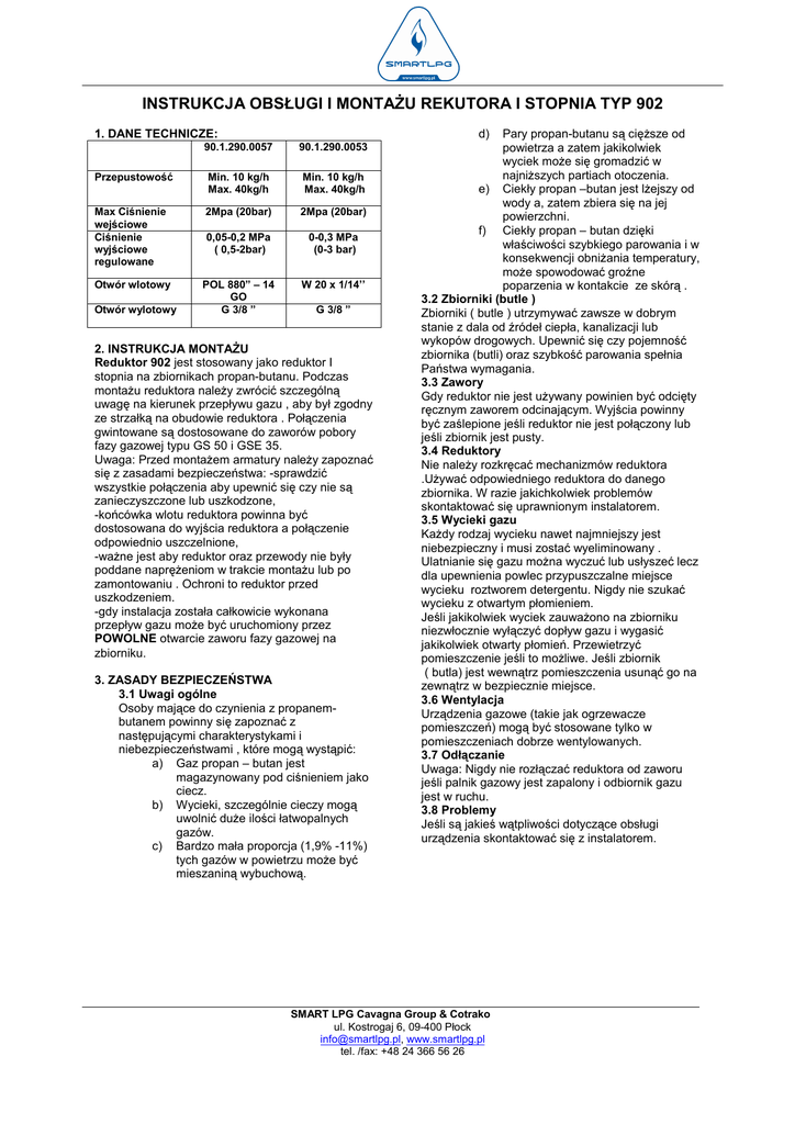 INSTRUKCJA OBSŁUGI I MONTAŻU REKUTORA I STOPNIA TYP 902 1. DANE TECHNICZE: d) 90.1.290.0057 90.1.290.0053 Przepustowość Min. 10 kg/h Max. 40kg/h Min. 10 kg/h Max. 40kg/h Max Ciśnienie wejściowe Ciśnienie wyjściowe regulowane 2Mpa (20bar) 2Mpa (20bar) 0,05-0,2 MPa ( 0,5-2bar) 0-0,3 MPa (0-3 bar) Otwór wlotowy POL 880” – 14 GO G 3/8 ” W 20 x 1/14’’ Otwór wylotowy G 3/8 ” 2. INSTRUKCJA MONTAŻU Reduktor 902 jest stosowany jako reduktor I stopnia na zbiornikach propan-butanu. Podczas montażu reduktora należy zwrócić szczególną uwagę na kierunek przepływu gazu , aby był zgodny ze strzałką na obudowie reduktora . Połączenia gwintowane są dostosowane do zaworów pobory fazy gazowej typu GS 50 i GSE 35. Uwaga: Przed montażem armatury należy zapoznać się z zasadami bezpieczeństwa: -sprawdzić wszystkie połączenia aby upewnić się czy nie są zanieczyszczone lub uszkodzone, -końcówka wlotu reduktora powinna być dostosowana do wyjścia reduktora a połączenie odpowiednio uszczelnione, -ważne jest aby reduktor oraz przewody nie były poddane naprężeniom w trakcie montażu lub po zamontowaniu . Ochroni to reduktor przed uszkodzeniem. -gdy instalacja została całkowicie wykonana przepływ gazu może być uruchomiony przez POWOLNE otwarcie zaworu fazy gazowej na zbiorniku. 3. ZASADY BEZPIECZEŃSTWA 3.1 Uwagi ogólne Osoby mające do czynienia z propanembutanem powinny się zapoznać z następującymi charakterystykami i niebezpieczeństwami , które mogą wystąpić: a) Gaz propan – butan jest magazynowany pod ciśnieniem jako ciecz. b) Wycieki, szczególnie cieczy mogą uwolnić duże ilości łatwopalnych gazów. c) Bardzo mała proporcja (1,9% -11%) tych gazów w powietrzu może być mieszaniną wybuchową. Pary propan-butanu są cięższe od powietrza a zatem jakikolwiek wyciek może się gromadzić w najniższych partiach otoczenia. e) Ciekły propan –butan jest lżejszy od wody a, zatem zbiera się na jej powierzchni. f) Ciekły propan – butan dzięki właściwości szybkiego parowania i w konsekwencji obniżania temperatury, może spowodować groźne poparzenia w kontakcie ze skórą . 3.2 Zbiorniki (butle ) Zbiorniki ( butle ) utrzymywać zawsze w dobrym stanie z dala od źródeł ciepła, kanalizacji lub wykopów drogowych. Upewnić się czy pojemność zbiornika (butli) oraz szybkość parowania spełnia Państwa wymagania. 3.3 Zawory Gdy reduktor nie jest używany powinien być odcięty ręcznym zaworem odcinającym. Wyjścia powinny być zaślepione jeśli reduktor nie jest połączony lub jeśli zbiornik jest pusty. 3.4 Reduktory Nie należy rozkręcać mechanizmów reduktora .Używać odpowiedniego reduktora do danego zbiornika. W razie jakichkolwiek problemów skontaktować się uprawnionym instalatorem. 3.5 Wycieki gazu Każdy rodzaj wycieku nawet najmniejszy jest niebezpieczny i musi zostać wyeliminowany . Ulatnianie się gazu można wyczuć lub usłyszeć lecz dla upewnienia powlec przypuszczalne miejsce wycieku roztworem detergentu. Nigdy nie szukać wycieku z otwartym płomieniem. Jeśli jakikolwiek wyciek zauważono na zbiorniku niezwłocznie wyłączyć dopływ gazu i wygasić jakikolwiek otwarty płomień. Przewietrzyć pomieszczenie jeśli to możliwe. Jeśli zbiornik ( butla) jest wewnątrz pomieszczenia usunąć go na zewnątrz w bezpiecznie miejsce. 3.6 Wentylacja Urządzenia gazowe (takie jak ogrzewacze pomieszczeń) mogą być stosowane tylko w pomieszczeniach dobrze wentylowanych. 3.7 Odłączanie Uwaga: Nigdy nie rozłączać reduktora od zaworu jeśli palnik gazowy jest zapalony i odbiornik gazu jest w ruchu. 3.8 Problemy Jeśli są jakieś wątpliwości dotyczące obsługi urządzenia skontaktować się z instalatorem. SMART LPG Cavagna Group & Cotrako ul. Kostrogaj 6, 09-400 Płock [email protected], www.smartlpg.pl tel. /fax: +48 24 366 56 26