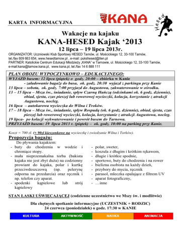 KARTA INFORMACYJNA Wakacje na kajaku KANA-HESED Kajak ‘2013 12 lipca – 19 lipca 2013r. ORGANIZATOR: Uczniowski Klub Sportowy HESED Tarnów, ul. Mościckiego 12, 33-100 Tarnów, tel./fax 609 663 654, www.hesedtarnow.pl , e-mail: [email protected] PARTNER: Katolickie Centrum Edukacji Młodzieży „KANA” w Tarnowie, ul. Mościckiego 12, 33-100 Tarnów, e-mail:[email protected], www.kana.pl, tel./fax 14 6 888 111 PLAN OBOZU WYPOCZYNKOWO – EDUKACYJNEGO: WYJAZD busem: 12 lipca (piątek) o godz. 20:00 – zbiórka w Kanie - załadowanie bagaży do busa, ok. godz. 20:30 wyjazd z parkingu przy Kanie 13 lipca – sobota, ok. godz. 7:00 przyjazd do Augustowa, zakwaterowanie w ośrodku. 13 – 15 lipca – Msza św., śniadanie, spływ Czarną Hańczą (odcinkami ok. 6 godz. dziennie), obiad, sjesta, czas pieszej lub rowerowej wycieczki, kolacja, korzystanie z atrakcji Augustowa, nocleg. 16 lipca – autokarowa wycieczka do Wilna i Troków. 17 – 18 lipca – Msza św., śniadanie, spływ Rospudą (ok. 6 godz. dziennie), obiad, sjesta, czas pieszej lub rowerowej wycieczki, kolacja, korzystanie z atrakcji Augustowa, nocleg. 19 lipca- po kolacji wykwaterowanie i powrót busem do Tarnowa. PRZYJAZD busem: 19 lipca 2013 r. (piątek) – ok. godz. 10:00 na parking przy Kanie. Koszt = 700 zł. (+ 90zł kieszonkowe na wycieczkę i zwiedzanie Wilna i Torków). Propozycja bagażu: Do pływania kajakiem: - buty do chodzenia w wodzie i chroniące stopy. - mała nieprzemakalna torba (bakista kajaka nie jest zbyt duża) na codzienny prowiant do kajaka, polar i kurtkę przeciwdeszczową (np. pelerynę odporna na przedarcia) oraz ręcznik i np. telefon czy aparat. - spodenki kąpielowe lub strój kąpielowy - polar, sweter, koszula z długim i krótkim rękawem, długie i krótkie spodnie, sportowe, buty do chodzenia i na rower bielizna osobista na każdy dzień, przybory do mycia, ręcznik parasol, mleczka opalające z filtrem UV aparat fotograficzny, …inne STAN ŁASKI UŚWIĘCAJĄCEJ (codzienne uczestnictwo we Mszy św. i modlitwie) Dla chętnych spotkanie informacyjne (UCZESTNIK + RODZIC) 24 czerwca (poniedziałek) o godz. 17:30 w KANIE