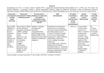 WYKAZ Na podstawie art. 35 ust. 1 i 2 ustawy z dnia 21 sierpnia 1997 r. o gospodarce nieruchomościami (tekst jednolity: Dz. U. z 2014 r. poz. 518 z późn. zm.) Starosta Pabianicki – wykonujący zadanie z zakresu administracji rządowej, podaje do publicznej wiadomości wykaz nieruchomości gruntowej, stanowiącej własność Skarbu Państwa, przeznaczonej do wydzierżawienia w trybie bezprzetargowym na czas oznaczony 3 lat na rzecz osoby prawnej Przeznaczenie w Oznaczenie Oznaczenie nieruchomośc nieruchomości według Studium uwarunkowań i kierunków i według ewidencji gruntów zagospodarowania księgi przestrzennego gminy wieczystej Dobroń KW Nr SR1L /00048431/6 Położenie: Powiat: Pabianicki Gmina: Dobroń Miejscowość: Chechło II Działka nr: 46/2 Obszar: 0,1244 ha Województwo: łódzkie Powiat: pabianicki Jednostka ewidencyjna: 100804_2 Dobroń Obręb: 3 Chechło Drugie jedn. rej. G. 470 Działka nr: 42/6 Powierzchnia: 0,1244 ha Uwaga: powierzchnia przeznaczonej do dzierżawy części działki wynosi 0,0270 ha Zgodnie ze Studium uwarunkowań i kierunków zagospodarowania przestrzennego gminy Dobroń działka nr 46/2 położona jest na terenach zabudowy produkcyjno – usługowej. Opis nieruchomości Wysokość kwartalnego czynszu dzierżawnego (netto) za część nieruchomości Zasada waloryzacji czynszu dzierżawnego Termin wnoszenia czynszu dzierżawnego Przedmiotowa nieruchomość położona jest we wschodniej części gm. Dobroń bezpośrednio przy drodze krajowej nr 14 z Łodzi do Wrocławia Działka nr 46/2 nie jest bezpośrednio wyposażona w żadne urządzenia infrastruktury technicznej, w ulicy znajduje się energia elektryczna. Część działki o pow. 0,0270 ha zabudowana jest słupem o konstrukcji stalowej – przekaźnik telefonii komórkowej, częściowo ogrodzona ogrodzeniem z siatki na słupkach stalowych. 4 493,61 zł Czynsz będzie waloryzowany corocznie od 2015r. w oparciu o średnioroczny wskaźnik cen towarów i usług konsumpcyjnych ogółem za rok poprzedni publikowany przez Prezesa Głównego Urzędu Statystycznego w Monitorze Polskim. Do: 31 marca, 30 czerwca, 30 września, 31 grudnia każdego roku Wykaz niniejszy wywiesza się na okres 21 dni, od dnia 16.09.2014 r. do dnia 07.10.2014 r.