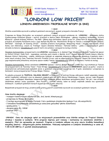 “LONDON! LOW PRICE!!!” LONDYN-GREENWICH-TROPIKALNE WYSPY (6 DNI) 1 dzień Zbiórka uczestników wycieczki w późnych godzinach wieczornych, wyjazd, przejazd w kierunku Francji; 2 dzień Przeprawa na Wyspy Brytyjskie; we wczesnych godzinach rannych przyjazd autokarem do LONDYNU - zwiedzanie stolicy Zjednoczonego Królestwa (piesze + metro): przejazd w okolice Pałacu Buckingham – głównej rezydencji królewskiej, Victoria Memorial – pomnik królowej Wiktorii, The Mall – główna aleja defiladowa; spacer przez St. James Park do Westminster Abbey; przejście do budynku Parlamentu wraz z jego słynnym Big Ben'em; Westminster Bridge na Tamizie z widokiem na Oko Londynu; Whitehall - Cenotaph, 10 Downing Street - siedziba premiera brytyjskiego, Banqueting House i stojąca naprzeciwko StraŜ Konna, Łuk Admiralicji, wizyta na Trafalgar Square (kolumna Nelsona) i National Gallery – jedna z najciekawszych galerii obrazów na świecie; (obiadokolacja*); powrót metro do autokaru i przejazd na nocleg w hotelu; 3 dzień Śniadanie kontynentalne; przejazd metro do LONDYNU: zwiedzamy m. in. Gabinet Figur Woskowych Madame Tussaud lub spacer na Oxford Street; Hyde Park – największy centralny park miasta z Marble Arch i Rogiem Mówców; Pomnik Księcia Alberta; Muzeum Historii Naturalnej – piękny, eklektyczny budynek ze wspaniałą ekspozycją dinozaurów, symulacją trzęsienia ziemi i wiele innych atrakcji; Dom Towarowy Harrod’s; Picadilly Circus; czas na odpoczynek przy Leicester Square lub Covent Garden z jego niepowtarzalną atmosferą; wieczorny spacer wzdłuŜ Tamizy; (obiadokolacja*); powrót do autokaru i hotelu na nocleg; 4 dzień Śniadanie kontynentalne; dalsze zwiedzanie LONDYNU (piesze + metro): British Museum; London Eye; rejs statkiem po Tamizie lub przejazd metro do Twierdzy Tower i Tower Bridge; (obiadokolacja*); przejazd do GREENWICH, spacer po parku i wizyta w obserwatorium astronomicznym (południk zero); w godzinach wieczornych wyjazd (po min. 9 godz. zwiedzaniu) i przeprawa na kontynent; nocny przejazd przez Francję, Belgię i Niemcy; 5 dzień Po południu przyjazd do TROPICAL ISLANDS RESORT w Niemczech: w centrum Europy odkryjecie radość wspaniałej zabawy wśród tropikalnej roślinności oraz na akwenach ciepłych wód (ok. 30ºC) Morza Południowego i Laguny: jaccuzi, małe ślizgawki, rwąca rzeka i wodospad. Równikowa temperatura oraz wspaniałe pokazy dodatkowo uprzyjemnią pobyt, tak jak i inne atrakcje (dodatkowo płatne): wieŜa zjeŜdŜalni, „Rain Forest” – centrum odnowy, balon na uwięzi; wspaniała zabawa bez ograniczeń wiekowych; w późnych godzinach nocnych wyjazd (po min. 9 godz. pobycie); 6 dzień Bezpośredni przejazd do kraju, przekroczenie granicy, powrót uczestników wycieczki we wczesnych godzinach rannych; Cena brutto obejmuje: - transport komfortowym autokarem (wc, dvd, barek, klimatyzacja) - przeprawę na Wyspy Brytyjskie - 2 noclegi wg programu w hotelu Formule 1 lub o podobnym standardzie (pokoje 3-os. dla wszystkich) - 2 śniadania kontynentalne (obiadokolacje oznaczone gwiazdką* płatne dodatkowo) - opiekę pilota - ubezpieczenie KL i NNW - podatek VAT UWAGA! Cena nie obejmuje opłat za miejscowych przewodników oraz biletów wstępu do Tropical Islands, atrakcji i muzeów w Londynie. W/w program imprezy jest ramowy i nastawiony na zwiedzanie obiektów z zewnątrz. Pilot nie oprowadza po muzeach. Program w Londynie odbywa się przy uŜyciu środków komunikacji miejskiej (metro) – obligatoryjnie płatne dodatkowo. Polecamy wykupienie w Londynie obiadokolacji w cenie ok. 7,00-8,00 GBP/os./1 posiłek (nieobowiązkowe).
