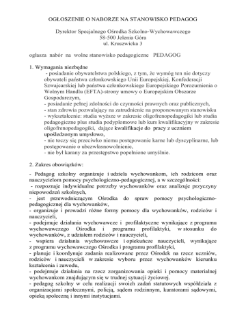 OGŁOSZENIE O NABORZE NA STANOWISKO PEDAGOG Dyrektor Specjalnego Ośrodka Szkolno-Wychowawczego 58-500 Jelenia Góra ul. Kruszwicka 3 ogłasza nabór na wolne stanowisko pedagogiczne PEDAGOG 1. Wymagania niezbędne - posiadanie obywatelstwa polskiego, z tym, że wymóg ten nie dotyczy obywateli państwa członkowskiego Unii Europejskiej, Konfederacji Szwajcarskiej lub państwa członkowskiego Europejskiego Porozumienia o Wolnym Handlu (EFTA)-strony umowy o Europejskim Obszarze Gospodarczym, - posiadanie pełnej zdolności do czynności prawnych oraz publicznych, - stan zdrowia pozwalający na zatrudnienie na proponowanym stanowisku - wykształcenie: studia wyższe w zakresie oligofrenopedagogiki lub studia pedagogiczne plus studia podyplomowe lub kurs kwalifikacyjny w zakresie oligofrenopedagogiki, dające kwalifikacje do pracy z uczniem upośledzonym umysłowo, - nie toczy się przeciwko niemu postępowanie karne lub dyscyplinarne, lub postępowanie o ubezwłasnowolnienie, - nie był karany za przestępstwo popełnione umyślnie. 2. Zakres obowiązków: - Pedagog szkolny organizuje i udziela wychowankom, ich rodzicom oraz nauczycielom pomocy psychologiczno-pedagogicznej, a w szczególności: - rozpoznaje indywidualne potrzeby wychowanków oraz analizuje przyczyny niepowodzeń szkolnych, - jest przewodniczącym Ośrodka do spraw pomocy psychologicznopedagogicznej dla wychowanków, - organizuje i prowadzi różne formy pomocy dla wychowanków, rodziców i nauczycieli, - podejmuje działania wychowawcze i profilaktyczne wynikające z programu wychowawczego Ośrodka i programu profilaktyki, w stosunku do wychowanków, z udziałem rodziców i nauczycieli, - wspiera działania wychowawcze i opiekuńcze nauczycieli, wynikające z programu wychowawczego Ośrodka i programu profilaktyki, - planuje i koordynuje zadania realizowane przez Ośrodek na rzecz uczniów, rodziców i nauczycieli w zakresie wyboru przez wychowanków kierunku kształcenia i zawodu, - podejmuje działania na rzecz zorganizowania opieki i pomocy materialnej wychowankom znajdującym się w trudnej sytuacji życiowej. - pedagog szkolny w celu realizacji swoich zadań statutowych współdziała z organizacjami społecznymi, policją, sądem rodzinnym, kuratorami sądowymi, opieką społeczną i innymi instytucjami. -wykonuje inne działania określone w zakresie obowiązków pedagoga. 3. Wymiar zatrudnienia – 1 etat 20/20 4. Wymagane dokumenty: - list motywacyjny, - kserokopie dwóch stron dowodu osobistego, - CV z dokładnym opisem przebiegu pracy zawodowej, -kwestionariusz osoby ubiegającej się o zatrudnienie , - kserokopie dokumentów poświadczających kwalifikacje i wykształcenie zawodowe, -kserokopie świadectw pracy, -oświadczenie kandydata o braku przeciwwskazań zdrowotnych do zajmowanego stanowiska, -oświadczenie, że kandydat nie był karany za przestępstwo umyślne oraz nie toczy się przeciwko niemu postępowanie karne, Dokumenty aplikacyjne, list motywacyjny, CV powinny być opatrzone klauzulą; „Wyrażam zgodę na przetwarzanie moich danych osobowych zawartych w ofercie pracy, w zakresie niezbędnym do przeprowadzenia rekrutacji (zgodnie z ustawą z dnia 29.081997 r. o ochronie danych osobowychtekst jedn. Dz. U z 2002, nr 101, poz. 926 z późn. zm.). Wymagane dokumenty aplikacyjne należy złożyć w sekretariacie SOSW w terminie do 26 sierpnia 2015 r. do godz. 10.00 w zaklejonych kopertach z dopiskiem „Nabór na wolne stanowisko PEDAGOGA w SOSW” Otwarcie ofert nastąpi w SOSW w dniu 27 sierpnia 2015 r. , rozpatrzenie do godz. 15.00. Kandydaci zostaną powiadomieni telefonicznie o wynikach postępowania rekrutacyjnego. O terminie rozmowy kwalifikacyjnej wybrani kandydaci zostaną powiadomieni indywidualnie . Informacje o wyniku naboru umieszczona będzie w Biuletynie Informacji Publicznej placówki oraz w jej siedzibie. Dodatkowe informacje można uzyskać pod numerem telefonu 75 7538723. Jelenia Góra, 17.08.2015 r. mgr Romuald Szpot Dyrektor SOSW
