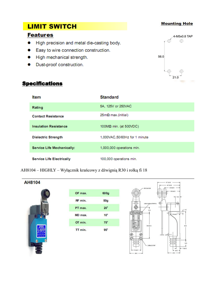 AH8104 – HIGHLY – Wyłącznik krańcowy z dźwignią R30 i rolką fi 18