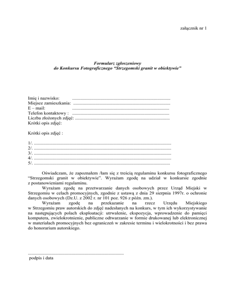 załącznik nr 1 Formularz zgłoszeniowy do Konkursu Fotograficznego “Strzegomski granit w obiektywie” Imię i nazwisko: ................................................................................... Miejsce zamieszkania: .................................................................................. E – mail: .................................................................................. Telefon kontaktowy : .................................................................................. Liczba złożonych zdjęć: ................................................................................ Krótki opis zdjęć: Krótki opis zdjęć : 1/. .................................................................................................................... 2/. .................................................................................................................... 3/. .................................................................................................................... 4/. .................................................................................................................... 5/. ................................................................................................................... Oświadczam, że zapoznałem /łam się z treścią regulaminu konkursu fotograficznego “Strzegomski granit w obiektywie”. Wyrażam zgodę na udział w konkursie zgodnie z postanowieniami regulaminu. Wyrażam zgodę na przetwarzanie danych osobowych przez Urząd Miejski w Strzegomiu w celach promocyjnych, zgodnie z ustawą z dnia 29 sierpnia 1997r. o ochronie danych osobowych (Dz.U. z 2002 r. nr 101 poz. 926 z późn. zm.). Wyrażam zgodę na przekazanie na rzecz Urzędu Miejskiego w Strzegomiu praw autorskich do zdjęć nadesłanych na konkurs, w tym ich wykorzystywanie na następujących polach eksploatacji: utrwalenie, ekspozycja, wprowadzenie do pamięci komputera, zwielokrotnienie, publiczne odtwarzanie w formie drukowanej lub elektronicznej w materiałach promocyjnych bez ograniczeń w zakresie terminu i wielokrotności i bez prawa do honorarium autorskiego. ................................................................................. podpis i data