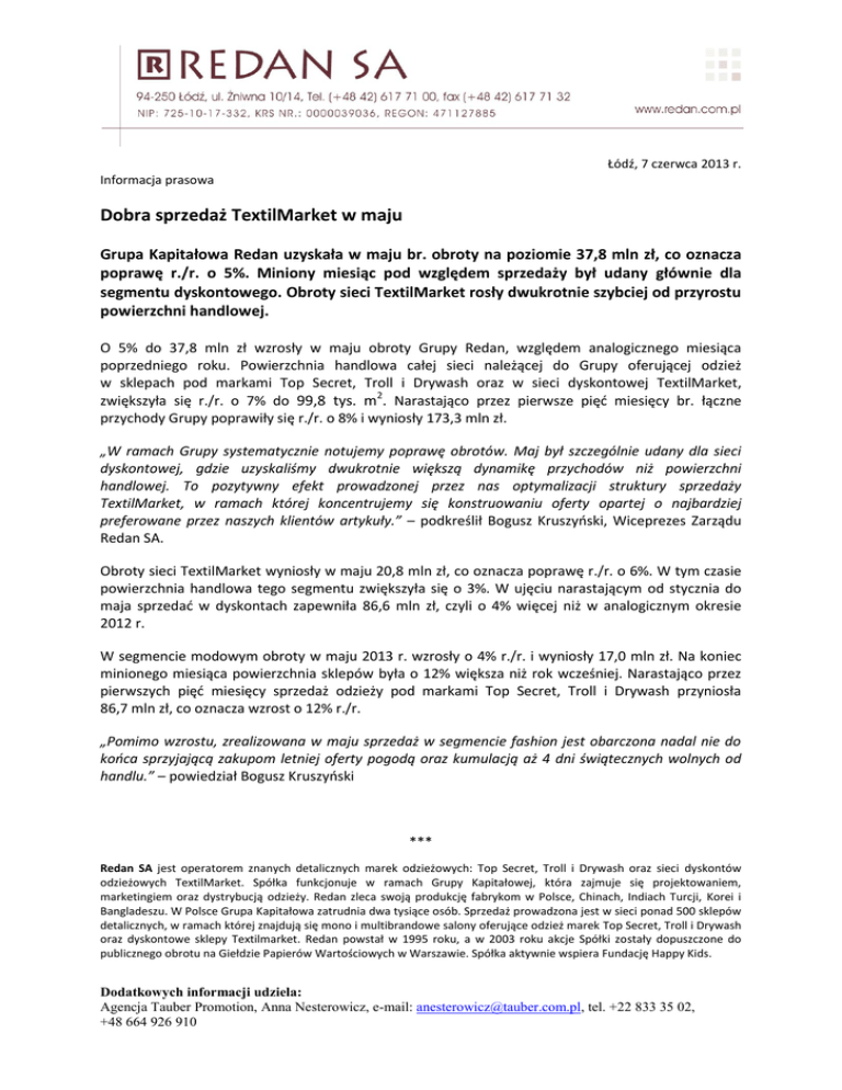 Łódź, 7 czerwca 2013 r. Informacja prasowa Dobra sprzedaż TextilMarket w maju Grupa Kapitałowa Redan uzyskała w maju br. obroty na poziomie 37,8 mln zł, co oznacza poprawę r./r. o 5%. Miniony miesiąc pod względem sprzedaży był udany głównie dla segmentu dyskontowego. Obroty sieci TextilMarket rosły dwukrotnie szybciej od przyrostu powierzchni handlowej. O 5% do 37,8 mln zł wzrosły w maju obroty Grupy Redan, względem analogicznego miesiąca poprzedniego roku. Powierzchnia handlowa całej sieci należącej do Grupy oferującej odzież w sklepach pod markami Top Secret, Troll i Drywash oraz w sieci dyskontowej TextilMarket, zwiększyła się r./r. o 7% do 99,8 tys. m2. Narastająco przez pierwsze pięć miesięcy br. łączne przychody Grupy poprawiły się r./r. o 8% i wyniosły 173,3 mln zł. „W ramach Grupy systematycznie notujemy poprawę obrotów. Maj był szczególnie udany dla sieci dyskontowej, gdzie uzyskaliśmy dwukrotnie większą dynamikę przychodów niż powierzchni handlowej. To pozytywny efekt prowadzonej przez nas optymalizacji struktury sprzedaży TextilMarket, w ramach której koncentrujemy się konstruowaniu oferty opartej o najbardziej preferowane przez naszych klientów artykuły.” – podkreślił Bogusz Kruszyński, Wiceprezes Zarządu Redan SA. Obroty sieci TextilMarket wyniosły w maju 20,8 mln zł, co oznacza poprawę r./r. o 6%. W tym czasie powierzchnia handlowa tego segmentu zwiększyła się o 3%. W ujęciu narastającym od stycznia do maja sprzedać w dyskontach zapewniła 86,6 mln zł, czyli o 4% więcej niż w analogicznym okresie 2012 r. W segmencie modowym obroty w maju 2013 r. wzrosły o 4% r./r. i wyniosły 17,0 mln zł. Na koniec minionego miesiąca powierzchnia sklepów była o 12% większa niż rok wcześniej. Narastająco przez pierwszych pięć miesięcy sprzedaż odzieży pod markami Top Secret, Troll i Drywash przyniosła 86,7 mln zł, co oznacza wzrost o 12% r./r. „Pomimo wzrostu, zrealizowana w maju sprzedaż w segmencie fashion jest obarczona nadal nie do końca sprzyjającą zakupom letniej oferty pogodą oraz kumulacją aż 4 dni świątecznych wolnych od handlu.” – powiedział Bogusz Kruszyński *** Redan SA jest operatorem znanych detalicznych marek odzieżowych: Top Secret, Troll i Drywash oraz sieci dyskontów odzieżowych TextilMarket. Spółka funkcjonuje w ramach Grupy Kapitałowej, która zajmuje się projektowaniem, marketingiem oraz dystrybucją odzieży. Redan zleca swoją produkcję fabrykom w Polsce, Chinach, Indiach Turcji, Korei i Bangladeszu. W Polsce Grupa Kapitałowa zatrudnia dwa tysiące osób. Sprzedaż prowadzona jest w sieci ponad 500 sklepów detalicznych, w ramach której znajdują się mono i multibrandowe salony oferujące odzież marek Top Secret, Troll i Drywash oraz dyskontowe sklepy Textilmarket. Redan powstał w 1995 roku, a w 2003 roku akcje Spółki zostały dopuszczone do publicznego obrotu na Giełdzie Papierów Wartościowych w Warszawie. Spółka aktywnie wspiera Fundację Happy Kids. Dodatkowych informacji udziela: Agencja Tauber Promotion, Anna Nesterowicz, e-mail: [email protected], tel. +22 833 35 02, +48 664 926 910