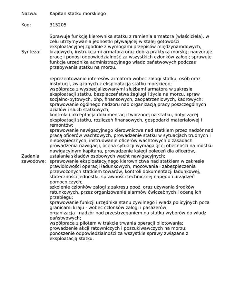 Nazwa: Kapitan statku morskiego Kod: 315205 Synteza: Sprawuje funkcję kierownika statku z ramienia armatora (właściciela), w celu utrzymywania jednostki pływającej w stałej gotowości eksploatacyjnej zgodnie z wymogami przepisów międzynarodowych, krajowych, instrukcjami armatora oraz dobrą praktyką morską; nadzoruje pracę i ponosi odpowiedzialność za wszystkich członków załogi; sprawuje funkcje urzędnika administracyjnego władz państwowych podczas przebywania statku na morzu. reprezentowanie interesów armatora wobec załogi statku, osób oraz instytucji, związanych z eksploatacją statku morskiego; współpraca z wyspecjalizowanymi służbami armatora w zakresie eksploatacji statku, bezpieczeństwa żeglugi i życia na morzu, spraw socjalno-bytowych, bhp, finansowych, zaopatrzeniowych, kadrowych; sprawowanie ogólnego nadzoru nad organizacją pracy poszczególnych działów i służb statkowych; kontrola i akceptacja dokumentacji tworzonej na statku, dotyczącej eksploatacji statku, rozliczeń finansowych, gospodarki materiałowej i remontów; sprawowanie nawigacyjnego kierownictwa nad statkiem przez nadzór nad pracą oficerów wachtowych, prowadzenie statku w sytuacjach trudnych i niebezpiecznych, instruowanie oficerów wachtowych o zasadach prowadzenia nawigacji, ocena sytuacji wymagającej obecności na mostku nawigacyjnym kapitana, prowadzenie księgi poleceń dla oficerów, Zadania ustalanie składów osobowych wacht nawigacyjnych; zawodowe: sprawowanie eksploatacyjnego kierownictwa nad statkiem w zakresie prawidłowości operacji ładunkowych, mocowania i zabezpieczenia przewożonych statkiem towarów, kontroli dokumentacji ładunkowej, stateczności jednostki, sprawności technicznej napędu i urządzeń pomocniczych; szkolenie członków załogi z zakresu ppoż. oraz używania środków ratunkowych, przez organizowanie alarmów ćwiczebnych i ocenę ich przebiegu; sprawowanie funkcji urzędnika stanu cywilnego i władz policyjnych poza granicami kraju - wobec członków załogi i pasażerów; organizacja i nadzór nad przestrzeganiem na statku wyborów do władz państwowych; współpraca z pilotem w trakcie trwania operacji pilotowania; prowadzenie akcji ratowniczych i poszukiwawczych na morzu; ponoszenie odpowiedzialności za wszystkie sprawy związane z eksploatacją statku.