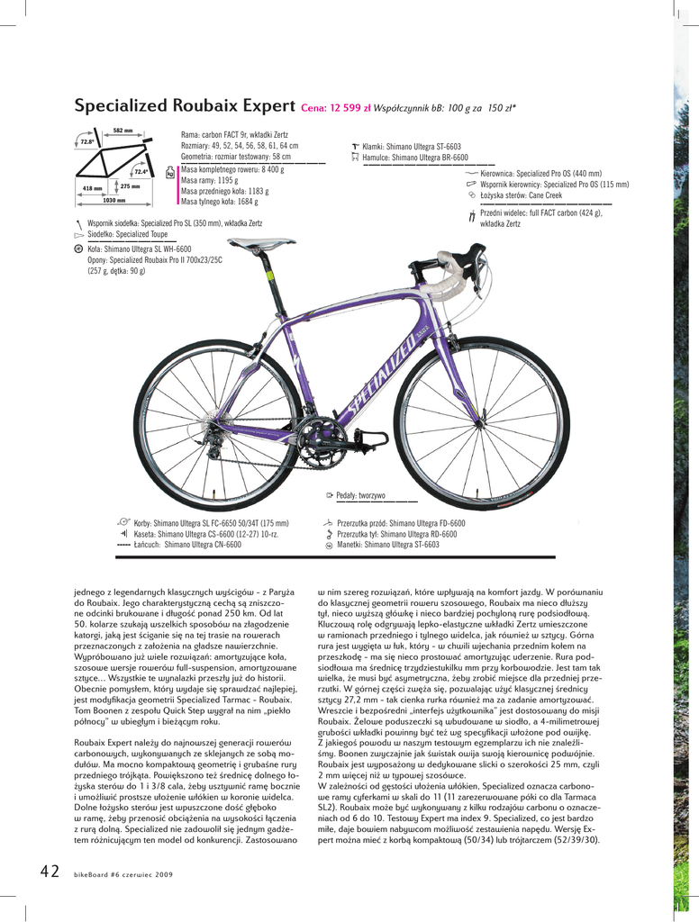 Specialized Roubaix Expert Cena: 12 599 zł Współczynnik bB: 100 g za 150 zł* 582 mm Rama: carbon FACT 9r, wkładki Zertz Rozmiary: 49, 52, 54, 56, 58, 61, 64 cm Geometria: rozmiar testowany: 58 cm 72.8º 72.4º 418 mm 275 mm 1030 mm Klamki: Shimano Ultegra ST-6603 Hamulce: Shimano Ultegra BR-6600 Masa kompletnego roweru: 8 400 g Masa ramy: 1195 g Masa przedniego koła: 1183 g Masa tylnego koła: 1684 g Kierownica: Specialized Pro OS (440 mm) Wspornik kierownicy: Specialized Pro OS (115 mm) Łożyska sterów: Cane Creek Przedni widelec: full FACT carbon (424 g), wkładka Zertz Wspornik siodełka: Specialized Pro SL (350 mm), wkładka Zertz Siodełko: Specialized Toupe Koła: Shimano Ultegra SL WH-6600 Opony: Specialized Roubaix Pro II 700x23/25C (257 g, dętka: 90 g) Pedały: tworzywo Korby: Shimano Ultegra SL FC-6650 50/34T (175 mm) Kaseta: Shimano Ultegra CS-6600 (12-27) 10-rz. Łańcuch: Shimano Ultegra CN-6600 jednego z legendarnych klasycznych wyścigów - z Paryża do Roubaix. Jego charakterystyczną cechą są zniszczone odcinki brukowane i długość ponad 250 km. Od lat 50. kolarze szukają wszelkich sposobów na złagodzenie katorgi, jaką jest ściganie się na tej trasie na rowerach przeznaczonych z założenia na gładsze nawierzchnie. Wypróbowano już wiele rozwiązań: amortyzujące koła, szosowe wersje rowerów full-suspension, amortyzowane sztyce… Wszystkie te wynalazki przeszły już do historii. Obecnie pomysłem, który wydaje się sprawdzać najlepiej, jest modyfikacja geometrii Specialized Tarmac - Roubaix. Tom Boonen z zespołu Quick Step wygrał na nim „piekło północy” w ubiegłym i bieżącym roku. Roubaix Expert należy do najnowszej generacji rowerów carbonowych, wykonywanych ze sklejanych ze sobą modułów. Ma mocno kompaktową geometrię i grubaśne rury przedniego trójkąta. Powiększono też średnicę dolnego łożyska sterów do 1 i 3/8 cala, żeby usztywnić ramę bocznie i umożliwić prostsze ułożenie włókien w koronie widelca. Dolne łożysko sterów jest wpuszczone dość głęboko w ramę, żeby przenosić obciążenia na wysokości łączenia z rurą dolną. Specialized nie zadowolił się jednym gadżetem różnicującym ten model od konkurencji. Zastosowano 42 bi ke Bo ar d # 6 c ze r wiec 2009 Przerzutka przód: Shimano Ultegra FD-6600 Przerzutka tył: Shimano Ultegra RD-6600 Manetki: Shimano Ultegra ST-6603 w nim szereg rozwiązań, które wpływają na komfort jazdy. W porównaniu do klasycznej geometrii roweru szosowego, Roubaix ma nieco dłuższy tył, nieco wyższą główkę i nieco bardziej pochyloną rurę podsiodłową. Kluczową rolę odgrywają lepko-elastyczne wkładki Zertz umieszczone w ramionach przedniego i tylnego widelca, jak również w sztycy. Górna rura jest wygięta w łuk, który - w chwili wjechania przednim kołem na przeszkodę - ma się nieco prostować amortyzując uderzenie. Rura podsiodłowa ma średnicę trzydziestukilku mm przy korbowodzie. Jest tam tak wielka, że musi być asymetryczna, żeby zrobić miejsce dla przedniej przerzutki. W górnej części zwęża się, pozwalając użyć klasycznej średnicy sztycy 27,2 mm - tak cienka rurka również ma za zadanie amortyzować. Wreszcie i bezpośredni „interfejs użytkownika” jest dostosowany do misji Roubaix. Żelowe poduszeczki są wbudowane w siodło, a 4-milimetrowej grubości wkładki powinny być też wg specyfikacji włożone pod owijkę. Z jakiegoś powodu w naszym testowym egzemplarzu ich nie znaleźliśmy. Boonen zwyczajnie jak świstak owija swoją kierownicę podwójnie. Roubaix jest wyposażony w dedykowane slicki o szerokości 25 mm, czyli 2 mm więcej niż w typowej szosówce. W zależności od gęstości ułożenia włókien, Specialized oznacza carbonowe ramy cyferkami w skali do 11 (11 zarezerwowane póki co dla Tarmaca SL2). Roubaix może być wykonywany z kilku rodzajów carbonu o oznaczeniach od 6 do 10. Testowy Expert ma index 9. Specialized, co jest bardzo miłe, daje bowiem nabywcom możliwość zestawienia napędu. Wersję Expert można mieć z korbą kompaktową (50/34) lub trójtarczem (52/39/30).