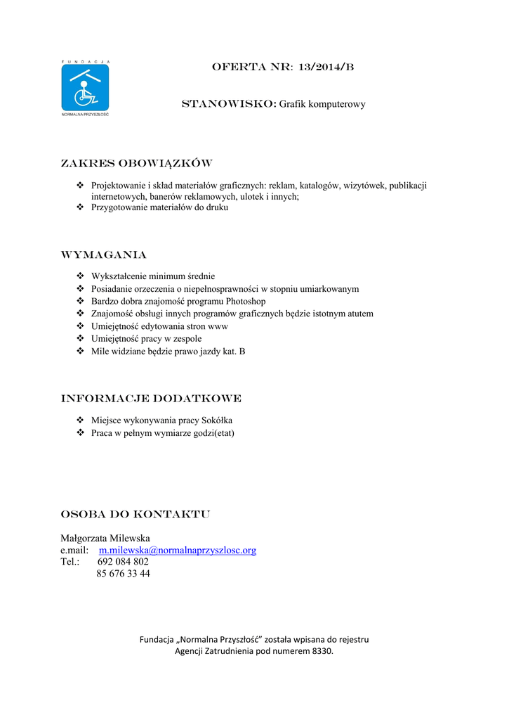 Oferta Nr: 13/2014/B Stanowisko: Grafik komputerowy Zakres obowiĄzków Projektowanie i skład materiałów graficznych: reklam, katalogów, wizytówek, publikacji internetowych, banerów reklamowych, ulotek i innych; Przygotowanie materiałów do druku Wymagania Wykształcenie minimum średnie Posiadanie orzeczenia o niepełnosprawności w stopniu umiarkowanym Bardzo dobra znajomość programu Photoshop Znajomość obsługi innych programów graficznych będzie istotnym atutem Umiejętność edytowania stron www Umiejętność pracy w zespole Mile widziane będzie prawo jazdy kat. B Informacje dodatkowe Miejsce wykonywania pracy Sokółka Praca w pełnym wymiarze godzi(etat) Osoba do kontaktu Małgorzata Milewska e.mail: [email protected] Tel.: 692 084 802 85 676 33 44 Fundacja „Normalna Przyszłość” została wpisana do rejestru Agencji Zatrudnienia pod numerem 8330.