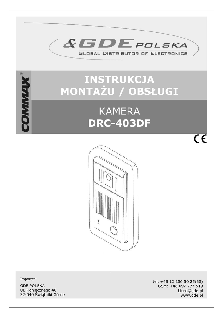 INSTRUKCJA MONTAśU / OBSŁUGI KAMERA DRC-403DF Importer: GDE POLSKA Ul. Koniecznego 46 32-040 Świątniki Górne tel. +48 12 256 50 25(35) GSM: +48 697 777 519 [email protected] www.gde.pl DRC-403DF Wygląd zewnętrzny 1.Panel czołowy – odlew aluminium (malowany proszkowo) 2.Diody podświetlające – widoczność w ciemności 3.Obiektyw kamery 4.Osłona obiektywu 5.Głośnik 6.Przycisk wywołania 7.Mikrofon 8.Zaślepka śruby mocującej 9.Pełna regulacja kąta widzenia 10.Zaciski podłączeniowe do monitora 11.Przewód do podłączenia obwodu z elektrozamkiem - styk MontaŜ Zanim rozpoczniesz montaŜ Nie uszczelniaj silikonem kamery, zaleca się wyłoŜyć wnękę pod kamerę warstwą cienkiego styropianu (tył i ścianki boczne). W miejscach zacieków i duŜej wilgotności koniecznie stosować obudowę z daszkiem typu ODRC. Nie montuj kamery w miejscu bezpośrednio naraŜonym na promieniowanie słoneczne (lub silne oświetlenie). -2- Dostępne obudowy(osłony): ODRC 403DFn - umoŜliwia nadtynkowy montaŜ kamery ODRC 403DFp - osłona / daszek do montaŜu podtynkowego SCHEMAT POŁĄCZENIA 1 - AUDIO 2 - MASA 3 - (+12V) 4 - VIDEO 1V p-p MONITOR KAMERA Dane techniczne Przetwornik Zasilanie Okablowanie Otwieranie drzwi Kąt widzenia Regulacja kąta widz. Skanowanie Czułość Temperatura pracy Wymiary Waga CCD 1/3”, B/W DC 12V (z monitora) 4 przewody spolaryzowane 2 przewody niespolaryzowane (styk) Poziomy: 68° ; Pionowy: 55° 20º↕, 14º↔ Poziome: 15.734 kHz; Pionowe: 60 Hz (EIA) Poziome: 15.625 kHz; Pionowe: 50 Hz (CCIR) 0 LUX (30 cm od soczewki) -20°C ~ +50°C 125 x 183 x 50 (szer./wys./gł.)mm 160g DRC-403DF Pozbywanie się starych urządzeń elektrycznych Europejska Dyrektywa 2002/96/EC dotycząca ZuŜytych Elektrycznych i Elektronicznych Urządzeń (WEEE) zakłada zakaz pozbywania się starych urządzeń domowego uŜytku jako nieposortowanych śmieci komunalnych. ZuŜyte urządzenia muszą być osobno zbierane i sortowane w celu zoptymalizowania odzyskiwania oraz ponownego przetworzenia pewnych komponentów i materiałów. Pozwala to ograniczyć zanieczyszczenie środowiska i pozytywnie wpływa na ludzkie zdrowie. Przekreślony symbol „kosza” umieszczony na produkcie przypomina klientowi o obowiązku specjalnego sortowania. Konsumenci powinni kontaktować się z władzami lokalnymi lub sprzedawcą w celu uzyskania informacji dotyczących postępowania z ich zuŜytymi urządzeniami elektrycznymi i elektronicznymi. (TŁUMACZENIE DEKLARACJI ZGODNOŚCI) DEKLARACJA ZGODNOŚCI Wyprodukowane przez: Nazwa & adres fabryki: COMMAX Co.,Ltd. 513-11 Sangdaewon Dong, Jungwon Gu, Sung, Kyunggi Do 462-120, KOREA Oświadcza się, Ŝe produkty: Typ produktu: kamera videodomofonowa Model: DRC-403DF, DRC-403D Spełniają następujące normy: Safety: EMC: N/A EN55022:’1998+A1:’2000+A2:2003 EN50130-4:’1995+A1:’1998 Certyfikowane przez: CE EMC certyfikowane wg standardów EN ,Electromagnetic Research Institute (ERI) w Koreii Dodatkowe informacje Niniejszym oświadczamy, Ŝe zgodnie z wytycznymi Rady UE są spełnione wszystkie główne wymagania bezpieczeństwa dotyczące następujących dyrektyw: CE (93/68/EEC) EMC (89/336/EEC,92/31/EEC) Osoba odpowiedzialna za sporządzenie deklaracji J.D.Noh, Director of Manufacturing Plants 15 Sierpień, 2005 Kyunggi Do, Korea -4-