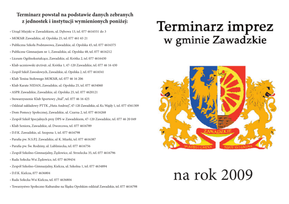 Terminarz powstał na podstawie danych zebranych z jednostek i instytucji wymienionych poniżej: • Urząd Miejski w Zawadzkiem, ul. Dębowa 13, tel. 077 4616551 do 3 • MOKSiR Zawadzkie, ul. Opolska 25, tel. 077 461 65 21 • Publiczna Szkoła Podstawowa, Zawadzkie, ul. Opolska 45, tel. 077 4616375 • Publiczne Gimnazjum nr 1, Zawadzkie, ul. Opolska 48, tel. 077 4616212 • Liceum Ogólnokształcące, Zawadzkie, ul. Krótka 2, tel. 077 4616430 • Klub uczniowski @ctiv@, ul. Krótka 1, 47-120 Zawadzkie, tel. 077 46 16 430 • Zespół Szkół Zawodowych, Zawadzkie, ul. Opolska 2, tel. 077 4616541 • Klub Tenisa Stołowego MOKSiR, tel. 077 46 16 206 • Klub Karate NIDAN, Zawadzkie, ul. Opolska 25, tel. 077 4634060 • ASPR Zawadzkie, Zawadzkie, ul. Opolska 25, tel. 077 4620121 • Stowarzyszenie Klub Sportowy „Stal”, tel. 077 46 16 425 • Oddział zakładowy PTTK „Huta Andrzej”, 47-120 Zawadzkie, ul. Ks. Wajdy 1, tel. 077 4561309 • Dom Pomocy Społecznej, Zawadzkie, ul. Czarna 2, tel. 077 4616268 • Zespół Szkół Specjalnych przy DPS w Zawadzkiem, 47-120 Zawadzkie, tel. 077 46 20 049 • Klub Seniora, Zawadzkie, ul. Dworcowa, tel. 077 4616789 • D.F.K. Zawadzkie, ul. Szopena 1, tel. 077 4616798 • Parafia pw. N.S.P.J. Zawadzkie, ul K. Miarki, tel. 077 4616387 • Parafia pw. Św. Rodziny, ul. Lubliniecka, tel. 077 4616756 • Zespół Szkolno-Gimnazjalny, Żędowice, ul. Strzelecka 35, tel. 077 4616796 • Rada Sołecka Wsi Żędowice, tel. 077 4639434 • Zespół Szkolno-Gimnazjalny, Kielcza, ul. Szkolna 1, tel. 077 4634894 • D.F.K. Kielcza, 077 4636804 • Rada Sołecka Wsi Kielcza, tel. 077 4636804 • Towarzystwo Społeczno Kulturalne na Śląsku Opolskim oddział Zawadzkie, tel. 077 4616798 na rok 2009 STYCZEŃ WRZESIEŃ DATA WYDARZENIE ORGANIZATOR MIEJSCE 11-13.09. 2009 XIII Ogólnopolski Spływ Kajakowy „Mała Panew 2009” MOKSiR Zawadzkie Wiking Gliwice Dolina Małej Panwii 5-6. 09.2009 III Międzynarodowy Turniej Piłki Ręcznej Seniorów Otwarcia Sezonu ASPR Zawadzkie Hala Sportowa 26-27 09.2009 Dożynki Gminne Rada Sołecka Wsi Żędowice MOKSiR Zawadzkie Żędowice ASPR Zawadzkie Hala Sportowa 26-27 09.2009 III Międzynarodowy Turniej Piłki Ręcznej Juniorów Młodszych „Sławomir Szmal Zaprasza” VII Koncert Przyjaźni IX Jesienny Rajd Ścieżkami Gmin 10.10.2009 Doliny Małej Panwii „Jesień 2009” Hala Sportowa O / PTTK Zawadzkie ZawadzkieKolonowskie LISTOPAD • Konkurs „W zdrowym ciele zdrowy duch” ORGANIZATOR MIEJSCE Noworoczny Koncert Kolęd Orkiestra Dęta Dom Kultury 4.01.2009 I Dekanalny Konkurs Kolęd Parafia Św. Rodziny w Zawadzkiem Kościół Św. Rodziny 9.01.2009 Piłka ręczna dziewcząt - Mistrzostwa Powiatu Szkół Ponadgimnazjalnych Liceum OgólnokształHala Sportowa cące w Zawadzkiem 10.01.2009 Noworoczny Rajd „Zamek Kąty 2009” O / PTTK Zawadzkie Kąty-Zawadzkie XVII Finał Wielkiej Orkiestry Świątecznej Pomocy Klub uczniowski @ctiv@ Dom Kultury MOKSiR Zawadzkie Kluby Wiejskie Spotkanie Noworoczne - wystawa pokon16.01.2009 kursowa FOTO-UROKI Gmin Doliny Małej O / PTTK Zawadzkie Panwii 2008 w tym Pomniki Przyrody KolonowskieZawadzkie Konkurs FOTO-SKKT pt.: „Imprezy Oddziału i Własne w Obiektywie” O / PTTK Zawadzkie ZawadzkieKolonowskie 19.011.02.2009 Ferie zimowe z MOKSiR-em MOKSiR Zawadzkie obiekty MOKSiR 24-25. 01.2009 VIII Międzynarodowy Turniej Piłki Ręcznej Seniorów o Puchar Marszałka woj. opolskiego ASPR Zawadzkie Hala Sportowa 16.01.2009 Orkiestra Dęta WYDARZENIE • 11.01.2009 PAŹDZIERNIK • DATA LUTY ZSS Zawadzkie Zawadzkie 11.11.2009 Dzień Św. Marcina Parafia Św. Rodziny w Zawadzkiem Plac przykościelny, ul. Polna 3.02.2009 Tenis stołowy - Indywidualne Mistrzo- Liceum OgólnokształHala Sportowa stwa Powiatu Szkół Ponadgimnazjalnych cące w Zawadzkiem 28.11.2009 Zabawa Andrzejkowa MOKSiR Zawadzkie Klub Wiejski w Kielczy 7-8.02.2009 III Wojewódzki Turniej Klasyfikacyjny Młodzików i Juniorów 28.11.2009 Rajd Andrzejkowy „Andrzejki 2009” O / PTTK Zawadzkie ZawadzkieKolonowskie 10.02.2009 Tenis stołowy - Półfinał Wojewódzki Szkół Ponadgimnazjalnych 29.11.2009 XII Mikołajkowy Klubowy Turniej Karate Klub Karate „Nidan” Hala Sportowa 22.02.2009 Wojewódzkie Mistrzostwa Seniorów Tenisa Stołowego GRUDZIEŃ • IV Gminny Konkurs Wiedzy Sportowej o tytuł „Sportowej Drużyny Marzeń” • 5.12.2009 6.12.2009 PSP Zawadzkie PSP w Zawadzkiem Finał Konkursu Fotograficznego O / PTTK Zawadzkie ZawadzkieKolonowskie VII Festiwal Piosenki Turystycznej O / PTTK Zawadzkie Zawadzkie MOKSiR Zawadzkie Dom Kultury Kluby Wiejskie Mikołajki 2009 KTS MOKSiR Hala Sportowa Liceum OgólnokształHala Sportowa cące w Zawadzkiem KTS MOKSiR Hala Sportowa MARZEC 3.03.2009 Tenis stołowy - Mistrzostwa Powiatu w Grze Drużynowej Liceum OgólnokształHala Sportowa cące w Zawadzkiem 24.03.2009 Gminny Konkurs Kroszonkarski „Ale Jajo” MOKSiR Zawadzkie ZSG w Kielczy Festiwal Gwary Śląskiej „Śląskie Beranie” ZSG Żędowice MOKSiR Zawadzkie ZSG w Żędowicach 30.03.2009 VIII Gminny Przegląd Małych Form Teatr. PSP Zawadzkie PSP w Zawadzkiem 26.03.2009 KWIECIEŃ CZERWIEC DATA WYDARZENIE ORGANIZATOR MIEJSCE • Gminny Konkurs Matematyczny kl. I-III PSP Zawadzkie PSP w Zawadzkiem DATA WYDARZENIE ORGANIZATOR MIEJSCE ZawadzkieKolonowskie • Festiwal Piosenki „Pod Gołym Niebem” ZSS Zawadzkie Zawadzkie 1.06.2009 IV Gminne Dyktando PSP Zawadzkie PSP w Zawadzkiem 6.06.2009 „Rodzinny Rajd Rowerowy 2009” O / PTTK Zawadzkie Zawadzkie 18.04.2009 VIII Wojewódzki Rajd Kolarski O / PTTK Zawadzkie „Ścieżkami Gmin Doliny Małej Panwii” KTK Zawadzkie 19.04.2009 XV Międzynarodowy Turniej Karate „Rada Regentów 2009” Klub Karate „Nidan” Hala Sportowa Inauguracja Festiwalu Gaude Mater Po19.04.2009 MOKSiR Zawadzkie lonia „Wincenty z Kielczy in memoriam” Parafie Gminy Zawadzkie 6-7. 06.2009 PSP Zawadzkie PSP w Zawadzkiem 7.06.2009 ZSG Żędowice Żędowice 22.04.2009 II Gminny K