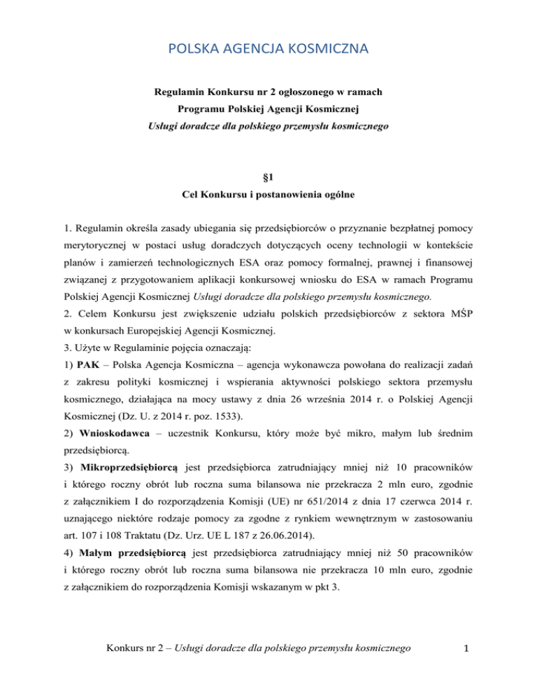 POLSKA AGENCJA KOSMICZNA Regulamin Konkursu nr 2 ogłoszonego w ramach Programu Polskiej Agencji Kosmicznej Usługi doradcze dla polskiego przemysłu kosmicznego §1 Cel Konkursu i postanowienia ogólne 1. Regulamin określa zasady ubiegania się przedsiębiorców o przyznanie bezpłatnej pomocy merytorycznej w postaci usług doradczych dotyczących oceny technologii w kontekście planów i zamierzeń technologicznych ESA oraz pomocy formalnej, prawnej i finansowej związanej z przygotowaniem aplikacji konkursowej wniosku do ESA w ramach Programu Polskiej Agencji Kosmicznej Usługi doradcze dla polskiego przemysłu kosmicznego. 2. Celem Konkursu jest zwiększenie udziału polskich przedsiębiorców z sektora MŚP w konkursach Europejskiej Agencji Kosmicznej. 3. Użyte w Regulaminie pojęcia oznaczają: 1) PAK – Polska Agencja Kosmiczna – agencja wykonawcza powołana do realizacji zadań z zakresu polityki kosmicznej i wspierania aktywności polskiego sektora przemysłu kosmicznego, działająca na mocy ustawy z dnia 26 września 2014 r. o Polskiej Agencji Kosmicznej (Dz. U. z 2014 r. poz. 1533). 2) Wnioskodawca – uczestnik Konkursu, który może być mikro, małym lub średnim przedsiębiorcą. 3) Mikroprzedsiębiorcą jest przedsiębiorca zatrudniający mniej niż 10 pracowników i którego roczny obrót lub roczna suma bilansowa nie przekracza 2 mln euro, zgodnie z załącznikiem I do rozporządzenia Komisji (UE) nr 651/2014 z dnia 17 czerwca 2014 r. uznającego niektóre rodzaje pomocy za zgodne z rynkiem wewnętrznym w zastosowaniu art. 107 i 108 Traktatu (Dz. Urz. UE L 187 z 26.06.2014). 4) Małym przedsiębiorcą jest przedsiębiorca zatrudniający mniej niż 50 pracowników i którego roczny obrót lub roczna suma bilansowa nie przekracza 10 mln euro, zgodnie z załącznikiem do rozporządzenia Komisji wskazanym w pkt 3. Konkurs nr 2 – Usługi doradcze dla polskiego przemysłu kosmicznego 1 POLSKA AGENCJA KOSMICZNA 5) Średnim przedsiębiorcą jest przedsiębiorca zatrudniający mniej niż 250 pracowników i którego roczny obrót nie przekracza 50 mln euro lub roczna suma bilansowa nie przekracza 43 mln euro, zgodnie z załącznikiem do rozporządzenia Komisji, o którym mowa w pkt. 3. 6) Wniosek – wniosek o finansowanie usług doradczych złożony w Konkursie, którego wzór stanowi załącznik nr 1 do Regulaminu. 7) Beneficjent – Wnioskodawca, który w wyniku rozstrzygnięcia Konkursu uzyskał z PAK nieodpłatne wsparcie merytoryczne. 8) ESA – Europejska Agencja Kosmiczna. §2 Beneficjenci Programu 1. Wsparcie może być udzielone mikroprzedsiębiorcy, małemu lub średniemu przedsiębiorcy, który posiada siedzibę, a w przypadku przedsiębiorcy będącego osobą fizyczną - miejsce zamieszkania, na terytorium Rzeczypospolitej Polskiej. 2. Wsparcie nie może być udzielone: a) przedsiębiorcy, który nie posiada siedziby, a w przypadku przedsiębiorcy będącego osobą fizyczną - miejsca zamieszkania na terytorium Rzeczypospolitej Polskiej, b) przedsiębiorcy, który nie spełnia warunków dla mikro, małych i średnich przedsiębiorstw określonych w załączniku I do rozporządzenia Komisji (UE) nr 651/2014 z dnia 17 czerwca 2014 r. uznającego niektóre rodzaje pomocy za zgodne z rynkiem wewnętrznym w zastosowaniu art. 107 i 108 Traktatu (Dz. Urz. UE L 187 z 26.06.2014 r., str. 1), c) przedsiębiorcy będącemu osobą fizyczną, jeżeli został skazany prawomocnym wyrokiem za przestępstwo składania fałszywych zeznań, przekupstwa, przeciwko mieniu, wiarygodności dokumentów, obrotowi pieniędzmi i papierami wartościowymi, obrotowi gospodarczemu, systemowi bankowemu, karno-skarbowe albo inne związane z wykonywaniem działalności gospodarczej lub popełnione w celu osiągnięcia korzyści majątkowych, d) podmiotowi niebędącemu osobą fizyczną, jeżeli członek jego organów zarządzających bądź wspólnik spółki osobowej został skazany prawomocnym wyrokiem za przestępstwa, o których mowa w pkt. 2 c), Konkurs nr 2 – Usługi doradcze dla polskiego przemysłu kosmicznego 2 POLSKA AGENCJA KOSMICZNA e) podmiotowi, który posiada zaległości z tytułu należności publicznoprawnych lub pozostaje pod zarządem komisarycznym bądź znajduje się w toku likwidacji albo postępowania upadłościowego. 3. W celu potwierdzenia spełniania powyższych kryteriów Wnioskodawca składa stosowne oświadczenia, zawarte we wniosku o udzielenie wsparcia. W przypadku wątpliwości, PAK może wezwać Wnioskodawcę do przedstawienia dokumentów, które potwierdzą zgodność ww. oświadczeń ze stanem faktycznym i prawnym. 4. Wzięcie udziału w Konkursie jest równoznaczne z akceptacją niniejszego Regulaminu. §3 Obszar i zakres wsparcia 1. Wsparcie dotyczy usług doradczych i eksperckich związanych z przygotowaniem polskich przedsiębiorców do aplikacji w konkursach ESA, w tym szczególnie w ramach Polish Industry Incentive Scheme. 2. PAK realizując zalecenia ESA Joint ESA/Poland 2015 Mid Term Review: Main Results and Recommendations, oferuje bezpłatną pomoc merytoryczną w postaci usług doradczych dotyczących oceny technologii wskazanej we wniosku Benficjenta w kontekście planów i zamierzeń technologicznych ESA oraz usług doradczych obejmujących podstawowy zakres pomocy formalnej, prawnej i finansowej związanej z przygotowaniem przez przedsiębiorcę aplikacji konkursowej wniosku do ESA. 3. Usługi doradcze świadczone są przez ekspertów PAK w postaci konsultacji ustnych. 4. Jednostką czasu dla konsultacji jest 1 godzina zegarowa. 5. Każdy z Beneficjentów może uzyskać wsparcie w liczbie 7 godzin usług doradczych z zakresu oceny technologii w kontekście planów i zamierzeń technologicznych ESA i 3 godzin pomocy prawnej, formalnej i finansowej. 6. Beneficjent może samodzielnie zdecydować o proporcjach w ramach świadczonych usług z zakresu pomocy prawnej, formalnej i finansowej, tj. wybrać dowolną liczbę godzin pomocy prawnej, form