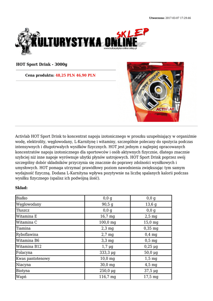 Utworzono: 2017-03-07 17:29:46 HOT Sport Drink - 3000g Cena produktu: 48,25 PLN 46,90 PLN Activlab HOT Sport Drink to koncentrat napoju izotonicznego w proszku uzupełniający w organiźmie wodę, elektrolity, węglowodany, L-Karnitynę i witaminy, szczególnie polecany do spożycia podczas intensywnych i długotrwałych wysiłków fizycznych. HOT jest jednym z najlepiej opracowanych koncentratów napoju izotonicznego dla sportowców i osób aktywnych fizycznie, dlatego znacznie szybciej niż inne napoje wyrównuje ubytki płynów ustrojowych. HOT Sport Drink poprzez swój szczególny dobór składników przyczynia się znacznie do poprawy zdolności wysiłkowych i umysłowych. HOT pomaga utrzymać prawidłowy poziom nawodnienia zwiększając tym samym wydajność fizyczną. Dodana L-Karnityna wpływa pozytywnie na liczbę spalanych kalorii podczas wysiłku fizycznego (spalisz ich podwójną ilość). Skład: Białko 0,0 g 0,0 g Węglowodany 90,5 g 13,6 g Tłuszcz 0,0 g 0,0 g Witamina E 16,7 mg 2,5 mg Witamina C 100,0 mg 15,0 mg Tiamina 2,3 mg 0,35 mg Ryboflawina 2,7 mg 0,4 mg Witamina B6 3,3 mg 0,5 mg Witamina B12 1,7 μg 0,25 μg Folacyna 333,3 μg 50,0 μg Kwas pantotenowy 10,0 mg 1,5 mg Niacyna 30,0 mg 4,5 mg Biotyna 250,0 μg 37,5 μg Wapń 116,7 mg 17,5 mg Magnez 50,0 mg 7,5 mg Sód 533,3 mg 80,0 mg Potas 479,3 mg 71,9 mg L-Karnityna 333,3 mg 50,0 mg Dawkowanie: 15 g koncentratu rozpuścić w 200 ml wody. 37 g koncentratu rozpuścić w 500 ml wody. Zalecane dawkowanie: ● ● ● przed wysiłkiem - około 500 ml płynu na 1 godz. przed wysiłkiem podczas wysiłku - około 1000 ml na każdą godzinę ćwiczeń po wysiłku - ponad 1000 ml płynu do dwóch godzin po ćwiczeniach. Adres: http://www.ko.sklep.pl/ Telefon: kom. 782 010 880 Email: [email protected]