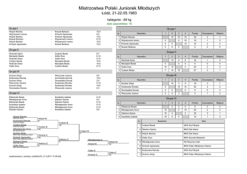 Mistrzostwa Polski Juniorek Młodszych Łódź, 21-22.05.1983 kategoria: -48 kg ilość zawodników: 16 Grupa I Grupa I Wójcik Mariola Wojnarowicz Iwona Wójcik Mariola Nowak Barbara Wójcik Mariola Kmiecik Agnieszka - Nowak Barbara Kmiecik Agnieszka Kmiecik Agnieszka Wojnarowicz Iwona Wojnarowicz Iwona Nowak Barbara 10:0 0:5 10:0 0:10 10:0 10:0 lp. Nazwisko 1 1 Wójcik Mariola - Czaban Beata Gołko Ewa Gołko Ewa Maciążek Beata Maciążek Beata Czaban Beata - Wieczorek Joanna Gromadzka Dorota Gromadzka Dorota Kozłowska Renata Kozłowska Renata Wieczorek Joanna Wójcik Mariola MKS Żak Kielce Kozłowska Renata GKS Gryf Słupsk Czaban Beata GKS Gryf Słupsk Mikołajewska Anna KS Resursa Łódź Suchan Alicja MKS Pałac Młodzieży Kraków Kmiecik Agnieszka MKS Pałac Młodzieży Kraków Siekiera Sylwia MKS Żak Kielce Gołko Ewa BKS Gwardia Białystok - Wójcik M. 5 Czaban B. 10 Kmiecik A. 10 Siekiera S. 5 wydrukowano z serwisu JudoStat.PL (7.3.2017 17:29.49) Kmiecik A. 10 1 3 10 15 2 2 0 0 4 4 Nowak Barbara 0 0 Nazwisko 1 0 2 3 4 Punkty Zwycięstwa Miejsce 10 0 0 10 1 3 0 0 0 0 4 0 20 2 2 27 3 1 4 Punkty Zwycięstwa Miejsce 3 5 18 3 1 10 10 20 2 2 0 0 0 4 3 1 3 2 Maciążek Beata 0 3 Gołko Ewa 10 10 4 Czaban Beata 7 10 Nazwisko 1 1 Suchan Alicja 2 10 2 Kozłowska Renata 0 3 Gromadzka Dorota 0 0 4 Wieczorek Joanna 0 0 10 3 3 Grupa IV lp. Nazwisko 1 1 Elżbieciak Beata Czaban B. 7 Gołko E. 10 5 Wójcik M. 10 Gołko E. 10 2 3 4 Punkty Zwycięstwa Miejsce 0 0 0 0 0 4 0 10 20 2 2 5 20 3 1 10 1 3 2 Mikołajewska Anna 10 3 Siekiera Sylwia 10 5 4 Kozielska Izabela 10 0 lp. Wójcik M. 1 0 Grupa III 0:10 0:5 0:10 0:10 0:10 5:0 Mikołajewska A. Miejsce 3 0 lp. Czaban B. 10 Siekiera S. 7 Zwycięstwa 30 3 Kmiecik Agnieszka 1 Woźniak Daria 5:0 10:0 3:0 0:10 10:0 0:3 Kozielska Izabela Siekiera Sylwia Siekiera Sylwia Mikołajewska Anna Mikołajewska Anna Kozielska Izabela Punkty 0 lp. Grupa IV Elżbieciak Beata Mikołajewska Anna Elżbieciak Beata Kozielska Izabela Elżbieciak Beata Siekiera Sylwia 4 10 Grupa II 0:7 0:10 0:10 10:0 10:0 0:10 Grupa III Suchan Alicja Kozłowska Renata Suchan Alicja Wieczorek Joanna Suchan Alicja Gromadzka Dorota 3 10 2 Wojnarowicz Iwona Grupa II Woźniak Daria Maciążek Beata Woźniak Daria Czaban Beata Woźniak Daria Gołko Ewa 2 10 0 Nazwisko Klub 1 Czaban Beata GKS Gryf Słupsk 2 Siekiera Sylwia MKS Żak Kielce 3 Wójcik Mariola MKS Żak Kielce 3 Gołko Ewa BKS Gwardia Białystok 5 Mikołajewska Anna KS Resursa Łódź 5 Kmiecik Agnieszka MKS Pałac Młodzieży Kraków 7 Kozłowska Renata GKS Gryf Słupsk 7 Suchan Alicja MKS Pałac Młodzieży Kraków