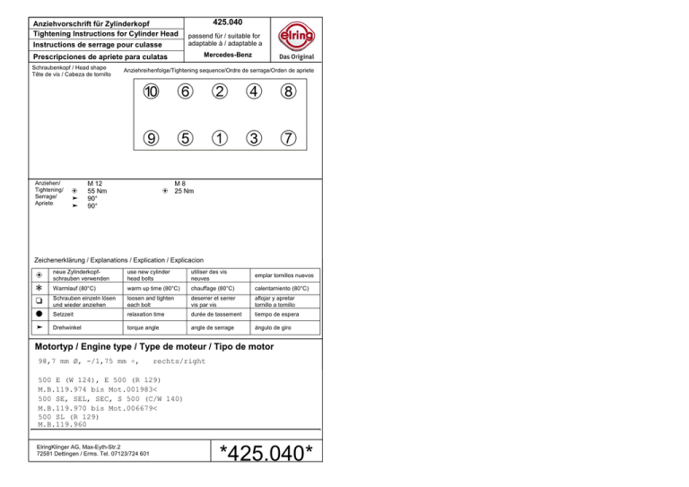 Anziehvorschrift für Zylinderkopf Tightening Instructions for Cylinder Head Instructions de serrage pour culasse 425.040 passend für / suitable for adaptable à / adaptable a Mercedes-Benz Prescripciones de apriete para culatas Schraubenkopf / Head shape Tête de vis / Cabeza de tornillo Anziehen/ Tightening/ Serrage/ Apriete E ³ ³ Anziehreihenfolge/Tightening sequence/Ordre de serrage/Orden de apriete M 12 55 Nm 90° 90° M8 E 25 Nm Zeichenerklärung / Explanations / Explication / Explicacion E neue Zylinderkopfschrauben verwenden 4 Warmlauf (80°C) R Schrauben einzeln lösen und wieder anziehen O Setzzeit ³ Drehwinkel use new cylinder head bolts utiliser des vis neuves emplar tornillos nuevos warm up time (80°C) chauffage (80°C) calentamiento (80°C) loosen and tighten each bolt deserrer et serrer vis par vis aflojar y apretar tornillo a tornillo relaxation time durée de tassement tiempo de espera torque angle angle de serrage ángulo de giro Motortyp / Engine type / Type de moteur / Tipo de motor 98,7 mm Ø, -/1,75 mm ÷, rechts/right 500 E (W 124), E 500 (R 129) M.B.119.974 bis Mot.001983< 500 SE, SEL, SEC, S 500 (C/W 140) M.B.119.970 bis Mot.006679< 500 SL (R 129) M.B.119.960 ElringKlinger AG, Max-Eyth-Str.2 72581 Dettingen / Erms. Tel. 07123/724 601 *425.040*