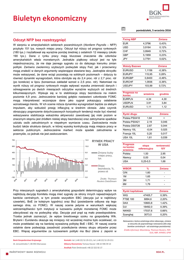 Biuletyn ekonomiczny poniedziałek, 5 września 2016 Odczyt NFP bez rozstrzygnięć Fixing NBP W sierpniu w amerykańskich sektorach pozarolniczych (Nonfarm Payrolls – NFP) przybyło 151 tys. nowych miejsc pracy. Odczyt był niższy od prognoz rynkowych (180 tys.) i kształtował się wyraźnie poniżej średniej z ostatnich 12 miesięcy (około 190 tys.). Dane z rynku pracy mają kluczowe znaczenie dla członków amerykańskich władz monetarnych. Jednakże piątkowy odczyt jest na tyle niejednoznaczny, że nie daje jasnego sygnału co do dalszego kierunku zmian polityki. Zarówno zwolennicy szybszych podwyżek stopy Fed, jak i przeciwnicy mogą znaleźć w danych argumenty wspierające stawiane tezy. Jastrzębie skrzydło może wskazywać, że dane wciąż pozostają na solidnych poziomach – dotyczy to również dynamiki wynagrodzeń, która obniżyła się do 2,4 proc. rdr z 2,7 proc. rdr (po korekcie) w lipcu (konsensus zakładał wzrost o 2,5 proc. rdr). Natomiast na wynik niższy od prognoz rynkowych mogła wpływać wysoka zmienność danych i odreagowanie po dwóch miesiącach odczytów wyraźnie wyższych od średnich kilkumiesięcznych. Wpisuje się w to stabilizacja stopy bezrobocia na niskim poziomie 4,9 proc. Jednocześnie bardziej gołębio nastawieni członkowie FOMC mogą interpretować wczorajsze dane jako sygnał pokazujący osłabienie wzrostowego trendu. W ich ocenie niższa dynamika wynagrodzeń będzie za słabym impulsem, aby wzbudzić presję inflacyjną w średnim okresie. Jako czynnik obrazujący pogorszenie dotychczasowych korzystnych tendencji może być również wskazywana stabilizacja wskaźnika aktywności zawodowej (jej niski poziom w znacznym stopniu jest źródłem niskiej stopy bezrobocia) oraz zatrzymanie spadków udziału osób zatrudnionych w niepełnym wymiarze czasu. Zastrzeżenia może budzić także struktura danych, w której wysoką kontrybucję mają miejsca pracy w sektorze publicznym. Jednocześnie martwić może spadek zatrudnienia w przemyśle, co jednak nie jest zaskoczeniem. EUR 4,3796 0,43% USD 3,9164 0,12% CHF 3,9949 0,72% GBP 5,1959 0,23% JPY 3,7791 0,02% 750 12,0 600 10,0 450 8,0 300 6,0 RYNEK PRACY W USA Zmiana liczby miejsc pracy, tys. Waluty Bazowe 4,0 0 2,0 -150 0,0 Stopa bezrobocia, %, prawa oś Źródło: Thomson Reuters DataStream Przy mieszanych sygnałach z amerykańskiej gospodarki determinujący wpływ na najbliższą decyzję Komitetu mogą mieć sygnały ze strony innych najważniejszych banków centralnych, w tym przede wszystkim EBC (decyzja już w najbliższy czwartek), BoE (w kolejnym tygodniu) oraz BoJ (posiedzenie odbywa się tego samego dnia, co FOMC). W naszej ocenie jedynie w warunkach większej wstrzemięźliwości tych instytucji w luzowaniu polityki monetarnej FOMC może zdecydować się na podwyżkę stóp. Decyzje pod prąd są mało prawdopodobne. Trzeba jednak zaznaczyć, że wpływ brexitowego szoku na gospodarkę Wlk. Brytanii i Eurolandu okazuje się mniejszy niż wcześniej można było oczekiwać, co może przekładać się na bardziej wyważoną politykę BoE i EBC. W naszej ocenie ostatnie dane podważają zasadność przedłużenia okresu skupu aktywów przez EBC. Więcej argumentów za luzowaniem polityki ma BoJ (dane z Japonii w Bank Gospodarstwa Krajowego Kontakt: tel. (+48 22) 52-29-211, tel. (+48 22) 52-29-211 Al. Jerozolimskie 7, 00-955 Warszawa Główny Ekonomista Tomasz Kaczor +48 22 596 59 13 Analityk Piotr Dmitrowski +48 22 522 92 17 Zmiana EURUSD 1,1156 EURJPY 115,95 0,28% EURGBP 0,8400 -0,46% EURCHF 1,0936 -0,36% USDJPY 103,99 0,72% Prognoza na koniec EURPLN -0,38% września grudnia 4,34 4,30 USDPLN 3,91 3,84 EURUSD 1,11 1,12 Rynki długu Zmiana Polska PS0418 1,64 = Polska PS0421 2,19 0,046 Polska DS0726 2,87 0,044 Niemcy 10L -0,04 0,025 Francja 10L 0,20 0,017 USA 10L 1,61 0,039 Prognoza na koniec września Polska stopa referencyjna rentowność 10Y 1,50 2,95 0,00 0,04 0,25-0,5 1,68 Niemcy USA 150 Zmiana WIBOR % Zmiana O/N 1,60 - 1M 1,65 - 3M 1,71 - 6M 1,79 - Rynki kapitałowe Zmiana WIG 47405,7 0,39% FTSE 100 6894,6 2,20% DAX 10683,8 1,42% DJI 18492,0 0,39% NIKKEI 17037,6 0,66% Szanghaj 3073,5 0,20% Notowania z końca ostatniego dnia roboczego, zmiana w stosunku do poprzedniego notowania (dla stóp banków centralnych - od ostatniego posiedzenia). Źródła informacji: Bloomberg, Thomson Reuters, PAP, GUS, NBP, NYMEX, GPW 1 Biuletyn ekonomiczny poniedziałek, 5 września 2016 poziomy przekraczające 4,39. Później jednak słabszy od oczekiwań odczyt uspokoił nastroje i zapewnił powrót poniżej 4,36. W naszej ocenie wyższe prawdopodobieństwo podwyżki stopy Fed zostało przez krajowy rynek walutowy zdyskontowane już wcześniej. Tak więc jego obecne poziomy (ponad 30 proc. na wrzesień) nie powinny oddziaływać w kierunku osłabienia krajowej waluty. Jednocześnie w kierunku umocnienia złotego oddziaływać mogą oczekiwania związane z posiedzeniem RPP (zapewne zostanie utrzymany sceptyczny wobec obniżek ton komunikatu) oraz nadchodzące odczyty makro (spodziewamy się poprawy danych za sierpień). Nie wykluczamy także pozytywnego wpływu nadziei związanych z EBC. Dobre uwarunkowania dla złotego tworzy też sytuacja na rynkach kapitałowych – ubiegły piątek giełdy w USA kończyły na plusach, a dobre nastroje trzymają się również dzisiaj na rynkach azjatyckich, co też nie pozostaje bez wpływu na WIG. W efekcie możliwe są próby zejścia EURPLN poniżej 4,35. Niemniej czynnikiem ryzyka dla wartości złotego pozostają oceny agencji ratingowych, w tym przede wszystkim Moody’s (decyzja zostanie podana w piątek), jak również to, że wyniki EBC mogą rozczarować inwestorów. Wskutek tego ewentualne umocnienie złotego w pierwszej części tygodnia może nie utrzymać się do jego końca. ostatnim czasie przeważnie rozczarowują). Jednak BoJ ma bardzo mało przestrzeni do dalszych działań. W efekcie uwarunkowania zewnętrzne, do czego możemy równi