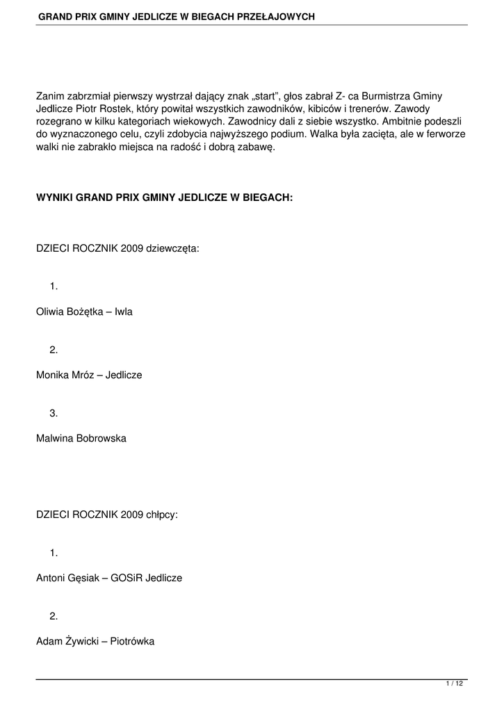 GRAND PRIX GMINY JEDLICZE W BIEGACH PRZEŁAJOWYCH Zanim zabrzmiał pierwszy wystrzał dający znak „start”, głos zabrał Z- ca Burmistrza Gminy Jedlicze Piotr Rostek, który powitał wszystkich zawodników, kibiców i trenerów. Zawody rozegrano w kilku kategoriach wiekowych. Zawodnicy dali z siebie wszystko. Ambitnie podeszli do wyznaczonego celu, czyli zdobycia najwyższego podium. Walka była zacięta, ale w ferworze walki nie zabrakło miejsca na radość i dobrą zabawę. WYNIKI GRAND PRIX GMINY JEDLICZE W BIEGACH: DZIECI ROCZNIK 2009 dziewczęta: 1. Oliwia Bożętka – Iwla 2. Monika Mróz – Jedlicze 3. Malwina Bobrowska DZIECI ROCZNIK 2009 chłpcy: 1. Antoni Gęsiak – GOSiR Jedlicze 2. Adam Żywicki – Piotrówka 1 / 12 GRAND PRIX GMINY JEDLICZE W BIEGACH PRZEŁAJOWYCH PRZEDSZKOLAKI rocznik 2007-2008 chłopcy 1. Sebastian Garbowski – SP Klimkówka 2. Bartosz Bil – MUKS Jedlicze 3. Paweł Korzeniowski – SP Żarnowiec 4. Błazej Smolik – Krosno PRZEDSZKOLAKI rocznik 2007-2008 dziewczęta 1. Nikola Jastrząb – GOSiR Jedlicze 2. Gabriela Wajda - Jedlicze 2 / 12 GRAND PRIX GMINY JEDLICZE W BIEGACH PRZEŁAJOWYCH KLASA I i II rocznik 2005-2006 dziewczęta 1. Dominika Hawrot – KB Krościenko Wyżne 2. Milena Kołek – Kopytowa 3. Julia Cholewiak – GOSIR Jedlicze 4. Nikola Mróz – MUKS Jedlicze 5. Aleksandra Trybus – Jedlicze 6. Amelia Bożek – Długie 7. Eliza Kozioł – Potok KLASA I i II rocznik 2005-2006 chłopcy 1. 3 / 12 GRAND PRIX GMINY JEDLICZE W BIEGACH PRZEŁAJOWYCH Gabriel Buczyński – Dobrucowa 2. Kamil Bobrowski – GOSiR Jedlicze KLASA III i IV rocznik 2003-2004 dziewczęta 1. Sandra Rymar – KB Krościenko Wyżne 2. Weronika Bil – MUKS Jedlicze 3. Wiktoria Wosiewicz – MUKS Jedlicze 4. Marlena Kuliga – MKS Halicz Ustrzyki Dolne 5. Emilia Kozioł – Potok KLASA III i IV rocznik 2003-2004 chłopcy 1. 4 / 12 GRAND PRIX GMINY JEDLICZE W BIEGACH PRZEŁAJOWYCH Szymon Rygiel – Klimkówka 2. Mikołaj Gerlach – KB Krościenko Wyżne 3. Jakub Korzeniowski – Żarnowiec 4. Bartosz Klekot – Nafta Jedlicze 5. Kacper Pomprowicz – MUKS Jedlicze 6. Witold Cygan – GOSiR Jedlicze 7. Michał Janocha – MUKS Jedlicze 8. Szymon Wietecha – Jedlicze 9. Jakub Buczyński – Dobrucowa 10. Tymoteusz Och – MUKS Jedlicze 5 / 12 GRAND PRIX GMINY JEDLICZE W BIEGACH PRZEŁAJOWYCH 11. Jakub Wajda – MUKS Jedlicze 12. Norbert Jastrząb – GOSiR Jedlicze 13. Kamil Maciejowski – MUKS Jedlicze 14. Kamil Mróz – MUKS Jedlicze KLASA V i VI rocznik 2001-2002 dziewczęta 1. Oliwia Rachwalska – KKB MOSiR Krosno 2. Emilia Bożek – KB Krościenko Wyżne 3. Weronika Kołek – KKB MOSiR Krosno 4. Karina Hawrot – KB Krościenko Wyżne 6 / 12 GRAND PRIX GMINY JEDLICZE W BIEGACH PRZEŁAJOWYCH 5. Sara Płaziak – GOSiR Jedlicze 6. Paulina Cholewiak – GOSiR Jedlicze 7. Daria Sowa – KB Krościenko Wyżne KLASA V i VI rocznik 2001-2002 chłopcy 1. Mateusz Szewczyk – LUKS Burza Rogi 2. Bartosz Wietecha – GOSiR Jedlicze 3. Mateusz Penczar – Jedlicze 4. Kamil Zając GIMNAZJUM rocznik 1998-2000 chłopcy 7 / 12 GRAND PRIX GMINY JEDLICZE W BIEGACH PRZEŁAJOWYCH 1. Wojciech Gęsiak – GOSiR Jedlicze 2. Kamil Mezglewski – KB Krościenko Wyżne 3. Mateusz Kuliga – MKS Halicz Ustrzyki Dolne 4. Kacper Gęsiak – GOSiR Jedlicze 5. Bartosz Bożek – TEAM Jedlicze 6. Kacper Goleń – TEAM Jedlicze 7. Patryk Szyndlar – Jedlicze GIMNAZJUM rocznik 1998-2000 dziewczęta 1. Aleksandra Szewczyk – LUKS Burza Rogi 8 / 12 GRAND PRIX GMINY JEDLICZE W BIEGACH PRZEŁAJOWYCH 2. Paulina Pomprowicz – MUKS Jedlicze 3. Justyna Augustyn – MKS Halicz Ustrzyki Dolne 4. Katarzyna Gładysz – MUKS Jedlicze 5. Klaudia Janas – MUKS Jedlicze 6. Aleksandra Gleń – MUKS Jedlicze 7. Julia Głowacka SZKOŁY PONADGIMNAZJALNE rocznik 1997-1995 chłopcy 1. Wojciech Pelczar – MUKS Jedlicze 2. Michał Płaziak – GOSiR Jedlicze 9 / 12 GRAND PRIX GMINY JEDLICZE W BIEGACH PRZEŁAJOWYCH SZKOŁY PONADGIMNAZJALNE rocznik 1997-1995 dziewczęta 1. Aneta Kubit – KKB MOSiR Krosno 2. Katarzyna Smolik – GOSiR Jedlicze OPEN PANIE: 1. Joanna Bielec – MKS Halicz Ustrzyki Dolne 2. Martyna Lachowska – MKS Halicz Ustrzyki Dolne 3. Agnieszka Janocha – MUKS Jedlicze 4. Gabriela Mróz – KKB MOSiR Krosno 5. Agnieszka Pomprowicz – MUKS Jedlicze 10 / 12 GRAND PRIX GMINY JEDLICZE W BIEGACH PRZEŁAJOWYCH 6. Jolanta Pelczar – MUKS Jedlicze 7. Iwona Bil – MUKS Jedlicze OPEN PANOWIE: 1. Patryk Lachowski – MKS Halicz Ustrzyki Dolne 2. Łukasz Medejczyk – KKB MOSiR Krosno 3. Mateusz Haczela – MUKS Jedlicze 4. Robert Gleń – MUKS Jedlicze 5. Michał Płaziak – GOSiR Jedlicze 6. Wojciech Pelczar – MUKS Jedlicze 11 / 12 GRAND PRIX GMINY JEDLICZE W BIEGACH PRZEŁAJOWYCH 7. Ryszard Głowacki – KKB MOSiR Krosno 8. Sylwester Kozioł – KKB MOSiR Krosno 9. Łukasz Janocha – Jedlicze Team 10. Piotr Bil – MUKS Jedlicze 11. Łukasz Janocha - Dobieszyn 12 / 12