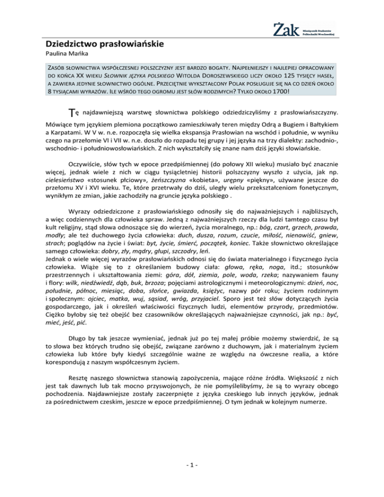 Dziedzictwo prasłowiańskie Paulina Mańka ZASÓB SŁOWNICTWA WSPÓŁCZESNEJ POLSZCZYZNY JEST BARDZO BOGATY. NAJPEŁNIEJSZY I NAJLEPIEJ OPRACOWANY DO KOŃCA XX WIEKU SŁOWNIK JĘZYKA POLSKIEGO WITOLDA DOROSZEWSKIEGO LICZY OKOŁO 125 TYSIĘCY HASEŁ, A ZAWIERA JEDYNIE SŁOWNICTWO OGÓLNE. PRZECIĘTNIE WYKSZTAŁCONY POLAK POSŁUGUJE SIĘ NA CO DZIEŃ OKOŁO 8 TYSIĄCAMI WYRAZÓW. ILE WŚRÓD TEGO OGROMU JEST SŁÓW RODZIMYCH? TYLKO OKOŁO 1700! Tę najdawniejszą warstwę słownictwa polskiego odziedziczyliśmy z prasłowiańszczyzny. Mówiące tym językiem plemiona początkowo zamieszkiwały teren między Odrą a Bugiem i Bałtykiem a Karpatami. W V w. n.e. rozpoczęła się wielka ekspansja Prasłowian na wschód i południe, w wyniku czego na przełomie VI i VII w. n.e. doszło do rozpadu tej grupy i jej języka na trzy dialekty: zachodnio-, wschodnio- i południowosłowiańskich. Z nich wykształciły się znane nam dziś języki słowiańskie. Oczywiście, słów tych w epoce przedpiśmiennej (do połowy XII wieku) musiało być znacznie więcej, jednak wiele z nich w ciągu tysiącletniej historii polszczyzny wyszło z użycia, jak np. cielesieństwo «stosunek płciowy», żeńszczyzna «kobieta», urępny «piękny», używane jeszcze do przełomu XV i XVI wieku. Te, które przetrwały do dziś, uległy wielu przekształceniom fonetycznym, wynikłym ze zmian, jakie zachodziły na gruncie języka polskiego . Wyrazy odziedziczone z prasłowiańskiego odnosiły się do najważniejszych i najbliższych, a więc codziennych dla człowieka spraw. Jedną z najważniejszych rzeczy dla ludzi tamtego czasu był kult religijny, stąd słowa odnoszące się do wierzeń, życia moralnego, np.: bóg, czart, grzech, prawda, modły; ale też duchowego życia człowieka: duch, dusza, rozum, czucie, miłość, nienawiść, gniew, strach; poglądów na życie i świat: byt, życie, śmierć, początek, koniec. Także słownictwo określające samego człowieka: dobry, zły, mądry, głupi, szczodry, leń. Jednak o wiele więcej wyrazów prasłowiańskich odnosi się do świata materialnego i fizycznego życia człowieka. Wiąże się to z określaniem budowy ciała: głowa, ręka, noga, itd.; stosunków przestrzennych i ukształtowania ziemi: góra, dół, ziemia, pole, woda, rzeka; nazywaniem fauny i flory: wilk, niedźwiedź, dąb, buk, brzoza; pojęciami astrologicznymi i meteorologicznymi: dzień, noc, południe, północ, miesiąc, doba, słońce, gwiazda, księżyc, nazwy pór roku; życiem rodzinnym i społecznym: ojciec, matka, wuj, sąsiad, wróg, przyjaciel. Sporo jest też słów dotyczących życia gospodarczego, jak i określeń właściwości fizycznych ludzi, elementów przyrody, przedmiotów. Ciężko byłoby się też obejść bez czasowników określających najważniejsze czynności, jak np.: być, mieć, jeść, pić. Długo by tak jeszcze wymieniać, jednak już po tej małej próbie możemy stwierdzić, że są to słowa bez których trudno się obejść, związane zarówno z duchowym, jak i materialnym życiem człowieka lub które były kiedyś szczególnie ważne ze względu na ówczesne realia, a które korespondują z naszym współczesnym życiem. Resztę naszego słownictwa stanowią zapożyczenia, mające różne źródła. Większość z nich jest tak dawnych lub tak mocno przyswojonych, że nie pomyślelibyśmy, że są to wyrazy obcego pochodzenia. Najdawniejsze zostały zaczerpnięte z języka czeskiego lub innych języków, jednak za pośrednictwem czeskim, jeszcze w epoce przedpiśmiennej. O tym jednak w kolejnym numerze. -1-