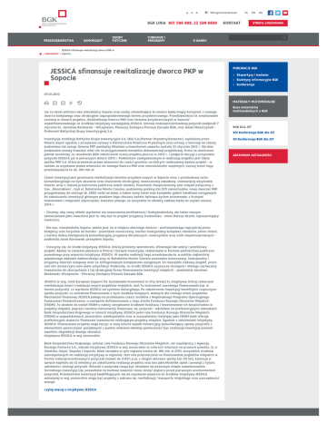 A A A Wersja kontrastowa BGK LINIA 801 598 888, 22 599 8888 PRZEDSIĘBIORSTWA SAMORZĄDY OSOBY FIZYCZNE FUNDUSZE I PROGRAMY PL KONTAKT EN RU STREFA LOGOWANIA O BANKU JESSICA sfinansuje rewitalizację dworca PKP w AktualnościSopocie JESSICA sfinansuje rewitalizację dworca PKP w Sopocie PUBLIKACJE BGK Ekspertyzy i badania Biuletyny informacyjne BGK Konferencje 07.01.2013 PDF Już za około półtora roku mieszkańcy Sopotu oraz osoby odwiedzające to miasto będą mogły korzystać z nowego dworca kolejowego oraz atrakcyjnie zagospodarowanego terenu przydworcowego. Przedsięwzięcia te zrealizowane zostaną w ramach projektu „Rewitalizacja Dworca PKP oraz terenów przydworcowych w Sopocie", współfinansowanego ze środków inicjatywy europejskiej JESSICA. Umowę niskooprocentowanej pożyczki podpisali 7 stycznia br.: Jarosław Bełdowski - Wiceprezes, Pierwszy Zastępca Prezesa Zarządu BGK, oraz Adam Meszczyński Prokurent Bałtyckiej Grupy Inwestycyjnej S.A. Inwestycję zrealizuje Bałtycka Grupa Inwestycyjna S.A. (BGI S.A./Partner Prywatny/Inwestor), wyłoniona przez Miasto Sopot zgodnie z przepisami ustawy o Partnerstwie Publiczno-Prywatnym oraz ustawy o koncesji na roboty budowlane lub usługi. Umowa PPP pomiędzy Miastem a Inwestorem zawarta została 23 stycznia 2012 r. Od dnia podpisania umowy Inwestor miał rok na przygotowanie kompletu dokumentacji projektowej. Prace te ukończono jednak wcześniej, co umożliwiło BGK zakończenie oceny projektu jeszcze w 2012 r. i podjęcie decyzji o przyznaniu pożyczki JESSICA już w pierwszych dniach 2013 r. Podmiotem zaangażowanym w realizację projektu jest także spółka PKP S.A. która przeniesie prawa własności do części gruntów, na których realizowany będzie projekt - w zamian za uzyskanie prawa własności do nowego Dworca PKP oraz nieruchomości wspólnych. Łączny koszt tego przedsięwzięcia to ok. 100 mln zł. Celem inwestycji jest gruntowna rewitalizacja terenów przydworcowych w Sopocie wraz z przebudową ruchu komunikacyjnego na tym obszarze oraz stworzenie atrakcyjnej, nowoczesnej zabudowy, stanowiącej wizytówkę miasta, wraz z zieloną przestrzenią publiczną wokół obiektu. Powstanie dwupoziomowy plac miejski połączony z tzw. „Monciakiem", czyli ul. Bohaterów Monte Cassino, podziemny parking dla 270 samochodów, nowy dworzec PKP przygotowany do obsługi ok. 5800 osób na dobę, a także nowy hotel oraz kompleks galerii handlowo-usługowych. Po zakończeniu inwestycji głównym punktem tego obszaru będzie tętniąca życiem promenada, z licznymi kawiarniami i miejscami odpoczynku. Inwestor planuje, że wszystkie te obiekty oddane będą do użytku wiosną 2014 r. - Chcemy, aby nowy obiekt wyróżniał się nowoczesną architekturą i funkcjonalnością, ale także naszym zamierzeniem jako inwestora jest to, aby był to projekt przyjazny środowisku - mówi Dariusz Bracik, reprezentujący inwestora. - Dla nas, mieszkańców Sopotu, ważne jest, że w miejscu obecnego dworca - porównywanego najczęściej przez kolejarzy oraz turystów do baraku - powstanie nowoczesny, bardzo funkcjonalny kompleks obiektów, pełen zieleni, z bardzo dobrą dostępnością komunikacyjną, przyjazną dla pieszych, rowerzystów oraz osób niepełnosprawnych podkreśla Jacek Karnowski, prezydent Sopotu. - Cieszymy się, że środki inicjatywy JESSICA, której jesteśmy operatorem, sfinansują tak ważny i prestiżowy projekt. Będzie to zarazem pierwsza w Polsce i Europie inwestycja, realizowana w formule partnerstwa publicznoprywatnego przy wsparciu inicjatywy JESSICA. W wyniku realizacji tego przedsięwzięcia, w pobliżu najbardziej popularnego deptaka nadmorskiego przy ul. Bohaterów Monte Cassino powstanie nowoczesny, funkcjonalny i przyjazny dworzec kolejowy wraz ze zintegrowanym kompleksem usługowym. To niezwykle ciekawy projekt, praca nad nim dostarczyła nam wiele satysfakcji. Podkreślę, że środki JESSICA są jeszcze dostępne i dlatego zachęcamy inwestorów do skorzystania z tej atrakcyjnej formy finansowania inwestycji miejskich - powiedział Jarosław Bełdowski, Wiceprezes - Pierwszy Zastępca Prezesa Zarządu BGK. JESSICA (z ang. Joint European Support for Sustainable Investment in City Areas) to inicjatywa, której celem jest rewitalizacja miast i realizacja innych projektów miejskich. Jest to instrument zwrotnego finansowania (np. w formie pożyczki), co wyróżnia JESSICA od systemu dotacyjnego. Po zakończeniu inwestycji beneficjent rozpoczyna spłatę pożyczki, co umożliwia finansowanie z tych środków kolejnych, ważnych dla rozwoju miast projektów. Mechanizm finansowy JESSICA polega na przekazaniu części środków z Regionalnego Programu Operacyjnego Funduszowi Powierniczemu, a następnie dofinansowaniu z tego źródła Funduszu Rozwoju Obszarów Miejskich (FROM). To właśnie do zadań FROM-u należy zarządzanie środkami funduszu i inwestowanie ich bezpośrednio w projekty miejskie, poprzez zwrotne instrumenty finansowe, np. pożyczki - udzielane na preferencyjnych warunkach. Bank Gospodarstwa Krajowego w ramach Inicjatywy JESSICA pełni rolę Funduszu Rozwoju Obszarów Miejskich (FROM) w województwach: pomorskim, wielkopolskim oraz w mazowieckim. Działając jako FROM bank oferuje preferencyjne wsparcie finansowe inwestorom realizującym projekty miejskie. Zgodnie z założeniami Inicjatywy JESSICA, finansowane projekty mają łączyć w swej istocie aspekt komercyjny (umożliwiający spłatę pożyczki) z elementami społecznymi, pożądanymi z punktu widzenia lokalnej społeczności (np. realizacja inwestycji pozwoli zapobiec degradacji danego obszaru). Inicjatywa JESSICA w woj. pomorskim Bank Gospodarstwa Krajowego, pełniąc rolę Funduszu Rozwoju Obszarów Miejskich, we współpracy z Agencją Rozwoju Pomorza S.A., wdraża Inicjatywę JESSICA w woj. pomorskim w czterech miastach na prawach powiatu, tj. w Gdańsku, Gdyni, Słupsku i Sopocie. Bank zarządza w tym regionie kwotą ok. 