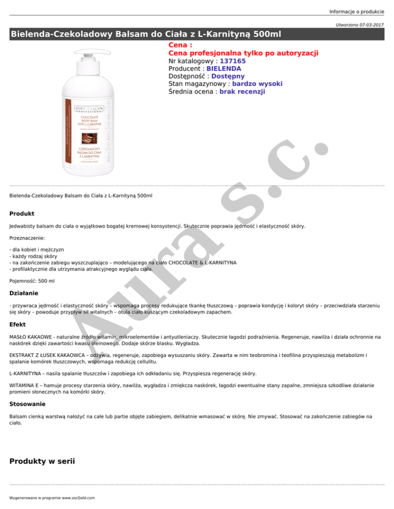 Informacje o produkcie Utworzono 07-03-2017 Bielenda-Czekoladowy Balsam do Ciała z L-Karnityną 500ml Cena : Cena profesjonalna tylko po autoryzacji Bielenda-Czekoladowy Balsam do Ciała z L-Karnityną 500ml Produkt s. c. Nr katalogowy : 137165 Producent : BIELENDA Dostępność : Dostępny Stan magazynowy : bardzo wysoki Średnia ocena : brak recenzji Jedwabisty balsam do ciała o wyjątkowo bogatej kremowej konsystencji. Skutecznie poprawia jędrność i elastyczność skóry. a Przeznaczenie: Au r - dla kobiet i mężczyzn - każdy rodzaj skóry - na zakończenie zabiegu wyszczuplająco – modelującego na ciało CHOCOLATE & L-KARNITYNA - profilaktycznie dla utrzymania atrakcyjnego wyglądu ciała. Pojemność: 500 ml Działanie - przywraca jędrność i elastyczność skóry – wspomaga procesy redukujące tkankę tłuszczową – poprawia kondycję i koloryt skóry – przeciwdziała starzeniu się skóry – powoduje przypływ sił witalnych – otula ciało kuszącym czekoladowym zapachem. Efekt MASŁO KAKAOWE - naturalne źródło witamin, mikroelementów i antyutleniaczy. Skutecznie łagodzi podraźnienia. Regeneruje, nawilża i działa ochronnie na naskórek dzięki zawartości kwasu oleinowego. Dodaje skórze blasku. Wygładza. EKSTRAKT Z ŁUSEK KAKAOWCA – odżywia, regeneruje, zapobiega wysuszaniu skóry. Zawarta w nim teobromina i teofilina przyspieszają metabolizm i spalanie komórek tłuszczowych, wspomaga redukcję cellulitu. L-KARNITYNA – nasila spalanie tłuszczów i zapobiega ich odkładaniu się. Przyspiesza regenerację skóry. WITAMINA E – hamuje procesy starzenia skóry, nawilża, wygładza i zmiękcza naskórek, łagodzi ewentualne stany zapalne, zmniejsza szkodliwe działanie promieni słonecznych na komórki skóry. Stosowanie Balsam cienką warstwą nałożyć na całe lub partie objęte zabiegiem, delikatnie wmasować w skórę. Nie zmywać. Stosować na zakończenie zabiegów na ciało. Produkty w serii Wygenerowano w programie www.oscGold.com a Au r s. c.