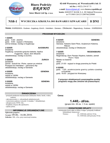 Biuro Podróży BRAWO Inter Block Ltd Sp. z o.o. NS8-1 02-640 Warszawa, ul. Woronicza40A lok 11 tel./fax (+4822) 254 87 73 e-mail: [email protected], www.brawo.republika.pl konto: KREDYT BANK S.A. III Oddział/Warszawa nr 57150011261211200766220000 WYCIECZKA SZKOLNA DO BAWARII I SZWAJCARII 8 DNI TRASA: WARSZAWA - Kudowa - Augsburg -Zurich - Interlaken - Genewa – Ottobeuren - Regensburg - Kudowa – WARSZAWA PROGRAM WYCIECZKI 1 DZIEŃ godz. 5:30 - zbiórka godz. 6:00 - wyjazd z Warszawy zimna kolacja, nocleg w Augsburgu 2 DZIEŃ AUGSBURG śniadanie Augsburg: romańsko-gotycka katedra, kaplica Fuggerów, ratusz, dom Mozarta obiadokolacja, nocleg w Zurichu 3 DZIEŃ ZURICH śniadanie Zürich: kościół św. Piotra, spacer po mieście Przejazd do Interlaken – panorama Alp obiadokolacja, nocleg w Genewie 4 DZIEŃ śniadanie wizyta w CERN obiadokolacja, nocleg w Genewie GENEWA 5 DZIEŃ śniadanie wizyta w CERN obiadokolacja, nocleg w Genewie GENEWA ŚWIADCZENIA - przejazd autokarem turystycznym (odchylane fotele, barek, wideo, toaleta); - zakwaterowanie w schroniskach młodzieżowych; - wyżywienie podczas wcieczki: 6 śniadań, 7 obiadokolacji; - ubezpieczenie NNW i KL; - bezpłatne miejsca dla opiekunów; - opieka pilota. INFORMACJE ORGANIZACYJNE Zgłoszenia grupowe. Termin: 09.06.- 16.06.2010. Zaliczka: 100,- zł/os. przy rezerwacji terminu. 6 DZIEŃ GENEWA śniadanie Genewa: Katedra Saint Piere, Audytorium Kalwina, Ratusz obiadokolacja, nocleg w Ottobeuren 7 DZIEŃ REGENSBURG śniadanie Regensburg: Dom Pamięci Keplera, katedra, zamek Thurn i Taxis Relaks na basenie obiad godz. 21:00 - wyjazd w drogę powrotną do Polski 8 DZIEŃ godz. 7:00 - przekroczenie granicy polsko-czeskiej w Kudowie godz. 16:00 - przyjazd do Warszawy Z przyczyn obiektywnych poszczególne punkty programu mogą ulec zmianie lub przesunięciu. Cena: 1.440,- zł/os. (grupa min. 44 os. + 3 os. opieki) DODATKOWE OPŁATY - orientacyjny koszt opłat za bilety wstępu i przejazdy środkami komunikacji miejscowej: Niemcy 25,- EUR dla osób do 18 lat, 35,- EUR dla osób powyżej 18 lat;
