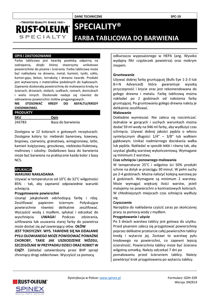 DANE TECHNICZNE SPECIALITY® SPC-19 FARBA TABLICOWA DO BARWIENIA OPIS I ZASTOSOWANIE Farba tablicowa jest twardą powłoką odporną na zadrapania, dzięki której stworzymy unikatowe powierzchnie do pisania i ścierania. Farba tablicowa może być nakładana na drewno, metal, kamień, tynki, szkło, karton-gips, beton, terrakotę i drewno twarde. Produkt jest wytwarzany z materiałów podobnych do łupkowych. Zapewnia doskonałą powierzchnię do malowania kredą na ścianach, drzwiach, stołach, szafkach, ramach, doniczkach i wielu innych. Doskonale nadaje się również do odnowienia powierzchni stołów pingpongowych. NIE STOSOWAĆ KREDY DO ASFALTU/KREDY CHODNIKOWEJ. PRODUKTY SKU 243783 Opis Baza do barwienia Dostępna w 12 kolorach o gotowych recepturach. Dostępne kolory to: niebieski banerowy, kawowy, brązowy, czerwony, granatowy, winogronowy, latte, kamień księżycowy, groszkowy, niebiesko-fioletowy, malinowy i szkolny. Dodatkowo baza do barwienia może być barwiona na praktycznie każdy kolor z bazy NCS. APLIKACJA WARUNKI NAKŁADANIA Używać w temperaturze od 10°C do 32°C wilgotności 85% - tak, aby zapewnić odpowiednie warunki schnięcia. Przygotowanie powierzchni Usunąć jakąkolwiek odchodzącą farbę i rdzę. Zeszlifować papierem ściernym. Połyskujące powierzchnie również delikatnie zeszlifować. Wyczyścić wodą z mydłem, spłukać i odczekać do wyschnięcia. UWAGA! Podczas zdzierania, szlifowania lub usuwania starej farby do powietrza może dostać się pył zawierający ołów. OŁÓW JEST TOKSYCZNY. WYS. TAWIENIE SIĘ NA DZIAŁANIE PYŁU OŁOWIANEGO MOŻE POWIDOWAĆ POWAŻNE CHOROBY, TAKIE JAK USZKODZENIE MÓZGU, SZCZEGÓLNIE W PRZYPADKU DZIECI ORAZ KOBIET W CIĄŻY. Zakładać zatwierdzony przez BHP sprzęt chroniący drogi oddechowe. Wyczyścić za pomocą odkurzacza wyposażonego w HEPA (ang. Wysoko wydajny filtr cząsteczek powietrza) oraz mokrym mopem. Gruntowanie Używać dobrej farby gruntującej (Bulls Eye 1-2-3 lub B-I-N Advanced) która gwarantuje wysoką przyczepność i krycie oraz jest rekomendowana do gołego drewna i metalu. Farbę tablicową można nakładać po 2 godzinach od nałożenia farby gruntującej. Po gruntowaniu gołego drewna należy je delikatnie zeszlifować. Malowanie Dokładnie wymieszać. Nie zaleca się rozcieńczać. Jednakże w gorących i suchych warunkach można dodać 59 ml wody na 946 ml farby, aby wydłużyć czas schnięcia. Używać dobrej jakości pędzla o włosiu syntetycznym długości 1/4” – 3/8” lub wałkiem gąbkowym. Unikać nadmiernego dociskania wałka lub pędzla. Nakładać w sposób lekki i równy tak, aby uzyskać gładką warstwę wykończeniową. Wymagane są minimum 2 warstwy. Czas schnięcia i ponownego malowania W temperaturze 25°C i wilgotno ści 50% produkt schnie na dotyk w przeciągu 30 minut. W pełni suchy po 2-4 godzinach. Można nałożyć kolejną warstwę po 4 godzinach. Wymagane są minimum 2 warstwy. Może wymagać większej ilości warstw, jeżeli malujemy na powierzchni o kontrastowych kolorach. W chłodniejszych miejscach czas schnięcia wydłuży się. Czyszczenie Narzędzia do nakładania czyścić zaraz po skończonej pracy za pomocą wody z mydłem. Przygotowanie i użycie Po 3 dniach warstwa tablicy jest gotowa do użytku. Przed pisaniem zaleca się przygotować powierzchnię poprzez delikatne przetarcie całej powierzchni tablicy kredą i wytarcie jej. Zostawi to warstwę pyłu kredowego na powierzchni, co zapewni lepszą ścieralność. Powierzchnia tablicy może być ścierana wilgotną szmatką. Należy odczekać 7 dni po pomalowaniu przed ścieraniem tablicy. Należy powtórzyć krok przygotowania po wytarciu tablicy. Dystrybucja w Polsce: www.spinex.pl Formularz: GDH-339 Wersja: 042914 DANE TECHNICZNE SPC-19 SPECIALITY® FARBA TABLICOWA DO BARWIENIA Właściwości fizyczne Żywica Pigment Rozpuszczalnik Waga Substancje stałe FARBA TABLICOWA DO BARWIENIA Na gallon Na litr Wagowo Objętościowo LZO Zalecana grubość suchej warstwy filmu (na warstwę) Zalecana grubość mokrej warstwy filmu Wydajność teoretyczna przy 25µ Wydajność praktyczna przy zalecanej grubości suchej warstwy filmu Czasy schnięcia w Na dotyk temperaturze (21-27°C) i Do kolejnej warstwy 50% wilgotności Pyłosuchość Do użycia Przydatność Temperatura zapłonu Informacje bezpieczeństwa Akryl Dwutlenek tytanu, Sjenit nefelinu Woda, Etery glikolowe 10,6 lbs 1,27 kg 54,6 % 41,8 % <250 g/l 37,5 - 50µ 87,5 - 125µ 4 m2/l 8,8 m2/opakowanie 30 minut 4 godziny 2 godziny 7 dni 5 lat 93°C W karcie MSDS Dane techniczne i zalecenia przedstawione w niniejszym dokumencie są prawidłowe na dzień sporządzenia dokumentu i stan dostępnej wiedzy oraz podane w najlepszej wierze. Wszystkie zalecenia i informacje przedstawione w tym dokumencie nie stanowią jakiejkolwiek gwarancji względem działania produktu. Z uwagi na fakt, że warunki zastosowania materiału są poza kontrolą producenta, producent gwarantuje, że produkt spełnia standardy jakości producenta materiału. Producent ogranicza swoją odpowiedzialność wyłącznie do wymiany wadliwego materiału. Producent zastrzega sobie prawo do zmiany wszystkich informacji technicznych bez uprzedniego informowania. Dystrybucja w Polsce: www.spinex.pl Formularz: GDH-339 Wersja: 042914