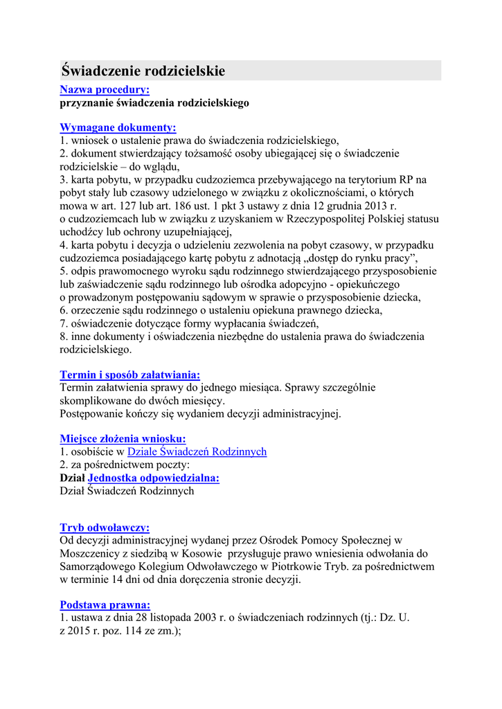 Świadczenie rodzicielskie Nazwa procedury: przyznanie świadczenia rodzicielskiego Wymagane dokumenty: 1. wniosek o ustalenie prawa do świadczenia rodzicielskiego, 2. dokument stwierdzający tożsamość osoby ubiegającej się o świadczenie rodzicielskie – do wglądu, 3. karta pobytu, w przypadku cudzoziemca przebywającego na terytorium RP na pobyt stały lub czasowy udzielonego w związku z okolicznościami, o których mowa w art. 127 lub art. 186 ust. 1 pkt 3 ustawy z dnia 12 grudnia 2013 r. o cudzoziemcach lub w związku z uzyskaniem w Rzeczypospolitej Polskiej statusu uchodźcy lub ochrony uzupełniającej, 4. karta pobytu i decyzja o udzieleniu zezwolenia na pobyt czasowy, w przypadku cudzoziemca posiadającego kartę pobytu z adnotacją „dostęp do rynku pracy”, 5. odpis prawomocnego wyroku sądu rodzinnego stwierdzającego przysposobienie lub zaświadczenie sądu rodzinnego lub ośrodka adopcyjno - opiekuńczego o prowadzonym postępowaniu sądowym w sprawie o przysposobienie dziecka, 6. orzeczenie sądu rodzinnego o ustaleniu opiekuna prawnego dziecka, 7. oświadczenie dotyczące formy wypłacania świadczeń, 8. inne dokumenty i oświadczenia niezbędne do ustalenia prawa do świadczenia rodzicielskiego. Termin i sposób załatwiania: Termin załatwienia sprawy do jednego miesiąca. Sprawy szczególnie skomplikowane do dwóch miesięcy. Postępowanie kończy się wydaniem decyzji administracyjnej. Miejsce złożenia wniosku: 1. osobiście w Dziale Świadczeń Rodzinnych 2. za pośrednictwem poczty: Dział Jednostka odpowiedzialna: Dział Świadczeń Rodzinnych Tryb odwoławczy: Od decyzji administracyjnej wydanej przez Ośrodek Pomocy Społecznej w Moszczenicy z siedzibą w Kosowie przysługuje prawo wniesienia odwołania do Samorządowego Kolegium Odwoławczego w Piotrkowie Tryb. za pośrednictwem w terminie 14 dni od dnia doręczenia stronie decyzji. Podstawa prawna: 1. ustawa z dnia 28 listopada 2003 r. o świadczeniach rodzinnych (tj.: Dz. U. z 2015 r. poz. 114 ze zm.); 2. art. 127 i art. 186 ust. 1 pkt 3 ustawy z dnia 12 grudnia 2013 r. o cudzoziemcach (Dz. U. z 2013 r. poz. 1650 z późn. zm.); 3. rozporządzenie Ministra Rodziny, Pracy i Polityki Społecznej z dnia 8 grudnia 2015 r. w sprawie postępowania w sprawach o świadczenia rodzinne (Dz. U. z 2015 r. poz. 2284); 4. rozporządzenie Rady Ministrów z dnia 7 sierpnia 2015 r. w sprawie wysokości dochodu rodziny albo dochodu osoby uczącej się stanowiących podstawę ubiegania się o zasiłek rodzinny i specjalny zasiłek opiekuńczy, wysokości świadczeń rodzinnych oraz wysokości zasiłku dla opiekuna (Dz. U. z 2015 r. poz. 1238). Inne informacje: 1. Prawo do świadczenia rodzicielskiego przysługuje niezależnie od dochodu rodziny. 2. Świadczenie rodzicielskie przysługuje: 1) matce albo ojcu dziecka, z uwzględnieniem art.17c ust. 2 ustawy; 2) opiekunowi faktycznemu dziecka w przypadku objęcia opieką dziecka w wieku do ukończenia 7 roku życia, a w przypadku dziecka, wobec którego podjęto decyzję o odroczeniu obowiązku szkolnego - do ukończenia 10 roku życia; 3) rodzinie zastępczej, z wyjątkiem rodziny zastępczej zawodowej, w przypadku objęcia opieką dziecka w wieku do ukończenia 7 roku życia, a w przypadku dziecka, wobec którego podjęto decyzję o odroczeniu obowiązku szkolnego - do ukończenia 10 roku życia; 4) osobie, która przysposobiła dziecko, w przypadku objęcia opieką dziecka w wieku do ukończenia 7 roku życia, a w przypadku dziecka, wobec którego podjęto decyzję o odroczeniu obowiązku szkolnego - do ukończenia 10 roku życia. 3. Świadczenie rodzicielskie przysługuje ojcu dziecka w przypadku: 1) skrócenia okresu pobierania świadczenia rodzicielskiego na wniosek matki dziecka po wykorzystaniu przez nią tego świadczenia za okres co najmniej 14 tygodni od dnia urodzenia dziecka; 2) śmierci matki dziecka; 3) porzucenia dziecka przez matkę. 4. Świadczenie rodzicielskie przysługuje przez okres: 1) 52 tygodni - w przypadku urodzenia jednego dziecka przy jednym porodzie, przysposobienia jednego dziecka lub objęcia opieką jednego dziecka; 2) 65 tygodni - w przypadku urodzenia dwojga dzieci przy jednym porodzie, przysposobienia dwojga dzieci lub objęcia opieką dwojga dzieci; 3) 67 tygodni - w przypadku urodzenia trojga dzieci przy jednym porodzie, przysposobienia trojga dzieci lub objęcia opieką trojga dzieci; 4) 69 tygodni - w przypadku urodzenia czworga dzieci przy jednym porodzie, przysposobienia czworga dzieci lub objęcia opieką czworga dzieci; 5) 71 tygodni - w przypadku urodzenia pięciorga i więcej dzieci przy jednym porodzie, przysposobienia pięciorga i więcej dzieci lub objęcia opieką pięciorga i więcej dzieci. 5. Świadczenie rodzicielskie przysługuje od dnia: 1) porodu - w przypadku matki lub ojca dziecka; 2) objęcia dziecka opieką, nie dłużej niż do ukończenia przez dziecko 7 roku życia, a w przypadku dziecka, wobec którego podjęto decyzję o odroczeniu obowiązku szkolnego, nie dłużej niż do ukończenia przez nie 10 roku życia - w przypadku opiekuna faktycznego dziecka lub rodziny zastępczej niezawodowej; 3) przysposobienia dziecka, nie dłużej niż do ukończenia przez dziecko 7 roku życia, a w przypadku dziecka, wobec którego podjęto decyzję o odroczeniu obowiązku szkolnego, nie dłużej niż do ukończenia przez nie 10 roku życia - w przypadku osoby przysposabiającej dziecko. 6. W razie urodzenia dziecka przez kobietę pobierającą zasiłek dla bezrobotnych w okresie, o którym mowa w art. 73 ust. 1 ustawy z dnia 20 kwietnia 2004 r. o promocji zatrudnienia i instytucjach rynku pracy (Dz. U. z 2015 r. poz. 149 z poźn. zm.) lub w ciągu miesiąca po jego zakończeniu albo w okresie przedłużenia zasiłku dla bezrobotnych na podstawie art. 73 ust. 3 tej ustawy, świadczenie rodzicielskie przysługuje jednemu z rodziców w wysokości różnicy między kwotą świadczenia rodzicielskiego, a kwotą pobieranego 