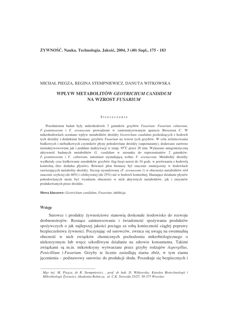 YWNO . Nauka. Technologia. Jako , 2004, 3 (40) Supl., 175 - 183 MICHAŁ PIEGZA, REGINA STEMPNIEWICZ, DANUTA WITKOWSKA WPŁYW METABOLITÓW GEOTRICHUM CANDIDUM NA WZROST FUSARIUM Streszczenie Przedmiotem bada były mikrohodowle 3 gatunków grzybów Fusarium: Fusarium culmorum, F. graminearum i F. avenaceum prowadzone w zautomatyzowanym aparacie Bioscreen C. W mikrohodowlach oceniano wpływ metabolitów dro d y Geotrichum candidum pochodz cych z hodowli tych dro d y z dodatkiem biomasy grzybów Fusarium na wzrost tych grzybów. W celu zró nicowania białkowych i niebiałkowych czynników płyny pohodowlane dro d y (supernatanty), dodawano zarówno nieinaktywowowane jak i poddane inaktywacji w temp. 95oC przez 20 min. Wykazano antagonistyczn aktywno badanych metabolitów G. candidum w stosunku do reprezentantów 2 gatunków: F. graminearum i F. culmorum, natomiast stymuluj c wobec F. avenaceum. Metabolity dro d y wydłu ały czas kiełkowanie zarodników grzybów (lag-faz ) nawet do 34 godz. w porównaniu z hodowl kontroln (bez dodatku płynów). Równie plon biomasy był znacznie zmniejszony w hodowlach zawieraj cych metabolity dro d y. Szczep stymulowany (F. avenaceum 1) w obecno ci metabolitów rósł znacznie szybciej (do 60%) i efektywniej (do 25%) ni w hodowli kontrolnej. Hamuj ce działanie płynów pohodowlanych mo e by wynikiem obecno ci w nich aktywnych metabolitów, jak i enzymów produkowanych przez dro d e. Słowa kluczowe: Geotrichum candidum, Fusarium, inhibicja Wst p Surowce i produkty ywno ciowe stanowi doskonałe rodowisko do rozwoju drobnoustrojów. Rosn ce zainteresowanie i wiadomo spo ywania produktów spo ywczych o jak najlepszej jako ci poci ga za sob konieczno ci głej poprawy bezpiecze stwa ywno ci. Poczynaj c od surowców, zwraca si uwag na ewentualn obecno w nich zwi zków chemicznych pochodzenia mikrobiologicznego o niekorzystnym lub wr cz szkodliwym działaniu na zdrowie konsumenta. Takimi zwi zkami s m.in. mikotoksyny wytwarzane przez grzyby rodzajów Aspergillus, Penicillium i Fusarium. Grzyby te licznie zasiedlaj ziarna zbó , w tym ziarna j czmienia – podstawowy surowiec do produkcji słodu. Poszukuje si bezpiecznych i Mgr in . M. Piegza, dr R. Stempniewicz , prof. dr hab. D. Witkowska; Katedra Biotechnologii i Mikrobiologii ywno ci, Akademia Rolnicza, ul. C.K. Norwida 25/27, 50-375 Wrocław 176 Miachał Piegza, Regina Stempniewicz, Danuta Witkowska skutecznych metod ograniczenia rozwoju niepo danej mikroflory, w tym grzybów toksynotwórczych. Od kilku lat, z pozytywnym skutkiem, prowadzi si badania nad wykorzystaniem dro d y Geotrichum candidum, jako kultur starterowych w procesie słodowania j czmienia. Boivin i Malanda [1] oraz Dziuba i wsp. [2, 3, 4] wykazali, e dro d e G. candidum wprowadzone do słodowania jako szczepionki hamowały wzrost grzybów, w tym rodzaju Fusarium, co w efekcie wpłyn ło korzystnie na jako i zdrowotno słodu. Ograniczenie wzrostu grzybów toksynotwórczych było wynikiem konkurencji o składniki pokarmowe i przestrze yciow [1, 8, 9, 10, 13]. Natomiast inni autorzy [7, 15] informuj o antagonistycznym oddziaływaniu metabolitów wytwarzanych przez dro d e G. candidum, takich jak: trimetyloamina, kwas D-3-indolilomlekowy i kwas 3-fenylomlekowy, na wzrost bakterii patogennych Listeria monocytogenes oraz grzybów rodzaju Aspergillus, Penicillium i Fusarium. Okebe i wsp. [11] podaj , e hamowanie wzrostu grzybów patogennych mo e by spowodowane działaniem enzymów litycznych degraduj cych biopolimery β-(1,3)(1,6)-glukanów cian komórkowych grzybów. Nielsen i wsp. [10] wykazali, e dro d e G. candidum ograniczały wytwarzanie mikotoksyn, takich jak: kwas mykofenolowy, rokefortyna, chaetoglobozyna i kwas cyklopiazonowy. Grzyby, poza wytwarzaniem niebezpiecznych dla zdrowia człowieka mikotoksyn, s producentami licznych enzymów hydrolitycznych, które mog znacznie podnosi aktywno enzymatyczn słodu, szczególnie proteolityczn i lipolityczn , obni aj c jego jako , a w konsekwencji jako piwa. Celem bada była ocena wpływu płynów po hodowli Geotrichum na wzrost trzech szczepów Fusarium, reprezentuj cych 3 ró ne gatunki. Materiały i metody bada Mikroorganizmy U yto szczepów rodzaju Fusarium: F. avenaceum 1 (F1), F. culmorum M292 (F2), F. graminearum KF375 (F3). Grzyby pochodziły z kolekcji Instytutu Technologii ywno ci Pochodzenia Ro linnego Akademii Rolniczej w Poznaniu. Płyny pohodowlane dro d y Geotrichum candidum Badaniom poddano 8 szczepów dro d y Geotrichum candidum ró nego pochodzenia, w tym ze słodu: G. candidum SS32B1 (B1), G. candidum SS47D2 (D2), G. candidum MSK311 (3-11), z serów z przerostem ple ni: G. candidum1 (OL), G. candidum Sc12 (Sc12) G. candidum KB5 (X5), G. candidum KB6 (X6) oraz z piór kurzych: G. candidum PH (PH). Poszczególne szczepy dro d y hodowano w podło u PDA z dodatkiem 0,5% s.s. biomasy ka dego z 3 szczepów Fusarium. Hodowle prowadzono w kolbach o poj. 250 ml, w 50 ml podło a przy 168 rpm na wytrz sarce WPŁYW METABOLITÓW GEOTRICHUM CANDIDUM NA WZROST FUSARIUM 177 G10-Gyrotory Shaker (New Brunswich Co) przez 7 dni w temp. 28–30oC. Hodowle odwirowywano, dodatkowo s czono przez s czki 0,2 l Millipore w celu uzyskania klarownego i jałowego supernatantu. Do mikrohodowli dodawano supernatant albo bez inaktywacji, albo po inaktywacji termicznej (95oC/20 min) maj cej na celu wyeliminowanie białkowych zwi zków biologicznie czynnych, szczególnie enzymów. Warunki mikrohodowli grzybów rodzaju Fusarium Mikrohodowle grzybów rodzaju Fusarium prowadzono w aparacie Bioscreen C, zautomatyzowanym urz dzeniu pozwalaj cym na ci głe ledzenie przebiegu procesu, w 200 hodowlach jednocze nie, z równoczesnym wyznaczeniem krzywych wzrostu badanych mikroorganizmów. Hodowle zawierały: 300 l podło a PDA, 50 l supernatantu i 10 l zawiesiny zarodników Fusarium (wystandaryzowanej przy u yciu komory Thoma, do warto ci 106 kom/ml zarodników na pocz tku hodowli). W hodowlach kontrolnych zamiast superna