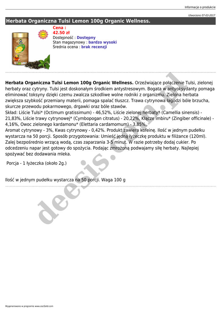 Informacje o produkcie Utworzono 07-03-2017 Herbata Organiczna Tulsi Lemon 100g Organic Wellness. Cena : 42.50 zł Dostępność : Dostępny Stan magazynowy : bardzo wysoki Średnia ocena : brak recenzji es is Porcja - 1 łyżeczka (około 2g.) .c o m .p l Herbata Organiczna Tulsi Lemon 100g Organic Wellness. Orzeźwiające połączenie Tulsi, zielonej herbaty oraz cytryny. Tulsi jest doskonałym środkiem antystresowym. Bogata w antyoksydanty pomaga eliminować toksyny dzięki czemu zwalcza szkodliwe wolne rodniki z organizmu. Zielona herbata zwiększa szybkość przemiany materii, pomaga spalać tłuszcz. Trawa cytrynowa łagodzi bóle brzucha, skurcze przewodu pokarmowego, drgawki oraz bóle stawów. Skład: Liście Tulsi* (Octimum gratissimum) - 46,52%, Liście zielonej herbaty* (Camellia sinensis) 21,83%, Liście trawy cytrynowej* (Cymbopogan citratus) - 20,22%, Kłącze imbiru* (Zingiber officinale) 4,16%, Owoc zielonego kardamonu* (Elettaria cardamomum) - 3,85%, Aromat cytrynowy - 3%, Kwas cytrynowy - 0,42%. Produkt zawiera kofeinę. Ilość w jednym pudełku wystarcza na 50 porcji. Sposób przygotowania: Umieść jedną łyżeczkę produktu w filiżance (120ml). Zalej bezpośrednio wrzącą wodą, czas zaparzania 3-5 minut. W razie potrzeby dodaj cukier. Po odcedzeniu napar jest gotowy do spożycia. Podając zmrożoną podwajamy siłę herbaty. Najlepiej spożywać bez dodawania mleka. de Ilość w jednym pudełku wystarcza na 50 porcji. Waga 100 g Wygenerowano w programie www.oscGold.com