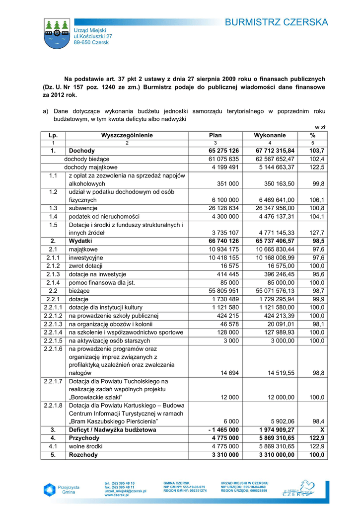 Na podstawie art. 37 pkt 2 ustawy z dnia 27 sierpnia 2009 roku o finansach publicznych (Dz. U. Nr 157 poz. 1240 ze zm.) Burmistrz podaje do publicznej wiadomości dane finansowe za 2012 rok. a) Dane dotyczące wykonania budżetu jednostki samorządu terytorialnego w poprzednim roku budżetowym, w tym kwota deficytu albo nadwyżki w zł Lp. Wyszczególnienie Plan Wykonanie % 1 1. 1.1 1.2 1.3 1.4 1.5 2. 2.1 2.1.1 2.1.2 2.1.3 2.1.4 2.2 2.2.1 2.2.1.1 2.2.1.2 2.2.1.3 2.2.1.4 2.2.1.5 2.2.1.6 2.2.1.7 2.2.1.8 3. 4. 4.1 5. 2 Dochody dochody bieżące dochody majątkowe z opłat za zezwolenia na sprzedaż napojów alkoholowych udział w podatku dochodowym od osób fizycznych subwencje podatek od nieruchomości Dotacje i środki z funduszy strukturalnych i innych źródeł Wydatki majątkowe inwestycyjne zwrot dotacji dotacje na inwestycje pomoc finansowa dla jst. bieżące dotacje dotacje dla instytucji kultury na prowadzenie szkoły publicznej na organizację obozów i kolonii na szkolenie i współzawodnictwo sportowe na aktywizację osób starszych na prowadzenie programów oraz organizację imprez związanych z profilaktyką uzależnień oraz zwalczania nałogów Dotacja dla Powiatu Tucholskiego na realizację zadań wspólnych projektu „Borowiackie szlaki” Dotacja dla Powiatu Kartuskiego – Budowa Centrum Informacji Turystycznej w ramach „Bram Kaszubskiego Pierścienia” Deficyt / Nadwyżka budżetowa Przychody wolne środki Rozchody 3 4 5 65 275 126 61 075 635 4 199 491 67 712 315,84 62 567 652,47 5 144 663,37 103,7 102,4 122,5 351 000 350 163,50 99,8 6 100 000 26 128 634 4 300 000 6 469 641,00 26 347 956,00 4 476 137,31 106,1 100,8 104,1 3 735 107 66 740 126 10 934 175 10 418 155 16 575 414 445 85 000 55 805 951 1 730 489 1 121 580 424 215 46 578 128 000 3 000 4 771 145,33 65 737 406,57 10 665 830,44 10 168 008,99 16 575,00 396 246,45 85 000,00 55 071 576,13 1 729 295,94 1 121 580,00 424 213,39 20 091,01 127 989,93 3 000,00 127,7 98,5 97,6 97,6 100,0 95,6 100,0 98,7 99,9 100,0 100,0 98,1 100,0 100,0 14 694 14 519,55 98,8 12 000 12 000,00 100,0 6 000 - 1 465 000 4 775 000 4 775 000 3 310 000 5 902,06 1 974 909,27 5 869 310,65 5 869 310,65 3 310 000,00 98,4 X 122,9 122,9 100,0 5.1 pożyczki i kredyty 3 310 000 3 310 000,00 100,0 b) Kwota wykorzystanych środków, o których mowa w art. 5 ust. 1 pkt 2 Dochody w zł Dział Rozdział Nazwa Plan Wykonanie % 1 2 3 4 5 6 Bieżące 853 85395 Pozostałe zadania w zakresie polityki społecznej w tym z tytułu dotacji i środków na finansowanie wydatków na realizację zadań finansowanych z udziałem środków, o których mowa w art. 5 ust. 1 pkt 2 i 3 Pozostała działalność w tym z tytułu dotacji i środków na finansowanie wydatków na realizację zadań finansowanych z udziałem środków, o których mowa w art. 5 ust. 1 pkt 2 i 3 Dotacje celowe w ramach programów finansowanych z udziałem środków europejskich oraz środków o których mowa w art.5 ust.1 pkt 3 oraz ust. 3 pkt 5 i 6 ustawy, lub płatności w ramach budżetu środków europejskich Dotacje celowe w ramach programów finansowanych z udziałem środków europejskich oraz środków o których mowa w art.5 ust.1 pkt 3 oraz ust. 3 pkt 5 i 6 ustawy, lub płatności w ramach budżetu środków europejskich Bieżące razem: 010 01041 w tym z tytułu dotacji i środków na finansowanie wydatków na realizację zadań finansowanych z udziałem środków, o których mowa w art. 5 ust. 1 pkt 2 i 3 majątkowe Rolnictwo i łowiectwo w tym z tytułu dotacji i środków na finansowanie wydatków na realizację zadań finansowanych z udziałem środków, o których mowa w art. 5 ust. 1 pkt 2 i 3 Program rozwoju Obszarów Wiejskich 2007-2013 w tym z tytułu dotacji i środków na finansowanie wydatków na realizację zadań finansowanych z udziałem 2 509 983 440 691,41 86,4 509 983 440 691,41 86,4 509 983 440 691,41 86,4 509 983 440 691,41 86,4 468 265 406 850,40 86,9 41 718 33 841,01 81,1 509 983 440 691,41 86,4 509 983 440 691,41 86,4 1 964 002 2 719 516,00 138,5 1 964 002 2 719 516,00 138,5 1 964 002 2 719 516,00 138,5 1 964 002 2 719 516,00 138,5 środków, o których mowa w art. 5 ust. 1 pkt 2 i 3 600 60016 630 63095 900 Dotacje celowe w ramach programów finansowanych z udziałem środków europejskich oraz środków, o których mowa w art.5 ust.1 pkt. 3 oraz ust. 3 pkt 5 i 6 ustawy, lub płatności w ramach budżetu środków europejskich Transport i łączność w tym z tytułu dotacji i środków na finansowanie wydatków na realizację zadań finansowanych z udziałem środków, o których mowa w art. 5 ust. 1 pkt 2 i 3 Drogi publiczne gminne w tym z tytułu dotacji i środków na finansowanie wydatków na realizację zadań finansowanych z udziałem środków, o których mowa w art. 5 ust. 1 pkt 2 i 3 Dotacje celowe w ramach programów finansowanych z udziałem środków europejskich oraz środków, o których mowa w art.5 ust.1 pkt. 3 oraz ust. 3 pkt 5 i 6 ustawy, lub płatności w ramach budżetu środków europejskich Turystyka w tym z tytułu dotacji i środków na finansowanie wydatków na realizację zadań finansowanych z udziałem środków, o których mowa w art. 5 ust. 1 pkt 2 i 3 Pozostała działalność w tym z tytułu dotacji i środków na finansowanie wydatków na realizację zadań finansowanych z udziałem środków, o których mowa w art. 5 ust. 1 pkt 2 i 3 Dotacje celowe w ramach programów finansowanych z udziałem środków europejskich oraz środków, o których mowa w art.5 ust.1 pkt. 3 oraz ust. 3 pkt 5 i 6 ustawy, lub płatności w ramach budżetu środków europejskich Gospodarka komunalna i ochrona środowiska w tym z tytułu dotacji i środków na finansowanie wydatków na realizację zadań finansowanych z udziałem środków, o których mowa w art. 5 ust. 1 pkt 2 i 3 3 1 964 002 2 719 516,00 138,5 357 734 350 864,96 98,1 357 734 350 864,96 98,1 357 734 350 864,96 98,1 357 734 350 864,96 98,1 357 734 350 864,96 98,1 875 728 964 425,83 110,1 875 