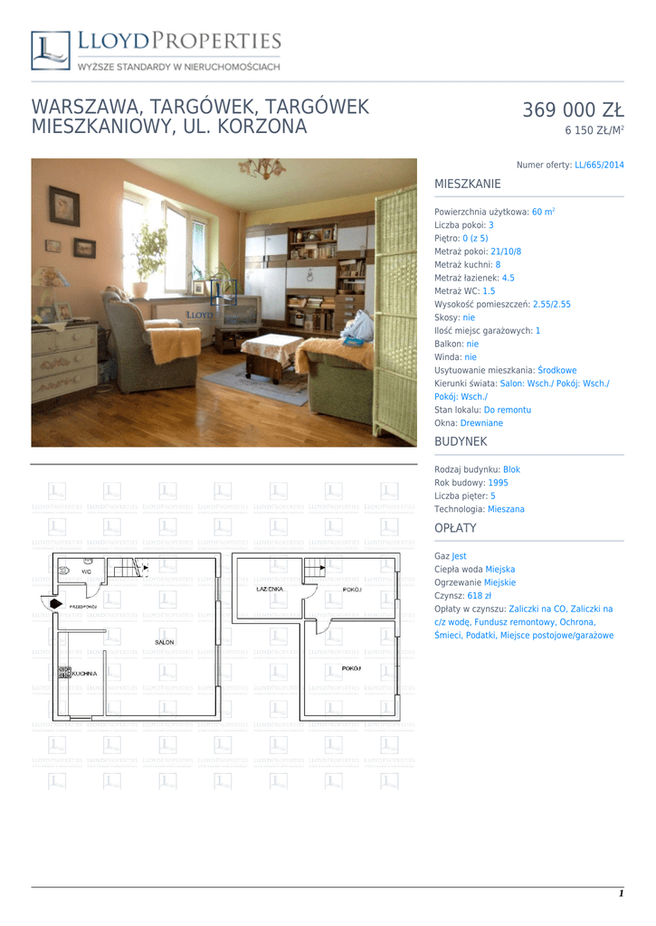 WARSZAWA, TARGÓWEK, TARGÓWEK MIESZKANIOWY, UL. KORZONA 369 000 ZŁ 6 150 ZŁ/M2 Numer oferty: LL/665/2014 MIESZKANIE Powierzchnia użytkowa: 60 m2 Liczba pokoi: 3 Piętro: 0 (z 5) Metraż pokoi: 21/10/8 Metraż kuchni: 8 Metraż łazienek: 4.5 Metraż WC: 1.5 Wysokość pomieszczeń: 2.55/2.55 Skosy: nie Ilość miejsc garażowych: 1 Balkon: nie Winda: nie Usytuowanie mieszkania: Środkowe Kierunki świata: Salon: Wsch./ Pokój: Wsch./ Pokój: Wsch./ Stan lokalu: Do remontu Okna: Drewniane BUDYNEK Rodzaj budynku: Blok Rok budowy: 1995 Liczba pięter: 5 Technologia: Mieszana OPŁATY Gaz Jest Ciepła woda Miejska Ogrzewanie Miejskie Czynsz: 618 zł Opłaty w czynszu: Zaliczki na CO, Zaliczki na c/z wodę, Fundusz remontowy, Ochrona, Śmieci, Podatki, Miejsce postojowe/garażowe 1 Patrycja Marton Property Advisor +48 533 340 329 [email protected] OPIS Zachęcam Państwa do zapoznania się z ofertą tego przytulnego, 2-poziomowego mieszkania. Zajmuje ono parter i 1.piętro w budynku 5-pietrowym. Na parterze mieści się duży salon(21 m2), widna kuchnia(8 m2) oraz WC. Na piętrze są 2 pokoje, w tym jeden przechodni oraz łazienka z wanną. Mieszkanie wymaga odświeżenia lub remontu. Tym samym pozostawia to wiele możliwości do własnej aranżacji. Dół mieszkania to idealna część dzienna z salonem, miejscem na komplet jadalniany oraz kuchnią, która można otworzyć na pokój. U góry z kolei można stworzyć dwie mniejsze lub jedną większą sypialnię. Taki rozkład szczególnie przypadnie do gustu parom ceniącym sobie swoją prywatność. Lokalizacja jest spokojna i cicha. Ruchliwe ulice są oddalone od budynku. Najbliższe przystanki (w tym pętla autobusowa) są w promieniu ok. 500 m. Obok osiedla jest dyskont spożywczy Lidl, dzięki czemu szybkie i tanie zakupy po pracy nie będą stanowiły kłopotu. Budynek pochodzi z lat 90-tych. Między budynkami jest plac zabaw, a całość jest ogrodzona i chroniona całodobowo. Można się tu poczuć bezpiecznie. Do mieszkania przynależy piwnica ok. 4 m2. 2