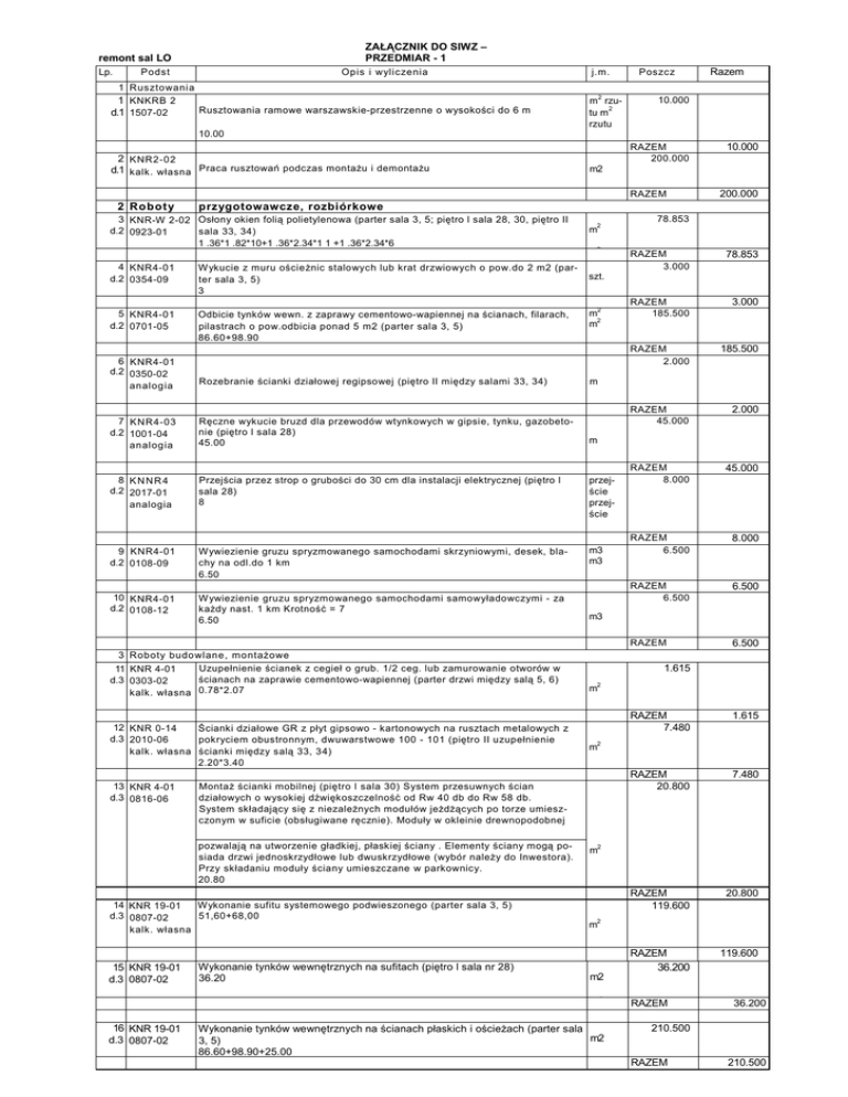 ZAŁĄCZNIK DO SIWZ – PRZEDMIAR - 1 remont sal LO Lp. Podst Opis i wyliczenia 1 Rusztowania 1 KNKRB 2 Rusztowania ramowe warszawskie-przestrzenne o wysokości do 6 m d.1 1507-02 j.m. m2 rzutu m2 rzutu Poszcz Razem 10.000 10.00 2 KNR2-02 d.1 kalk. własna Praca rusztowań podczas montażu i demontażu 10.00*4*5 2 Robot y RAZEM 200.000 m2 m2 RAZEM m2 2 m 4 KNR4-01 d.2 0354-09 W ykucie z muru ościeżnic stalowych lub krat drzwiowych o pow.do 2 m2 (parter sala 3, 5) 3 5 KNR4-01 d.2 0701-05 Odbicie tynków wewn. z zaprawy cementowo-wapiennej na ścianach, filarach, pilastrach o pow.odbicia ponad 5 m2 (parter sala 3, 5) 86.60+98.90 2 m m2 6 KNR4-01 d.2 0350-02 analogia Rozebranie ścianki działowej regipsowej (piętro II między salami 33, 34) 7 KNR4-03 d.2 1001-04 analogia Ręczne wykucie bruzd dla przewodów wtynkowych w gipsie, tynku, gazobetonie (piętro l sala 28) 45.00 8 KNNR4 d.2 2017-01 analogia Przejścia przez strop o grubości do 30 cm dla instalacji elektrycznej (piętro l sala 28) 8 przejście przejście 9 KNR4-01 d.2 0108-09 Wywiezienie gruzu spryzmowanego samochodami skrzyniowymi, desek, blachy na odl.do 1 km 6.50 m3 m3 10 KNR4-01 d.2 0108-12 W ywiezienie gruzu spryzmowanego samochodami samowyładowczymi - za każdy nast. 1 km Krotność = 7 6.50 3 Roboty budowlane, montażowe Uzupełnienie ścianek z cegieł o grub. 1/2 ceg. lub zamurowanie otworów w 11 KNR 4-01 ścianach na zaprawie cementowo-wapiennej (parter drzwi między salą 5, 6) d.3 0303-02 kalk. własna 0.78*2.07 12 KNR 0-14 Ścianki działowe GR z płyt gipsowo - kartonowych na rusztach metalowych z d.3 2010-06 pokryciem obustronnym, dwuwarstwowe 100 - 101 (piętro II uzupełnienie kalk. własna ścianki między salą 33, 34) 2.20*3.40 14 KNR 19-01 Wykonanie sufitu systemowego podwieszonego (parter sala 3, 5) d.3 0807-02 51,60+68,00 kalk. własna RAZEM 3.000 78.853 RAZEM 185.500 3.000 RAZEM 2.000 185.500 RAZEM 45.000 2.000 RAZEM 8.000 45.000 RAZEM 6.500 8.000 RAZEM 6.500 6.500 RAZEM 6.500 m m m3 1.615 2 m RAZEM 7.480 1.615 RAZEM 20.800 7.480 RAZEM 119.600 20.800 m2 Montaż ścianki mobilnej (piętro l sala 30) System przesuwnych ścian działowych o wysokiej dźwiękoszczelność od Rw 40 db do Rw 58 db. System składający się z niezależnych modułów jeżdżących po torze umieszczonym w suficie (obsługiwane ręcznie). Moduły w okleinie drewnopodobnej pozwalają na utworzenie gładkiej, płaskiej ściany . Elementy ściany mogą posiada drzwi jednoskrzydłowe lub dwuskrzydłowe (wybór należy do Inwestora). Przy składaniu moduły ściany umieszczane w parkownicy. 20.80 78.853 szt. szt. 2 m m2 RAZEM 15 KNR 19-01 d.3 0807-02 Wykonanie tynków wewnętrznych na sufitach (piętro l sala nr 28) 36.20 119.600 36.200 m2 m2 16 KNR 19-01 d.3 0807-02 200.000 przygotowawcze, rozbiórkowe 3 KNR-W 2-02 Osłony okien folią polietylenowa (parter sala 3, 5; piętro l sala 28, 30, piętro II d.2 0923-01 sala 33, 34) 1 .36*1 .82*10+1 .36*2.34*1 1 +1 .36*2.34*6 13 KNR 4-01 d.3 0816-06 10.000 Wykonanie tynków wewnętrznych na ścianach płaskich i ościeżach (parter sala m2 3, 5) 86.60+98.90+25.00 m2 RAZEM 36.200 210.500 RAZEM 210.500 17 KNR 2-02 d.3 0815-02 Wewn. gładzie gipsowe, dwuwarstw na ścianach i ościeżach (parter sala 3, 5; piętro II uzupełniona ścianka między salą 33, 34) 86.60+98.90+25.00+ 7.48 217.980 m2 m2 18 TZKNBK VIII Zagruntowanie ścian i sufitów (parter sala 3, 5; piętro l sala nr 28; piętro II uzud.3 06-23 pełniona ścianka między salą 33, 34) 210.50+36.20+7.48 20 KNR-W 2-02 Dwukrotne malowanie farbami emulsyjnymi powierzchni wewnętrznych -sufid.3 1510-01 tów (piętro l sala nr 28) 36.20 Rozebranie listew lub cokołów (parter sala 3) 28.00 m2 m 25 KNR 4-01 d.3 1208-01 Jednokrotne lakierowanie emelią olejną parkietów (parter sala 3, 5) 51.50+68.00 m m2 m2 m2 m2 m2 m2 29 KNR-W 7-12 Malowanie pędzlem farbami nawierzchniowymi i emaliami epoksydowymi kond.3 0211-01 strukcji pełnościennych (grzejniki parter sala 3, 5) kalk. własna 7.80 m2 m2 31 d. KNNR5 Oprawy oświetleniowe (rastrowe systemowe do sufitów podwieszonych) (parter 4 0502-04 sala 3, 5) kalk. własna 18 32 KNR 5-08 d. 4 0302-02 33 KNR 5-08 d. 4 0307-02 Montaż na gotowym podłożu puszek bakelitowych o śr. do 80mm; ilość wylotów 3, przekrój przewodu 2.5 mm2 (parter sala 3, 5) 8 Montaż do gotowego podłoża gniazd wtyczkowych podtynkowych w puszkach z podłączeniem (parter sala 3, 5) 6 35 KNNR-W 9 d.4 1201-02 Pomiar natężenia oświetlenia wnętrz na wyznaczonych punktach pomiarowych płaszczyzny roboczej (parter sala 3, 5) 8 75.000 RAZEM 51.500 28.000 RAZEM 28.000 51.500 RAZEM 119.500 28.000 RAZEM 7.800 119.500 RAZEM 7.800 7.800 RAZEM 7.800 7.800 RAZEM 7.800 7.800 RAZEM 7.800 szt RAZEM 18.000 1.000 szt RAZEM 8.000 18.000 RAZEM 2.000 8.000 RAZEM 6.000 2.000 RAZEM 8.000 6.000 RAZEM 8.000 szt. szt. szt. 5 Instalacje sanitarne RAZEM 28.000 1.000 szt. Montaż na gotowym podłożu włączników instalacyjnych podtynkowych, przycisszt. ków w puszce instalacyjnej z podłączeniem (parter sala 3, 5) 2 szt. 34 KNR 5-08 d.4 0309-02 36.200 m2 28 KNR-W 7-12 Malowanie pędzlem farbami do gruntowania epoksydowymi konstrukcji pełnościennych (grzejniki parter sala 3, 5) Krotność = 2 d.3 0205-01 kalk. własna 7.80 4 Wyposażenie elektryczne Montaż centrali i instalacji LAN. Podłączenie instalacji od serwerowni do punk30 KNR 4-01 tów odbioru, (wykorzystanie istniejących przewodów RJ-45, złączy). Przewody d. 4 0816-06 kalk. własna montowane w rynienkach pcv przypodłogowe. Trasa przewodów, przejścia przez ściany wg ustaleń z Inwestorem. 1 RAZEM 75.000 m* Montaż listew lub cokołów (parter sala 3) 28.00 27 KNR-W 7-12 Odtłuszczanie konstrukcji pełnościennych (grzejniki parter sala 3, 5) 7.80 d.3 0105-01 kalk. własna 225.460 m 24 KNR 4-01 d.3 0816-06 26 KNR-W 7-12 Czyszczenie przez szczotkowanie mechaniczne do trzeciego stopnia czystości d.3 0102-01 kalk. belek stalowych (stan wyjściowy powierzchni B) (grzejnik