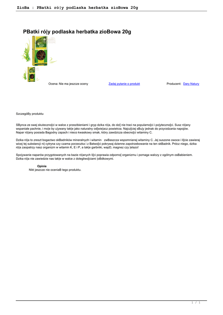 ZioBa : PBatki ró|y podlaska herbatka zioBowa 20g PBatki ró|y podlaska herbatka zioBowa 20g Ocena: Nie ma jeszcze oceny Zadaj pytanie o produkt Producent: Dary Natury SzczegóBy produktu SBynca ze swej skuteczno[ci w walce z przezibieniami i gryp dzika ró|a, do dzi[ nie traci na popularno[ci i po|yteczno[ci. Susz ró|any wspaniale pachnie, i mo|e by u|ywany tak|e jako naturalny od[wie|acz powietrza. Najcz[ciej sBu|y jednak do przyrzdzania napojów. Napar ró|any posiada Bagodny zapach i nieco kwaskowy smak, który zawdzicza obecno[ci witaminy C. Dzika ró|a to zreszt bogactwo skBadników mineralnych i witamin zwBaszcza wspomnianej witaminy C. Jej suszone owoce i li[cie zawieraj wicej tej substancji ni| cytryna czy czarna porzeczka i z Batwo[ci pokrywaj dzienne zapotrzebowanie na ten skBadnik. Prócz niego, dzika ró|a zaopatrzy nasz organizm w witamin K, E i P, a tak|e garbniki, wapD, magnez czy |elazo! Spo|ywanie naparów przygotowanych na bazie ró|anych li[ci poprawia odporno[ organizmu i pomaga walczy z ogólnym osBabieniem. Dzika ró|a nie zawiedzie nas tak|e w walce z dolegliwo[ciami |oBdkowymi. Opinie Nikt jeszcze nie oceniaB tego produktu. 1 / 1