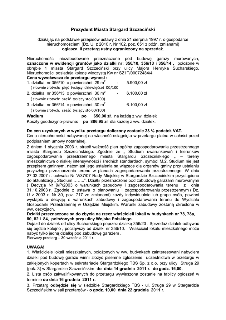 Prezydent Miasta Stargard Szczeciński działając na podstawie przepisów ustawy z dnia 21 sierpnia 1997 r. o gospodarce nieruchomościami (Dz. U. z 2010 r. Nr 102, poz. 651 z późn. zmianami) ogłasza II przetarg ustny ograniczony na sprzedaż. Nieruchomości niezabudowane przeznaczone pod budowę garaży murowanych, oznaczone w ewidencji gruntów jako działki nr: 356/10, 356/13 i 356/14 , położone w obrębie 1 miasta Stargard Szczeciński przy ulicy Majora Henryka Sucharskiego. Nieruchomości posiadają księgę wieczystą Kw nr SZ1T/00072484/4 Cena wywoławcza do przetargu wynosi : 1. działka nr 356/10 o powierzchni 29 m2 5.900,00 zł ( słownie złotych: pięć tysięcy dziewięćset 00/100 2. działka nr 356/13 o powierzchni 30 m2 6.100,00 zł ( słownie złotych: sześć tysięcy sto 00/100) 3. działka nr 356/14 o powierzchni 30 m2 6.100,00 zł ( słownie złotych: sześć tysięcy sto 00/100) Wadium po 650,00 zł. na każdą z ww. działek Koszty geodezyjno-prawne: po 886,95 zł dla każdej z ww. działek. Do cen uzyskanych w wyniku przetargu doliczony zostanie 23 % podatek VAT. Cena nieruchomości nabywanej na własność osiągnięta w przetargu płatna w całości przed podpisaniem umowy notarialnej. Z dniem 1 stycznia 2003 r. stracił ważność plan ogólny zagospodarowania przestrzennego miasta Stargardu Szczecińskiego. Zgodnie ze „ Studium uwarunkowań i kierunków zagospodarowania przestrzennego miasta Stargardu Szczecińskiego „ – tereny mieszkalnictwa o niskiej intensywności i średnich standardach, symbol M.2. Studium nie jest przepisem gminnym, natomiast jego ustalenia są wiążące dla organów gminy przy ustalaniu przyszłego przeznaczenia terenu w planach zagospodarowania przestrzennego. W dniu 27.02.2007 r. uchwała Nr V/37/07 Rady Miejskiej w Stargardzie Szczecińskim przystąpiono do aktualizacji „ Studium ……..”. Działki przeznaczone pod zabudowę garażami murowanymi ( Decyzja Nr 9/P/2003 o warunkach zabudowy i zagospodarowania terenu z dnia 31.10.2003 r. Zgodnie z ustawa o planowaniu i zagospodarowaniu przestrzennym ( Dz. U z 2003 r. Nr 80, poz. 717 ze zmianami) każdy indywidualnie lub grupa osób, powinni wystąpić o decyzję o warunkach zabudowy i zagospodarowania terenu do Wydziału Gospodarki Przestrzennej w Urzędzie Miejskim. Warunki zabudowy zostaną określone w ww. decyzjach. Działki przeznaczone są do zbycia na rzecz właścicieli lokali w budynkach nr 78, 78a, 80, 82 i 84, położonych przy ulicy Wojska Polskiego. Dojazd do działek od ulicy Sucharskiego poprzez działkę 356/20 . Sprzedaż działek odbywać się będzie kolejno , począwszy od działki nr 356/10. Właściciel lokalu mieszkalnego może nabyć tylko jedną działkę pod zabudowę garażem . Pierwszy przetarg – 30 września 2011 r. UWAGA! 1. Właściciele lokali mieszkalnych, położonych w ww. budynkach zainteresowani nabyciem działki pod budowę garażu winni złożyć pisemne zgłoszenie uczestnictwa w przetargu w zaklejonych kopertach w sekretariacie Stargardzkiego TBS Sp. z o.o. przy ulicy Struga 29 (pok. 3) w Stargardzie Szczecińskim do dnia 14 grudnia 2011 r. do godz. 16,00. 2. Lista osób zakwalifikowanych do przetargu wywieszona zostanie na tablicy ogłoszeń w terminie do dnia 16 grudnia 2011 r. 3. Przetarg odbędzie się w siedzibie Stargardzkiego TBS - ul. Struga 29 w Stargardzie Szczecińskim w sali przetargów - o godz. 10,00 dnia 22 grudnia 2011 r. 4. Wadium w wyżej określonej wysokości winno wpłynąć na konto Stargardzkiego TBS Sp. z o.o. w Banku PEKAO S.A. I O/Stargard Nr 10124039011111000042204466 najpóźniej w dniu 19 grudnia 2011 r. 5. Warunkiem udziału w przetargu jest okazanie dowodu wpłaty wadium. 6. O wysokości postąpienia decydują uczestnicy przetargu, z tym że wysokość postąpienia nie może być niższa niż 1 % ceny wywoławczej. 7. Wyniki przetargu podlegają zatwierdzeniu przez Prezydenta Miasta Stargard Szczeciński. 8. Wpłacone wadium przez uczestnika, który wygra przetarg zalicza się na poczet ceny nabycia nieruchomości, pozostałym uczestnikom wpłacone wadium zostanie zwrócone niezwłocznie po zatwierdzeniu protokołu z przetargu przez Prezydenta Miasta Stargard Szczeciński. 9. Organizator przetargu zawiadomi osobę ustaloną jako nabywcę nieruchomości o miejscu i terminie zawarcia umowy notarialnej. Jeżeli osoba ustalona jako nabywca nieruchomości nie stawi się bez usprawiedliwienia w miejscu i terminie podanym w zawiadomieniu, organizator przetargu odstąpi od zawarcia umowy, a wpłacone wadium nie podlega zwrotowi. 10. Nabywca przejmuje nieruchomość w stanie istniejącym. 11. Koszty zawarcia aktu notarialnego w całości ponosi nabywca nieruchomości. 12. Prezydent Miasta Stargard Szczeciński ma prawo odwołania przetargu w przypadku uzasadnionej przyczyny. Dodatkowe informacje można uzyskać: w Urzędzie Miejskim w Stargardzie Szczecińskim ul. Stefana Czarnieckiego 17, pok. nr 112 (telefon 091/578 34 91, 578 57-04); w Stargardzkim TBS Sp. z o.o. ul. Struga 29, pokój nr 13 (tel. 091/578-27-59 )