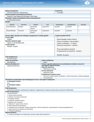 Ochrona własności intelektualnej #10.2.0001 Sylabusy - Ośrodek Informatyczny UG Nazwa przedmiotu Ochrona własności intelektualnej Nazwa jedostki prowadzącej przedmiot Katedra Prawa Międzynarodowego Publicznego Nazwisko osoby prowadzącej (osób prowadzących) dr Maciej Barczewski Studia wydział kierunek stopień Kod ECTS 10.2.0001 tryb specjalność specjalizacja semestr Wydział Biologii Biologia pierwszego stopnia stacjonarne wszystkie wszystkie 2 Wydział Biologii Przyroda pierwszego stopnia stacjonarne wszystkie wszystkie 2 Formy zajęć, sposób ich realizacji i przypisana im liczba godzin Formy zajęć Wykład Sposób realizacji zajęć zajęcia w sali dydaktycznej Liczba godzin Wykład: 15 godz. Liczba punktów ECTS 1 SZACOWANIE CZASU PRACY Praca w kontakcie z nauczycielem: Udział w wykładach - 15 godzin Zaliczenie przedmiotu: 1 godziny Praca samodzielna studenta: Przygotowanie do zaliczenia - 9 godzin RAZEM: 25 godzin Cykl dydaktyczny 2012/2013 letni Status przedmiotu obowiązkowy Metody dydaktyczne wykład problemowy Język wykładowy polski Forma i sposób zaliczenia oraz podstawowe kryteria oceny lub wymagania egzaminacyjne Sposób zaliczenia Zaliczenie na ocenę Formy zaliczenia zaliczenie ustne Podstawowe kryteria oceny Zaliczenie wykładu będzie się składało z 3 pytań dotyczących materiału będącego ich przedmiotem Określenie przedmiotów wprowadzających wraz z wymogami wstępnymi A. Wymagania formalne brak B. Wymagania wstępne brak Cele kształcenia Zapoznanie studentów z podstawowymi pojęciami i zagadnieniami z zakresu prawnej ochrony własności intelektualnej Treści programowe I. Prawo autorskie a. Geneza praw autorskich b. Definicja i koncepcje systemowe c. Przesłanki ochrony e. Przedmiot i podmiot ochrony f. Kategorie praw autorskich g. Wyłączenia i ograniczenia ochrony II. Prawo własności przemysłowej a. Charakter praw do patentów, znaków towarowych, wzorów użytkowych, przemysłowych i oznaczeń geograficznych b. Ograniczenia praw własności przemysłowej c. Procedura patentowa Wykaz literatury A. Literatura wymagana do ostatecznego zaliczenia zajęć (zdania egzaminu): Ochrona własności intelektualnej #10.2.0001 | Strona 1 z 2 Ochrona własności intelektualnej #10.2.0001 Sylabusy - Ośrodek Informatyczny UG A.1. wykorzystywana podczas zajęć: Ustawa z dnia 4 lutego 1994 r. o prawie autorskim i prawach pokrewnych Ustawa z dnia 30 czerwca 2000 r. prawo własności przemysłowej A.2. studiowana samodzielnie przez studenta: Barta J., Markiewicz R., Prawo autorskie i prawa pokrewne, 5 wyd., Kraków 2011 Nowińska E., Promińska U., du Vall M., Prawo własności przemysłowej, LexisNexis 2010 B. Literatura uzupełniająca: Barczewski M., Traktatowa ochrona praw autorskich i praw pokrewnych, Warszawa 2007 Efekty uczenia się Przedmiot realizuje: Efekty z obszaru nauk przyrodniczych: P1A_W10, P1A_K02, P1A_K03, P1A_K04, P1A_K05, P1A _K08 Efekty z obszaru nauk ścisłych: X1A_W07, X1A_W08, X1A_K02, X1A_K03, X1A_K04, X1A _K06 Efekty dla kierunku Biologia UG: B_W18, B_K03, B_K08, B_K09, B_K04 Efekty dla kierunku Przyroda UG: P_W11, P_W12, P_K04, P_K06, P_K07 Wiedza Student posiada podstawową wiedzę o normach oraz kierunku rozwoju ochrony własności intelek-tualnej, zarówno w wymiarze krajowym, jak i międzynarodowym. Zna i rozumie podstawowe pojęcia i zasady z zakresu ochrony własności przemysłowej i prawa autorskiego; potrafi korzystać z zasobów informacji patentowej (B_W18 lub P_W11 i P_W12) Umiejętności Student posługuje się podstawowymi pojęciami z zakresu prawa własności intelektualnej. Rozróżnia kategorie praw własności intelektualnej. Student potrafi wyszukiwać, analizować, oceniać i użytkować informacje dotyczące wybranych zagadnień z zakresu ochrony własności intelektualnej, a także opracowywać je metodą porównawczą. Student posiada podstawowe umiejętności badawcze, obejmujące formułowanie i analizę problemów badawczych, dobór metod i narzędzi badawczych oraz opracowanie i prezentację wyników. Kompetencje społeczne (postawy) Student umie kierować pracą zespołu w zakresie przedmiotu oraz rozwiązywać problemy zawodowe (B_K03 lub P_K04). Jest przygotowany do pracy w szczególności w strukturach organizacyjnych odpowiedzialnych za bezpieczeństwo i porządek publiczny (B_K08 i B_K09 lub P_K06 i P_K07). Potrafi określić priorytety służące realizacji określonych przez siebie zadań (B_K04). Kontakt [email protected] Ochrona własności intelektualnej #10.2.0001 | Strona 2 z 2