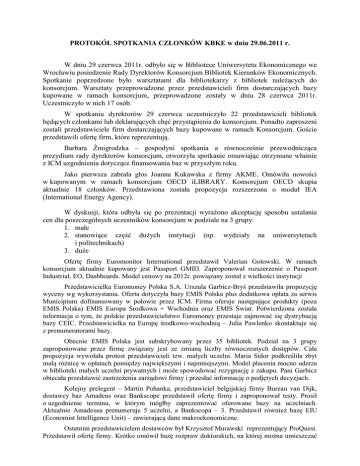 PROTOKÓŁ SPOTKANIA CZŁONKÓW KBKE w dniu 29.06.2011 r. W dniu 29 czerwca 2011r. odbyło się w Bibliotece Uniwersytetu Ekonomicznego we Wrocławiu posiedzenie Rady Dyrektorów Konsorcjum Bibliotek Kierunków Ekonomicznych. Spotkanie poprzedzone było warsztatami dla bibliotekarzy z bibliotek należących do konsorcjum. Warsztaty przeprowadzone przez przedstawicieli firm dostarczających bazy kupowane w ramach konsorcjum, przeprowadzone zostały w dniu 28 czerwca 2011r. Uczestniczyło w nich 17 osób. W spotkaniu dyrektorów 29 czerwca uczestniczyło 22 przedstawicieli bibliotek będących członkami lub deklarujących chęć przystąpienia do konsorcjum. Ponadto zaproszeni zostali przedstawiciele firm dostarczających bazy kupowane w ramach Konsorcjum. Goście przedstawili ofertę firm, które reprezentują. Barbara Żmigrodzka – gospodyni spotkania a równocześnie przewodnicząca prezydium rady dyrektorów konsorcjum, otworzyła spotkanie omawiając otrzymane właśnie z ICM uzgodnienia dotyczące finansowania baz w przyszłym roku. Jako pierwsza zabrała głos Joanna Kukawska z firmy AKME. Omówiła nowości w kupowanym w ramach konsorcjum OECD iLIBRARY. Konsorcjum OECD skupia aktualnie 18 członków. Przedstawiona została propozycja rozszerzona o moduł IEA (International Energy Agency). W dyskusji, która odbyła się po prezentacji wyrażono akceptację sposobu ustalania cen dla poszczególnych uczestników konsorcjum w podziale na 3 grupy: 1. małe 2. stanowiące część dużych instytucji (np. wydziały na uniwersytetach i politechnikach) 3. duże Ofertę firmy Euromonitor International przedstawił Valerian Gotowski. W ramach konsorcjum aktualnie kupowany jest Passport GMID. Zaproponował rozszerzenie o Passport Industrial, EO, Dashboards. Model cenowy na 2012r. powiązany został z wielkości instytucji Przedstawicielka Euromoney Polska S.A. Urszula Garbicz-Bryś przedstawiła propozycję wyceny wg wykorzystania. Oferta dotyczyła bazy EMIS Polska plus dodatkowa opłata za serwis Municipium dofinansowany w połowie przez ICM. Firma oferuje następujące produkty (poza EMIS Polska) EMIS Europa Środkowa + Wschodnia oraz EMIS Świat. Potwierdzona została informacja o tym, że polskie przedstawicielstwo Euromoney przestaje zajmować się dystrybucją bazy CEIC. Przedstawicielka na Europę środkowo-wschodnią – Julia Pawlenko skontaktuje się z prenumeratorami bazy. Obecnie EMIS Polska jest subskrybowany przez 35 bibliotek. Podział na 3 grupy zaproponowane przez firmę związany jest ze zmianą liczby równoczesnych dostępów. Cała propozycja wywołała protest przedstawicieli tzw. małych uczelni. Maria Sidor podkreśliła zbyt małą różnicę w opłatach pomiędzy największymi i najmniejszymi. Model płacenia mocno uderza w biblioteki małych uczelni prywatnych i może spowodować rezygnację z zakupu. Pani Garbicz obiecała przedstawić zastrzeżenia zarządowi firmy i przesłać informację o podjętych decyzjach. Kolejny prelegent – Martin Pohanka, przedstawiciel belgijskiej firmy Bureau van Dijk, dostawcy baz Amadeus oraz Bankscope przedstawił ofertę firmy i zaproponował testy. Prosił o uzgodnienie terminu, w którym mógłby zaprezentować oferowane bazy na uczelniach. Aktualnie Amadeusa prenumeruje 5 uczelni, a Bankscopa – 3. Przedstawił również bazę EIU (Economist Intelligence Unit) – zawierającą dane makroekonomiczne. Ostatnim przedstawicielem dostawców był Krzysztof Murawski reprezentujący ProQuest. Przedstawił ofertę firmy. Krótko omówił bazę rozpraw doktorskich, na której można umieszczać własne prace, Summon – globalny serwis wyszukiwawczy, EBRARY, RefWorks. Zaproponował testy nowych produktów jesienią. Na zakończenie spotkania Anna Osiewalska zwróciła się z apelem do członków konsorcjum do brania udziału w projekcie AFBN. Przyznała, że wypełnianie ankiety jest uciążliwe, ale cel szczytny. Protokołowała Małgorzata Świrad