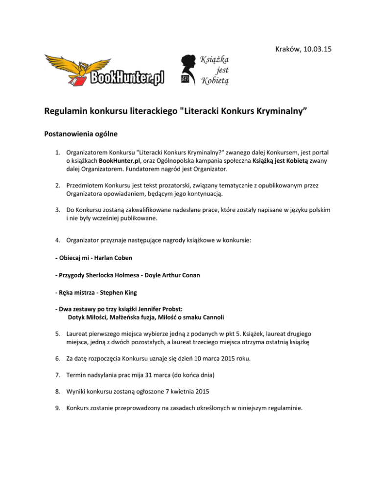 Kraków, 10.03.15 Regulamin konkursu literackiego "Literacki Konkurs Kryminalny” Postanowienia ogólne 1. Organizatorem Konkursu "Literacki Konkurs Kryminalny?" zwanego dalej Konkursem, jest portal o książkach BookHunter.pl, oraz Ogólnopolska kampania społeczna Książką jest Kobietą zwany dalej Organizatorem. Fundatorem nagród jest Organizator. 2. Przedmiotem Konkursu jest tekst prozatorski, związany tematycznie z opublikowanym przez Organizatora opowiadaniem, będącym jego kontynuacją. 3. Do Konkursu zostaną zakwalifikowane nadesłane prace, które zostały napisane w języku polskim i nie były wcześniej publikowane. 4. Organizator przyznaje następujące nagrody książkowe w konkursie: - Obiecaj mi - Harlan Coben - Przygody Sherlocka Holmesa - Doyle Arthur Conan - Ręka mistrza - Stephen King - Dwa zestawy po trzy książki Jennifer Probst: Dotyk Miłości, Małżeńska fuzja, Miłość o smaku Cannoli 5. Laureat pierwszego miejsca wybierze jedną z podanych w pkt 5. Książek, laureat drugiego miejsca, jedną z dwóch pozostałych, a laureat trzeciego miejsca otrzyma ostatnią książkę 6. Za datę rozpoczęcia Konkursu uznaje się dzień 10 marca 2015 roku. 7. Termin nadsyłania prac mija 31 marca (do końca dnia) 8. Wyniki konkursu zostaną ogłoszone 7 kwietnia 2015 9. Konkurs zostanie przeprowadzony na zasadach określonych w niniejszym regulaminie. Cele konkursu: Cele konkursu to: - zachęcanie uczestników do zaprezentowania swoich umiejętności literackich - rozwijanie języka, wyobraźni, kreatywności - promocja literatury i czytelnictwa Warunki przystąpienia do Konkursu: 1. Konkurs jest przeznaczony dla wszystkich osób, bez limitów wiekowych 2. Na Konkurs można zgłosić, niepublikowane dotychczas, teksty prozatorskie w języku polskim (opowiadanie), które stanowią zamkniętą, spójną całość. Fragmenty obszerniejszych utworów (powieści, sztuki teatralne, wierszy i teksty o innej niż podana tematyce nie spełniają kryteriów konkursu. 3. Minimalna objętość tekstu to 250 słów, maksymalna 750 słów. 4. Tekst zgłaszany do Konkursu musi nawiązywać do fragmentu opublikowanego na stronie www organizatora: http://www.bookhunter.pl/konkurs/3/kryminalny_konkurs_literacki.html 5. Osoba zgłaszająca tekst na Konkurs musi być jego jedynym autorem. Jedna osoba może zgłosić na Konkurs jeden tekst. 6. Zgłoszenia do Konkursu można dokonać przesyłając tekst konkursowy w plikach tekstowych (txt), obsłuchiwanych przez MSoffice, OPENoffice lub PDF, jako załącznik do wiadomości e-mail, przesłanej na adres e-mail organizatora: [email protected] z dopiskiem „Literacki konkurs kryminalny” 7. Praca powinna być podpisana imieniem, nazwiskiem, i adresem email autora. 8. Uczestnik może zastrzec podanie swoich danych osobowych do publicznej wiadomości i wyrazić zgodę na publikację jego utworu pod pseudonimem (podanym w nadesłanej pracy). 9. Z udziału w Konkursie wyklucza się utwory, których autorami są członkowie Komisji Konkursowej oraz osoby będące przedstawicielami i współpracownikami Organizatora. Wyłonienie laureatów 1. Prace ocenia Komisja Konkursowa, składająca się z trzech osób, będącymi w zespole portalu bookhunter.pl i modaija.pl/kjk/ 2. Komisja konkursowa, po zapoznaniu się z tekstami nadesłanymi do Konkursu, wyłoni pięcioro laureatów, 3. Komisja Konkursowa zobowiązana jest do zachowania poufności oraz bezstronności podczas oceny poszczególnych tekstów. 4. Prace będą oceniane pod względem wartości literackiej, oryginalności, kreatywności, pomysłowości, a także pod względem językowym i stylistycznym. 5. Decyzje Komisji Konkursowej są ostateczne i nie przysługuje od nich odwołanie. 6. Laureaci Konkursu zostaną powiadomieni o wygranej drogą mailową. Nagrody zostaną przesłane pocztą na adres zamieszkania podany przez laureatów, po ogłoszeniu wyników. 7. Lista laureatów zostanie opublikowana na stronie głównej portalu bookhunter.pl. oraz modaija.pl/kjk/ 8. Zwycięskie teksty zostaną opublikowane na portalu w dziale Konkursów, oraz na stronie głównej portalu www.bookhunter.pl oraz modaija.pl/kjk/ Prawa autorskie Wszelkie prawa autorskie i majątkowe pozostają własnością autorów, a Organizator Konkursu nie będzie rościł sobie do nich żadnych praw. Postanowienia końcowe 1. Organizator Konkursu nie będzie dokonywać weryfikacji danych wskazanych w zgłoszeniach. Jednoczenie Organizator nie odpowiada za nieprawidłowe dane wskazane w zgłoszeniach. 2. Przesłanie zgłoszenia konkursowego jest jednoznaczne z pełną akceptacją niniejszego regulaminu. 3. Organizator ma prawo do natychmiastowego wykluczenia z Konkursu uczestnika, który postępował niezgodnie z niniejszym Regulaminem lub do wezwania do uzupełnienia braków formalnych. 4. Nadsyłając pracę na Konkurs, Autor zgadza się na niezbędne poprawki redaktorskie w tekście oraz jej późniejsze upublicznienie przez Organizatora na jego stronie internetowej www.bookhunter.pl oraz modaija/kjk/ 5. Organizator może zmodyfikować zasady Konkursu zawarte w niniejszym Regulaminie, przerwać, przedłużyć termin rozstrzygnięcia, odwołać Konkurs lub zakończyć Konkurs bez wyboru jakiegokolwiek laureata po publicznym ogłoszeniu przyczyny. 6. Niniejszy Regulamin jest jedynym dokumentem określającym zasady Konkursu. 7. W sytuacjach nieuregulowanych niniejszym Regulaminem lub w wypadku konieczności interpretacji postanowień niniejszego Regulaminu rozstrzygnięcie należy do wyłącznej kompetencji Organizatora.
