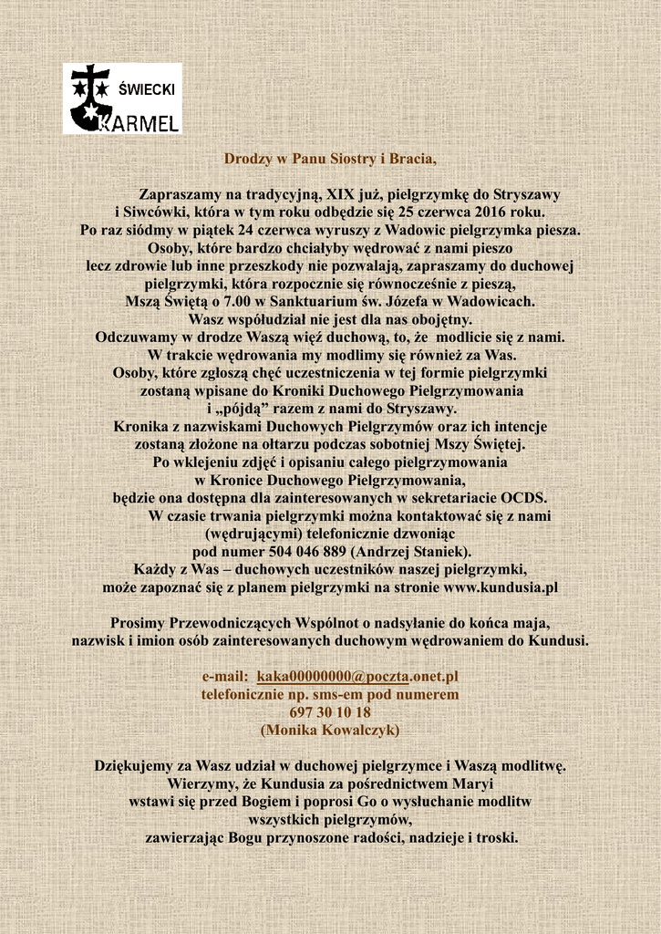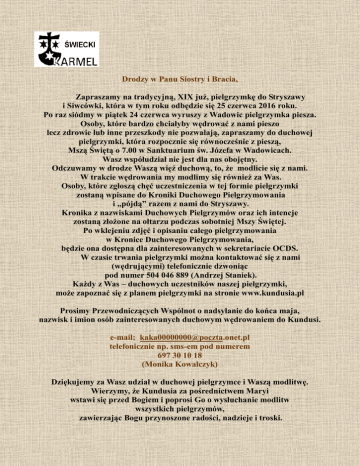 Drodzy w Panu Siostry i Bracia, Zapraszamy na tradycyjną, XIX już, pielgrzymkę do Stryszawy i Siwcówki, która w tym roku odbędzie się 25 czerwca 2016 roku. Po raz siódmy w piątek 24 czerwca wyruszy z Wadowic pielgrzymka piesza. Osoby, które bardzo chciałyby wędrować z nami pieszo lecz zdrowie lub inne przeszkody nie pozwalają, zapraszamy do duchowej pielgrzymki, która rozpocznie się równocześnie z pieszą, Mszą Świętą o 7.00 w Sanktuarium św. Józefa w Wadowicach. Wasz współudział nie jest dla nas obojętny. Odczuwamy w drodze Waszą więź duchową, to, że modlicie się z nami. W trakcie wędrowania my modlimy się również za Was. Osoby, które zgłoszą chęć uczestniczenia w tej formie pielgrzymki zostaną wpisane do Kroniki Duchowego Pielgrzymowania i „pójdą” razem z nami do Stryszawy. Kronika z nazwiskami Duchowych Pielgrzymów oraz ich intencje zostaną złożone na ołtarzu podczas sobotniej Mszy Świętej. Po wklejeniu zdjęć i opisaniu całego pielgrzymowania w Kronice Duchowego Pielgrzymowania, będzie ona dostępna dla zainteresowanych w sekretariacie OCDS. W czasie trwania pielgrzymki można kontaktować się z nami (wędrującymi) telefonicznie dzwoniąc pod numer 504 046 889 (Andrzej Staniek). Każdy z Was – duchowych uczestników naszej pielgrzymki, może zapoznać się z planem pielgrzymki na stronie www.kundusia.pl Prosimy Przewodniczących Wspólnot o nadsyłanie do końca maja, nazwisk i imion osób zainteresowanych duchowym wędrowaniem do Kundusi. e-mail: [email protected] telefonicznie np. sms-em pod numerem 697 30 10 18 (Monika Kowalczyk) Dziękujemy za Wasz udział w duchowej pielgrzymce i Waszą modlitwę. Wierzymy, że Kundusia za pośrednictwem Maryi wstawi się przed Bogiem i poprosi Go o wysłuchanie modlitw wszystkich pielgrzymów, zawierzając Bogu przynoszone radości, nadzieje i troski.