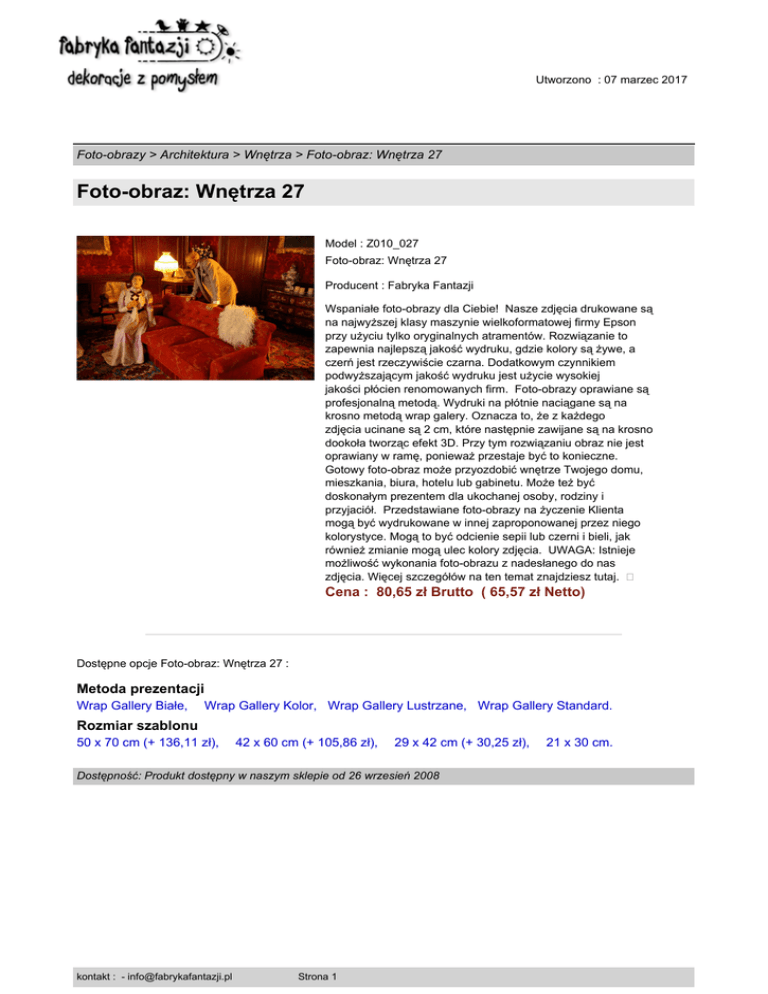 Utworzono : 07 marzec 2017 Foto-obrazy > Architektura > Wnętrza > Foto-obraz: Wnętrza 27 Foto-obraz: Wnętrza 27 Model : Z010_027 Foto-obraz: Wnętrza 27 Producent : Fabryka Fantazji Wspaniałe foto-obrazy dla Ciebie! Nasze zdjęcia drukowane są na najwyższej klasy maszynie wielkoformatowej firmy Epson przy użyciu tylko oryginalnych atramentów. Rozwiązanie to zapewnia najlepszą jakość wydruku, gdzie kolory są żywe, a czerń jest rzeczywiście czarna. Dodatkowym czynnikiem podwyższającym jakość wydruku jest użycie wysokiej jakości płócien renomowanych firm. Foto-obrazy oprawiane są profesjonalną metodą. Wydruki na płótnie naciągane są na krosno metodą wrap galery. Oznacza to, że z każdego zdjęcia ucinane są 2 cm, które następnie zawijane są na krosno dookoła tworząc efekt 3D. Przy tym rozwiązaniu obraz nie jest oprawiany w ramę, ponieważ przestaje być to konieczne. Gotowy foto-obraz może przyozdobić wnętrze Twojego domu, mieszkania, biura, hotelu lub gabinetu. Może też być doskonałym prezentem dla ukochanej osoby, rodziny i przyjaciół. Przedstawiane foto-obrazy na życzenie Klienta mogą być wydrukowane w innej zaproponowanej przez niego kolorystyce. Mogą to być odcienie sepii lub czerni i bieli, jak również zmianie mogą ulec kolory zdjęcia. UWAGA: Istnieje możliwość wykonania foto-obrazu z nadesłanego do nas zdjęcia. Więcej szczegółów na ten temat znajdziesz tutaj. � Cena : 80,65 zł Brutto ( 65,57 zł Netto) Dostępne opcje Foto-obraz: Wnętrza 27 : Metoda prezentacji Wrap Gallery Białe, Wrap Gallery Kolor, Wrap Gallery Lustrzane, Wrap Gallery Standard. Rozmiar szablonu 50 x 70 cm (+ 136,11 zł), 42 x 60 cm (+ 105,86 zł), 29 x 42 cm (+ 30,25 zł), Dostępność: Produkt dostępny w naszym sklepie od 26 wrzesień 2008 kontakt : - [email protected] Strona 1 21 x 30 cm.