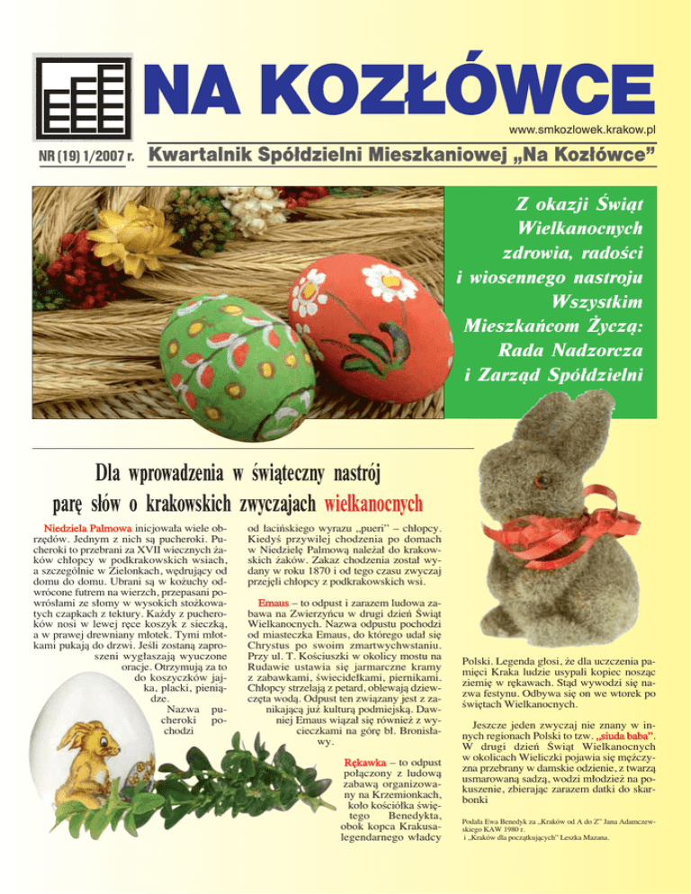 NA KOZŁÓWCE www.smkozlowek.krakow.pl NR (19) 1/2007 r. Kwartalnik Spółdzielni Mieszkaniowej „Na Kozłówce” Z okazji Świąt Wielkanocnych zdrowia, radości i wiosennego nastroju Wszystkim Mieszkańcom Życzą: Rada Nadzorcza i Zarząd Spółdzielni Dla wprowadzenia w świąteczny nastrój parę słów o krakowskich zwyczajach wielkanocnych Niedziela Palmowa inicjowa∏a wiele obrz´dów. Jednym z nich sà pucheroki. Pucheroki to przebrani za XVII wiecznych ˝aków ch∏opcy w podkrakowskich wsiach, a szczególnie w Zielonkach, w´drujàcy od domu do domu. Ubrani sà w ko˝uchy odwrócone futrem na wierzch, przepasani powrós∏ami ze s∏omy w wysokich sto˝kowatych czapkach z tektury. Ka˝dy z pucheroków nosi w lewej r´ce koszyk z sieczkà, a w prawej drewniany m∏otek. Tymi m∏otkami pukajà do drzwi. JeÊli zostanà zaproszeni wyg∏aszajà wyuczone oracje. Otrzymujà za to do koszyczków jajka, placki, pieniàdze. Nazwa pucheroki pochodzi od ∏aciƒskiego wyrazu „pueri” – ch∏opcy. KiedyÊ przywilej chodzenia po domach w Niedziel´ Palmowà nale˝a∏ do krakowskich ˝aków. Zakaz chodzenia zosta∏ wydany w roku 1870 i od tego czasu zwyczaj przej´li ch∏opcy z podkrakowskich wsi. Emaus – to odpust i zarazem ludowa zabawa na Zwierzyƒcu w drugi dzieƒ Âwiàt Wielkanocnych. Nazwa odpustu pochodzi od miasteczka Emaus, do którego uda∏ si´ Chrystus po swoim zmartwychwstaniu. Przy ul. T. KoÊciuszki w okolicy mostu na Rudawie ustawia si´ jarmarczne kramy z zabawkami, Êwiecide∏kami, piernikami. Ch∏opcy strzelajà z petard, oblewajà dziewcz´ta wodà. Odpust ten zwiàzany jest z zanikajàcà ju˝ kulturà podmiejskà. Dawniej Emaus wiàza∏ si´ równie˝ z wycieczkami na gór´ b∏. Bronis∏awy. R´kawka – to odpust po∏àczony z ludowà zabawà organizowany na Krzemionkach, ko∏o koÊció∏ka Êwi´tego Benedykta, obok kopca Krakusalegendarnego w∏adcy Polski. Legenda g∏osi, ˝e dla uczczenia pami´ci Kraka ludzie usypali kopiec noszàc ziemi´ w r´kawach. Stàd wywodzi si´ nazwa festynu. Odbywa si´ on we wtorek po Êwi´tach Wielkanocnych. Jeszcze jeden zwyczaj nie znany w innych regionach Polski to tzw. „siuda baba”. W drugi dzieƒ Âwiàt Wielkanocnych w okolicach Wieliczki pojawia si´ m´˝czyzna przebrany w damskie odzienie, z twarzà usmarowanà sadzà, wodzi m∏odzie˝ na pokuszenie, zbierajàc zarazem datki do skarbonki Poda∏a Ewa Benedyk za „Kraków od A do Z” Jana Adamczewskiego KAW 1980 r. i „Kraków dla poczàtkujàcych” Leszka Mazana. Kwartalnik Rady Nadzorczej i Zarządu Spółdzielni Rozliczenie kosztów centralnego ogrzewania W związku z licznymi pytaniami mieszkańców w sprawie sposobu rozliczania centralnego ogrzewania w mieszkaniach w zasobach Spółdzielni informujemy, że jest ono realizowane w oparciu o Regulamin rozliczania kosztów energii cieplnej. Podstawą rozliczenia poszczególnych mieszkań są podzielniki kosztów, natomiast w lokalach nie opomiarowanych rozliczenie dokonywane jest na podstawie powierzchni mieszkań. Pierwszym krokiem w rozliczeniu jest ustalenie sumy kosztów centralnego ogrzewania poniesionych na dany blok w rozbiciu, na część stałą i zmienną. Część stała rozliczana jest wg powierzchni poszczególnych mieszkań, część zmienna wg ilości jednostek wskazanych przez podzielniki kosztów. Jednostki zarejestrowane przez podzielnik umieszczony na danym grzejniku są korygowane przez współczynnik UF – uwzględniający wielkość i wydajność grzejnika oraz współczynnik LAF – uwzględniający położenie mieszkania w bryle budynku. Suma kosztów zmiennych w całym bloku jest dzielona przez sumaryczną ilość jednostek w całym bloku i w ten sposób określany jest koszt jednej jednostki. Wielkość ta jest następnie mnożona przez sumę jednostek w danym mieszkaniu i w ten sposób określa się koszty zmienne przypadające do zapłaty na dane mieszkanie. Koszty te, po zsumowaniu z kosztami stałymi i kwotą za rozliczenie ciepła dają całkowity koszt, jaki ponosi Z wiosenną pogodą ruszyły prace na osiedlowych zieleńcach i trawnikach. Zwracamy się z prośbą o nie wyrzucanie przez okna pokarmu dla ptaków. Częstym widokiem na trawnikach są resztki kuchenne w postaci ziemniaków, makaronów, czy dużych kawałków chleba. Takim odpadkami nie nakarmimy ptaków, a jedynie zanieczyścimy swoje otoczenie. Przy wysokiej temperaturze powietrza odpadki szybko psują się, cuchną, zwabiają roje much i stają się zagrożeniem dla zdrowia. Poza tym psują estetyczny wygląd zieleńców. Przypominamy mieszkańcom, że podobne zachowanie jest niezgodne z regulaminem obowiązującym wszystkich mieszkańców naszego osiedla, a Straż Miejska jest zobowiązana do karania mandatami za zaśmiecanie otoczenia. Jeśli chcemy dokarmiać ptaki należy robić to w wyznaczonych miejscach. (eb) mieszkaniec na potrzeby centralnego ogrzewania. Jeżeli wpłacana przez mieszkańca zaliczka jest wyższa niż całkowite koszty centralnego ogrzewania przypadające na jego mieszkanie wtedy następuje zwrot nadpłaty przez Spółdzielnię. W przeciwnym wypadku mieszkaniec zobowiązany jest do dopłaty. Szczegółowe indywidualne rozliczenie otrzymują Państwo po każdym okresie rozliczeniowym wraz z pismem przewodnim. Pragniemy jednocześnie zaznaczyć, że zużycie ciepła w danym pomieszczeniu i mieszkaniu zależy od wielu czynników. Najważniejszy to temperatura grzejnika i czas ogrzewania, a na to z kolei mają wpływ: szczelność stolarki okiennej, sposób wietrzenia, stopień wychłodzenia mieszkania. Zachęcamy wszystkich do oszczędnego gospodarowania energią cieplną. Jednocześnie jednak pragniemy poinformować o negatywnych skutkach nadmiernego oszczędzania energii cieplnej, którymi są: zawilgocenie i zagrzybienie mieszkań, problemy z funkcjonowaniem wentylacji, co z kolei powoduje pogorszenie warunków zdrowotnych mieszkańców. Ma także niszczący wpływ na