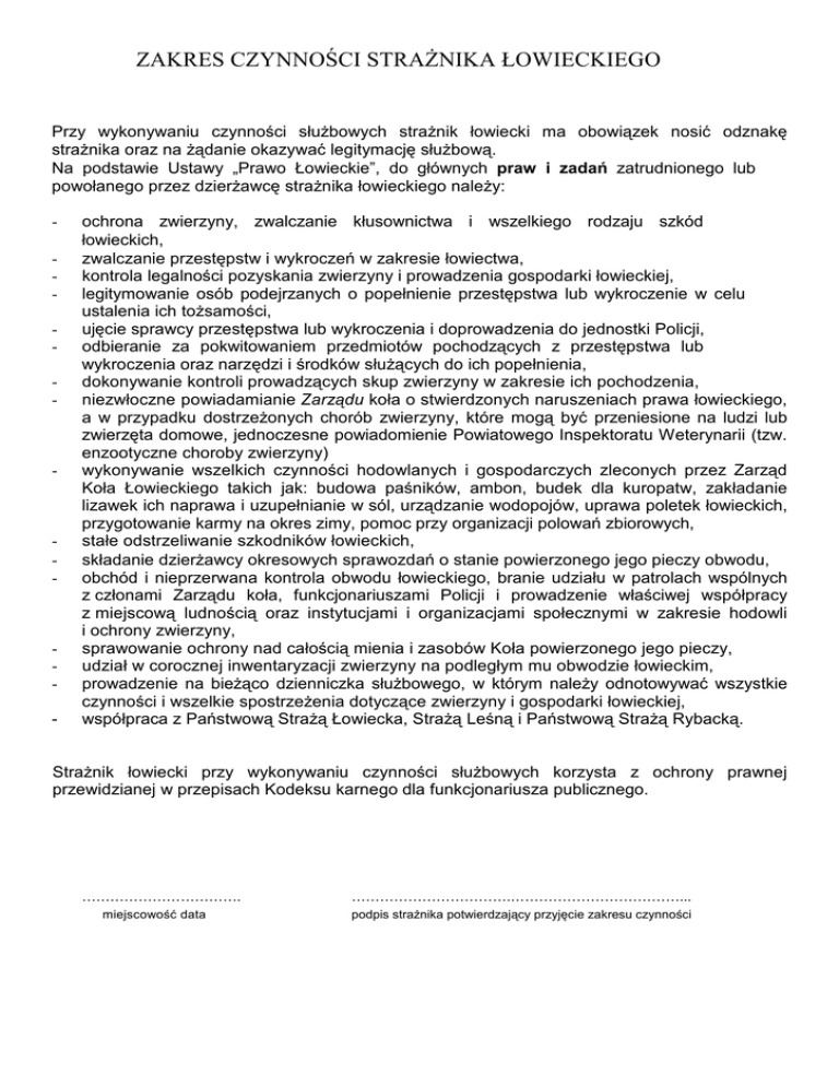 ZAKRES CZYNNOŚCI STRAśNIKA ŁOWIECKIEGO Przy wykonywaniu czynności słuŜbowych straŜnik łowiecki ma obowiązek nosić odznakę straŜnika oraz na Ŝądanie okazywać legitymację słuŜbową. Na podstawie Ustawy „Prawo Łowieckie”, do głównych praw i zadań zatrudnionego lub powołanego przez dzierŜawcę straŜnika łowieckiego naleŜy: - - - - ochrona zwierzyny, zwalczanie kłusownictwa i wszelkiego rodzaju szkód łowieckich, zwalczanie przestępstw i wykroczeń w zakresie łowiectwa, kontrola legalności pozyskania zwierzyny i prowadzenia gospodarki łowieckiej, legitymowanie osób podejrzanych o popełnienie przestępstwa lub wykroczenie w celu ustalenia ich toŜsamości, ujęcie sprawcy przestępstwa lub wykroczenia i doprowadzenia do jednostki Policji, odbieranie za pokwitowaniem przedmiotów pochodzących z przestępstwa lub wykroczenia oraz narzędzi i środków słuŜących do ich popełnienia, dokonywanie kontroli prowadzących skup zwierzyny w zakresie ich pochodzenia, niezwłoczne powiadamianie Zarządu koła o stwierdzonych naruszeniach prawa łowieckiego, a w przypadku dostrzeŜonych chorób zwierzyny, które mogą być przeniesione na ludzi lub zwierzęta domowe, jednoczesne powiadomienie Powiatowego Inspektoratu Weterynarii (tzw. enzootyczne choroby zwierzyny) wykonywanie wszelkich czynności hodowlanych i gospodarczych zleconych przez Zarząd Koła Łowieckiego takich jak: budowa paśników, ambon, budek dla kuropatw, zakładanie lizawek ich naprawa i uzupełnianie w sól, urządzanie wodopojów, uprawa poletek łowieckich, przygotowanie karmy na okres zimy, pomoc przy organizacji polowań zbiorowych, stałe odstrzeliwanie szkodników łowieckich, składanie dzierŜawcy okresowych sprawozdań o stanie powierzonego jego pieczy obwodu, obchód i nieprzerwana kontrola obwodu łowieckiego, branie udziału w patrolach wspólnych z członami Zarządu koła, funkcjonariuszami Policji i prowadzenie właściwej współpracy z miejscową ludnością oraz instytucjami i organizacjami społecznymi w zakresie hodowli i ochrony zwierzyny, sprawowanie ochrony nad całością mienia i zasobów Koła powierzonego jego pieczy, udział w corocznej inwentaryzacji zwierzyny na podległym mu obwodzie łowieckim, prowadzenie na bieŜąco dzienniczka słuŜbowego, w którym naleŜy odnotowywać wszystkie czynności i wszelkie spostrzeŜenia dotyczące zwierzyny i gospodarki łowieckiej, współpraca z Państwową StraŜą Łowiecka, StraŜą Leśną i Państwową StraŜą Rybacką. StraŜnik łowiecki przy wykonywaniu czynności słuŜbowych korzysta z ochrony prawnej przewidzianej w przepisach Kodeksu karnego dla funkcjonariusza publicznego. ……………………………. miejscowość data …………………………….………………………………... podpis straŜnika potwierdzający przyjęcie zakresu czynności