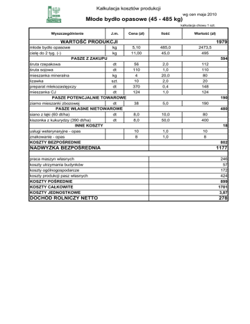 Kalkulacja kosztów produkcji wg cen maja 2010 Młode bydło opasowe (45 - 485 kg) kalkulacja chowu 1 szt. Wyszczególnienie J.m. Cena (zł) Ilość Wartość (zł) 5,10 11,00 485,0 45,0 2473,5 495 WARTOŚĆ PRODUKCJI młode bydło opasowe cielę do 2 tyg. (-) kg kg 1979 PASZE Z ZAKUPU śruta rzepakowa dt śruta sojowa dt mieszanka mineralna kg lizawka szt. preparat mlekozastępczy dt mieszanka CJ dt PASZE POTENCJALNIE TOWAROWE ziarno mieszanki zbozowej dt PASZE WŁASNE NIETOWAROWE siano z łąki (60 dt/ha) dt kiszonka z kukurydzy (390 dt/ha) dt INNE KOSZTY usługi weterynaryjne - opas znakowanie - opas KOSZTY BEZPOŚREDNIE NADWYŻKA BEZPOŚREDNIA 594 56 110 4 10 370 124 2,0 1,0 20,0 2,0 0,4 1,0 112 110 80 20 148 124 190 38 5,0 190 480 8,0 8,0 10,0 50,0 80 400 18 10 8 1,0 1,0 10 8 802 1177 praca maszyn własnych koszty utrzymania budynków koszty ogólnogospodarcze koszty produkcji pasz własnych KOSZTY POŚREDNIE KOSZTY CAŁKOWITE KOSZTY JEDNOSTKOWE 246 57 172 424 899 1701 3,87 DOCHÓD ROLNICZY NETTO 278